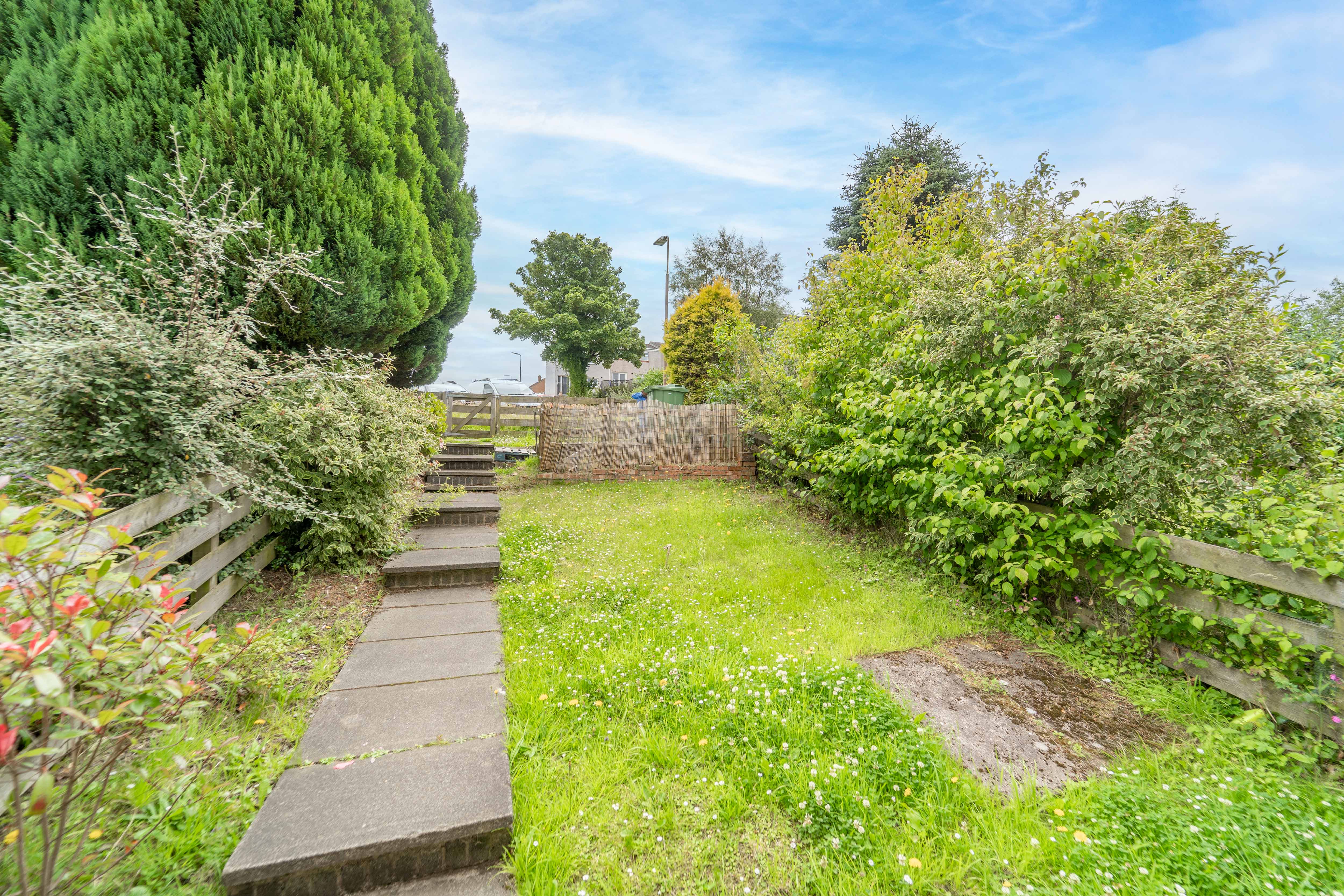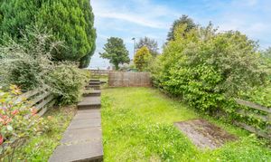 Welcoming you into the garden is a half-height wooden gated fence. A slabbed path takes you past a patio area with space for seating, as well as a patch of well-maintained lawn, down to the front entrance of the property.