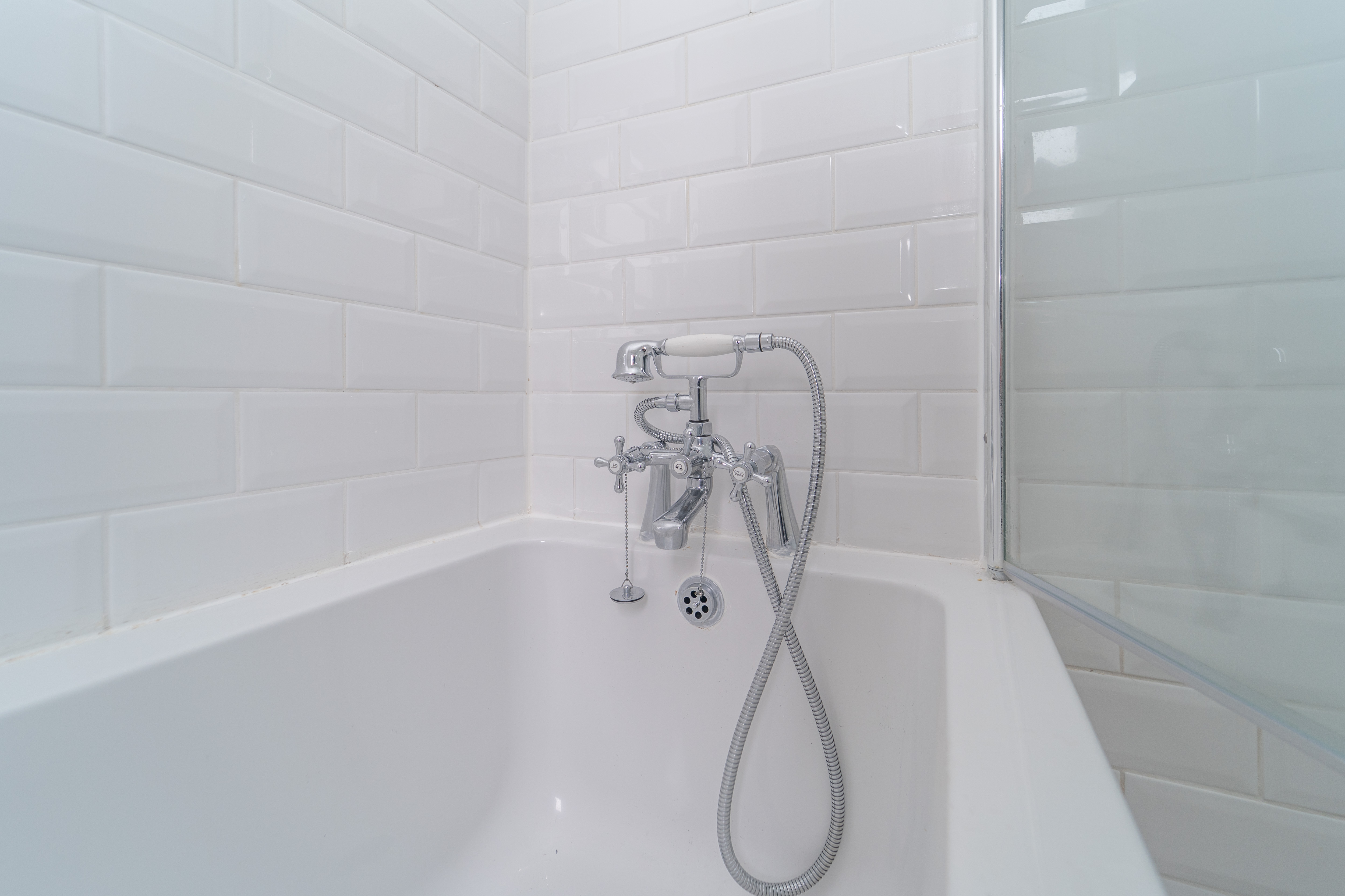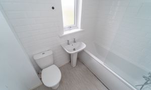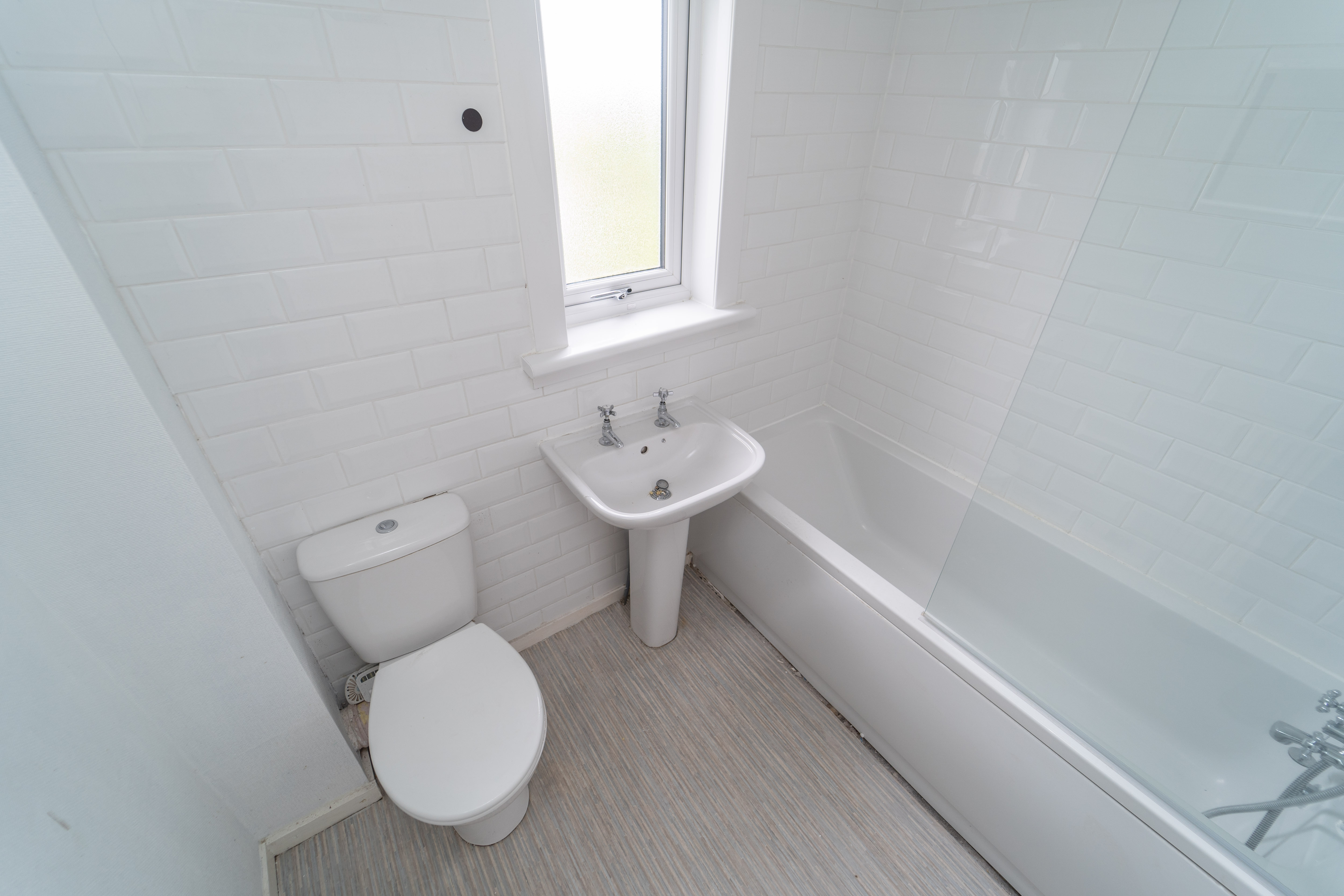 2.185m x 1.676m (07’02” x 05’06”) This walls in this bathroom are part neutral tiled and part neutral anaglypta with neutral tiling to the floor. The white suite comprises of a close coupled toilet, a white pedestal sink and a bath with a glass shower screen and tap-mounted shower, with a riser and bracket above. This room is lit by downlights and a window facing the rear. A mirrored medicine cabinet and a radiator complete the room.