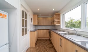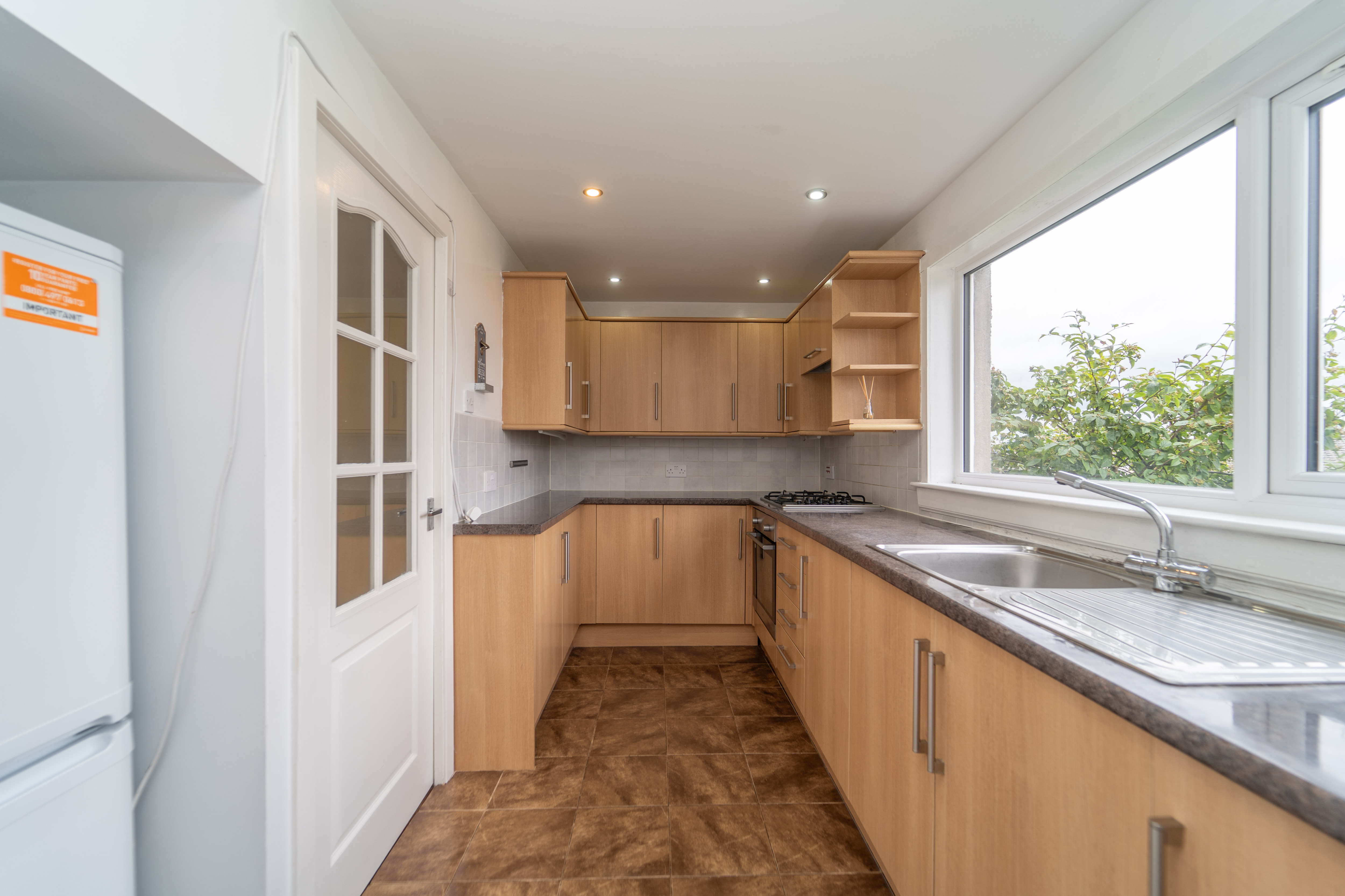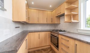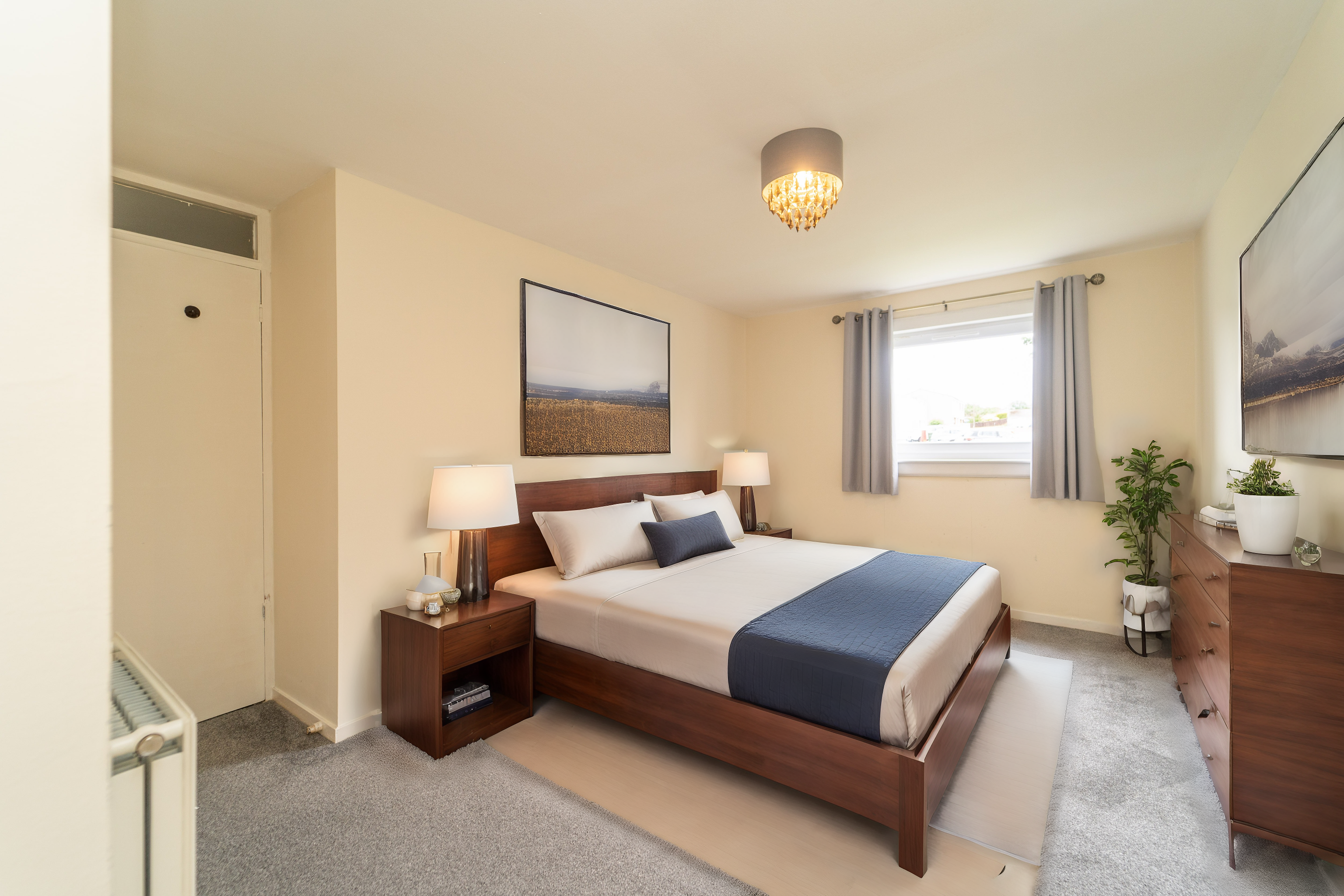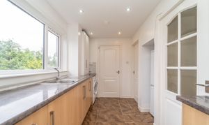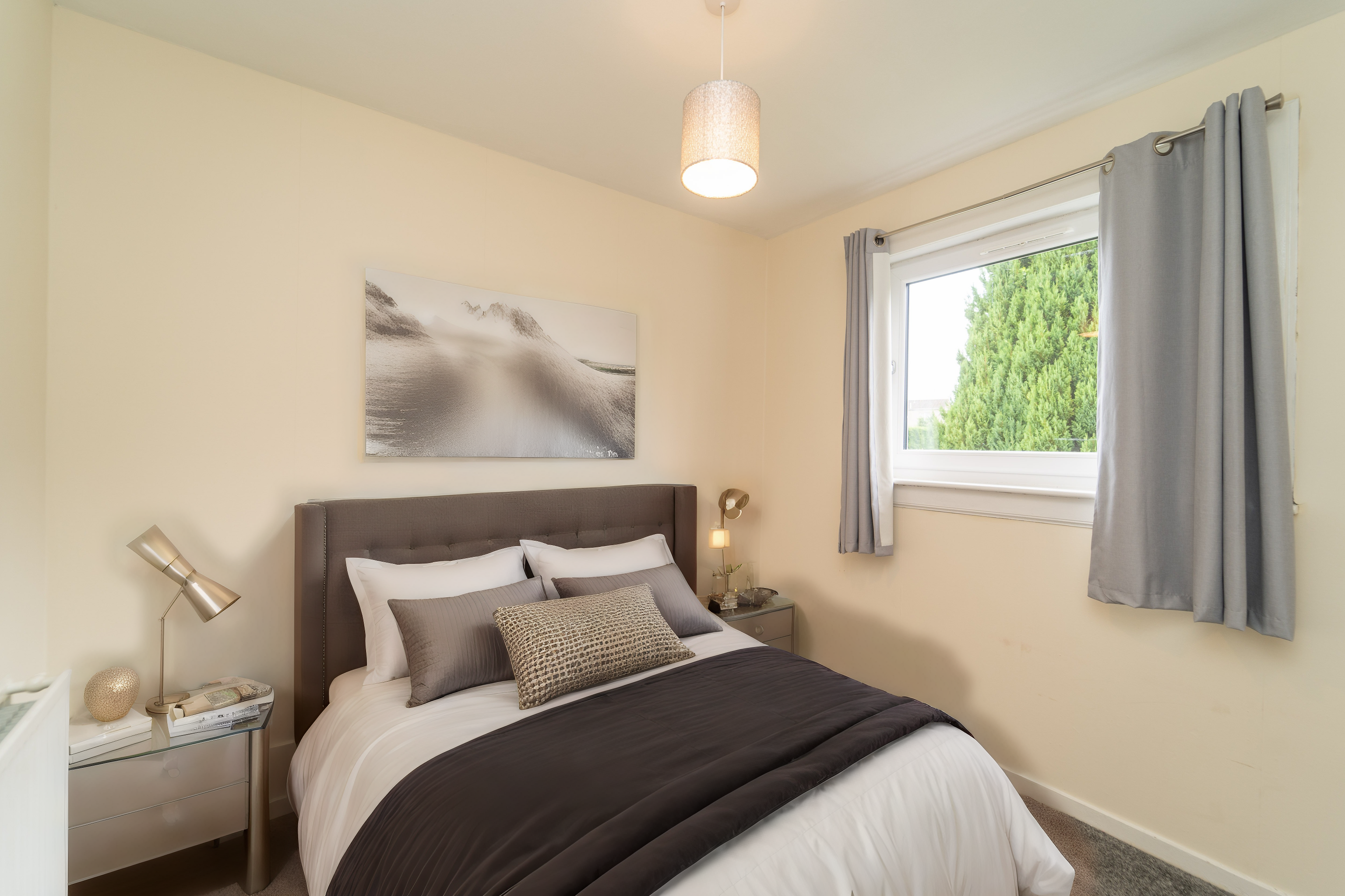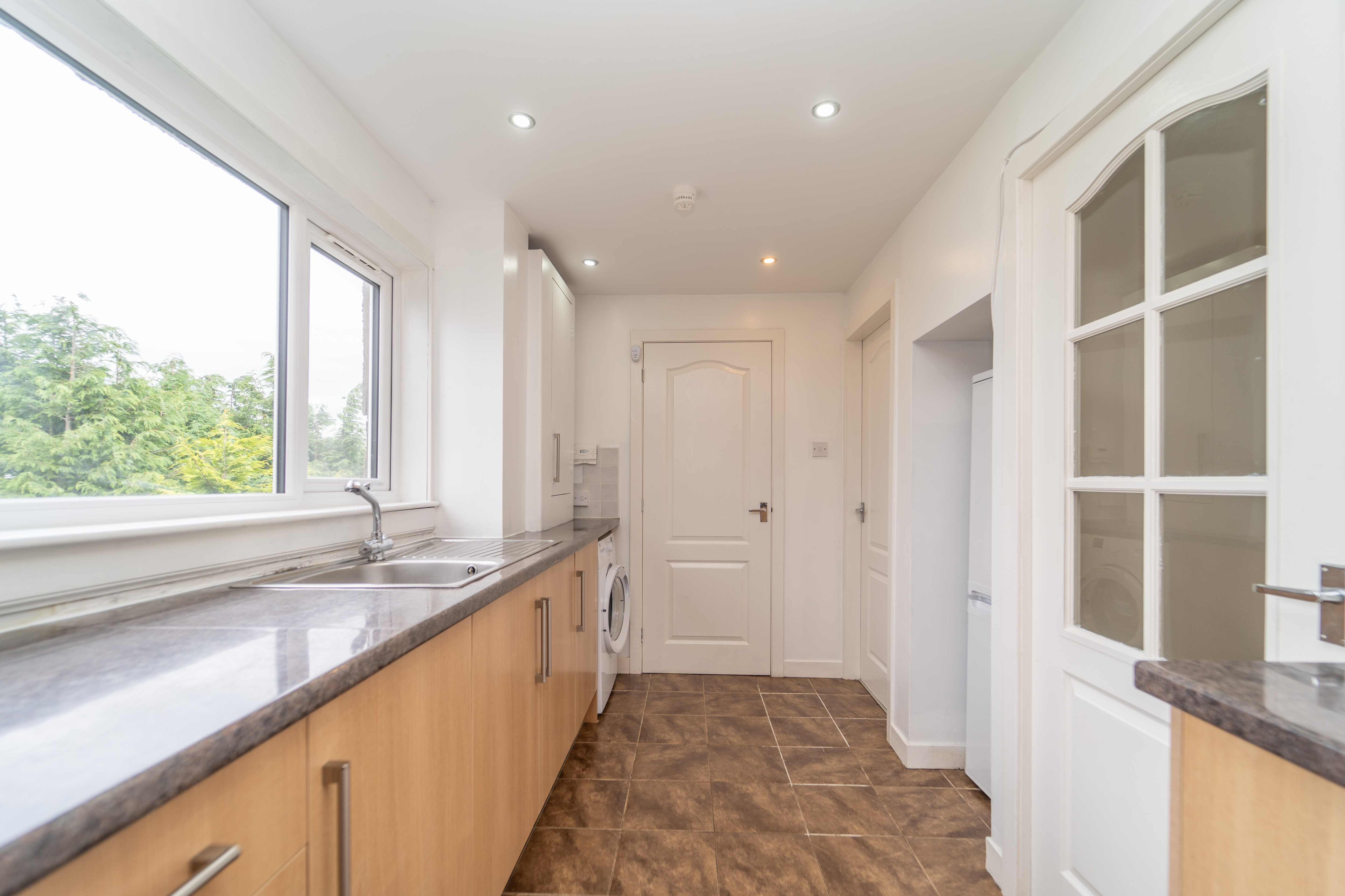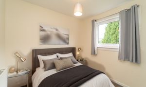 4.459m x 1.924m (14’07” x 06’03”) The kitchen, located to the rear, affords stunning views of the surrounding land, the Forth Road Bridge, and the Queensferry Crossing. Full of needed accessories such as an electric oven with a four-ring gas hob, as well as a stainless-steel sink with a drainer and mixer tap. Decorated with neutral tones to the walls, neutral tiled splashbacks and tile-effect laminate to the floor. A dark laminate work surface contrasts nicely with the wood-effect cabinet frontages. The large window allows in lots of natural light to brighten up the room, with the opportunity to enjoy amazing sunsets. Downlights on the ceiling and wall units brighten the room also, and power points, a radiator, and a storage cupboard are included.