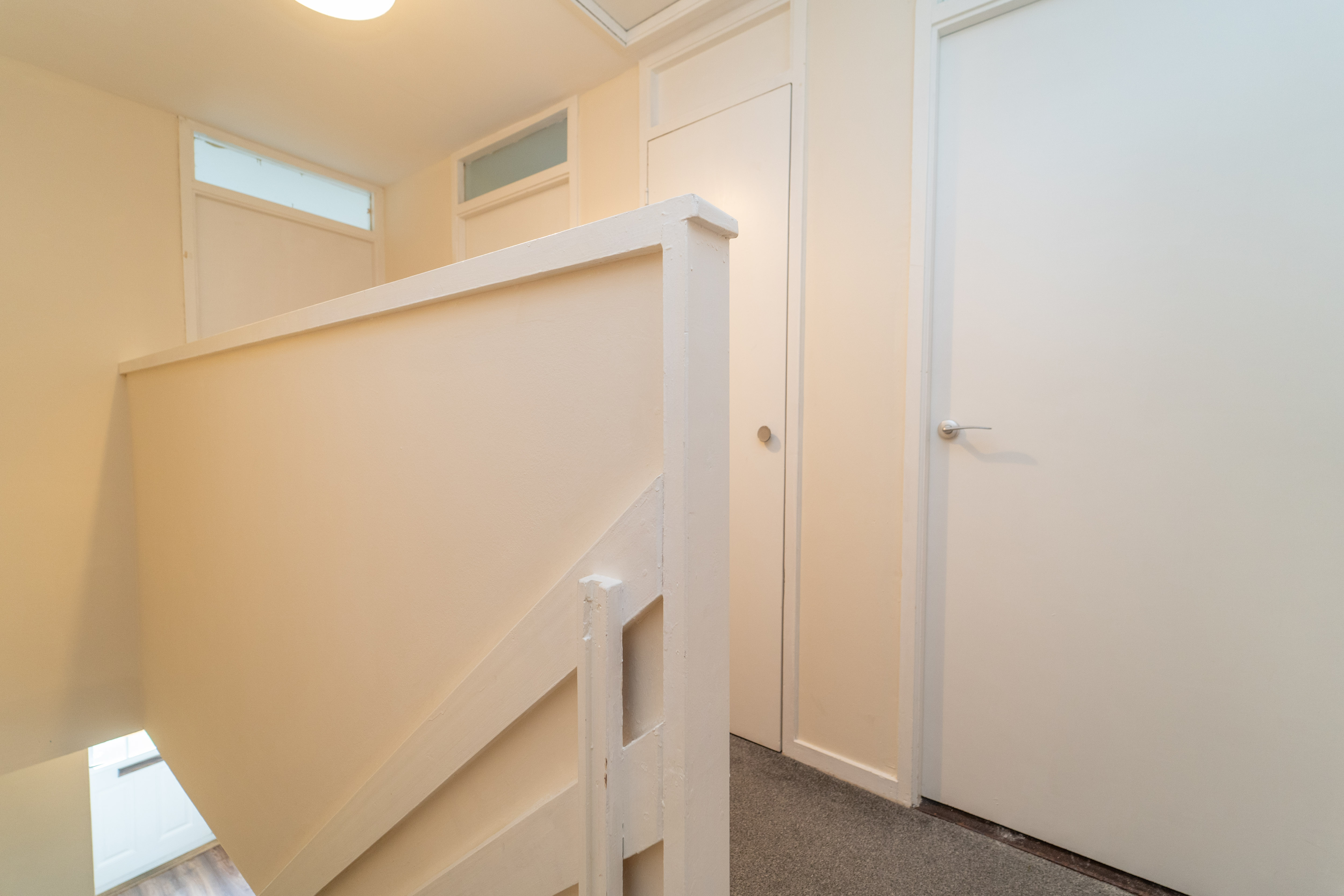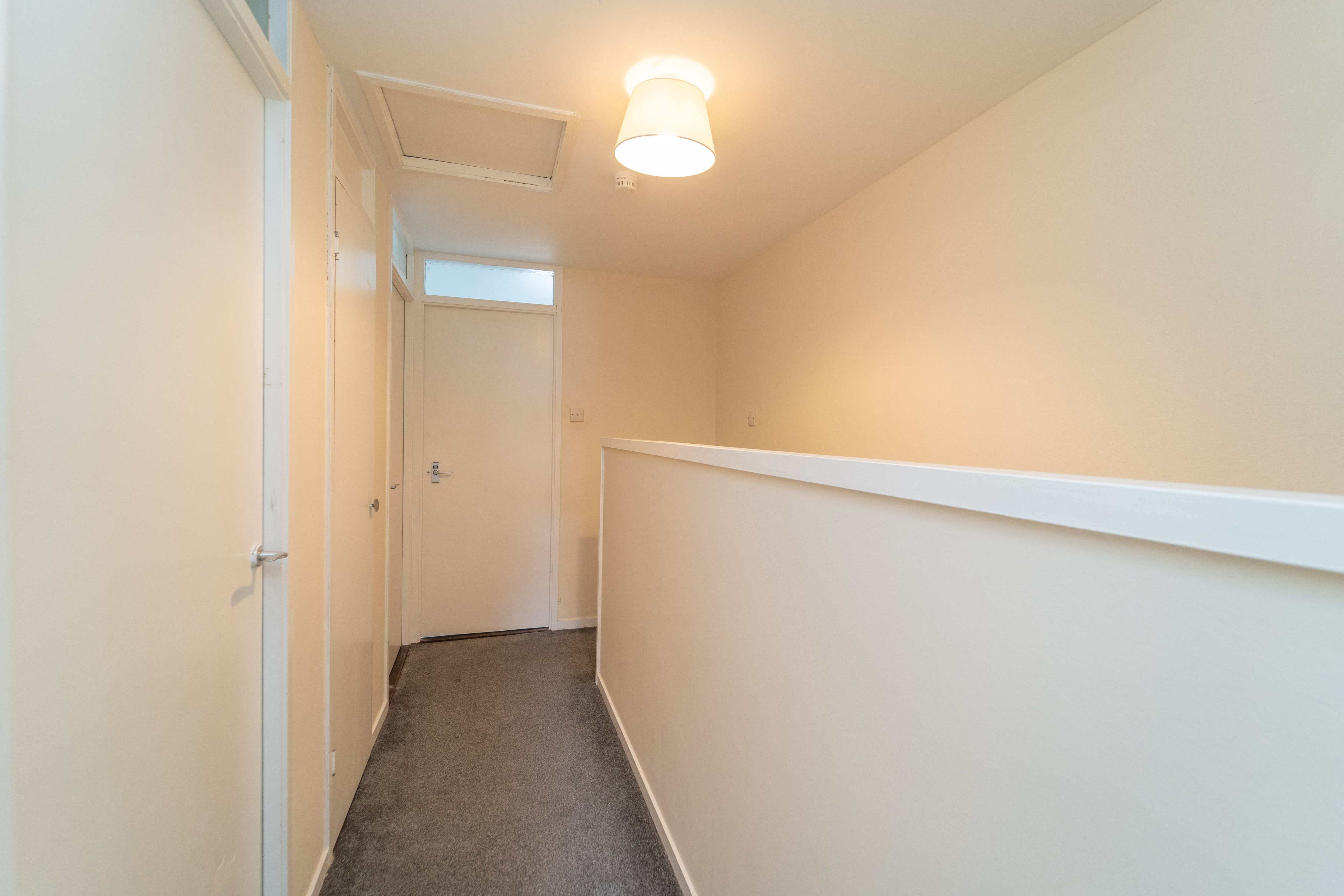The stairs are equipped with wooden handrails, as well as a neutral carpet to the floor. The walls are finished with neutral tones, and the upstairs hallway also provides attic access, a storage cupboard, a singular power point, and a smoke detector.