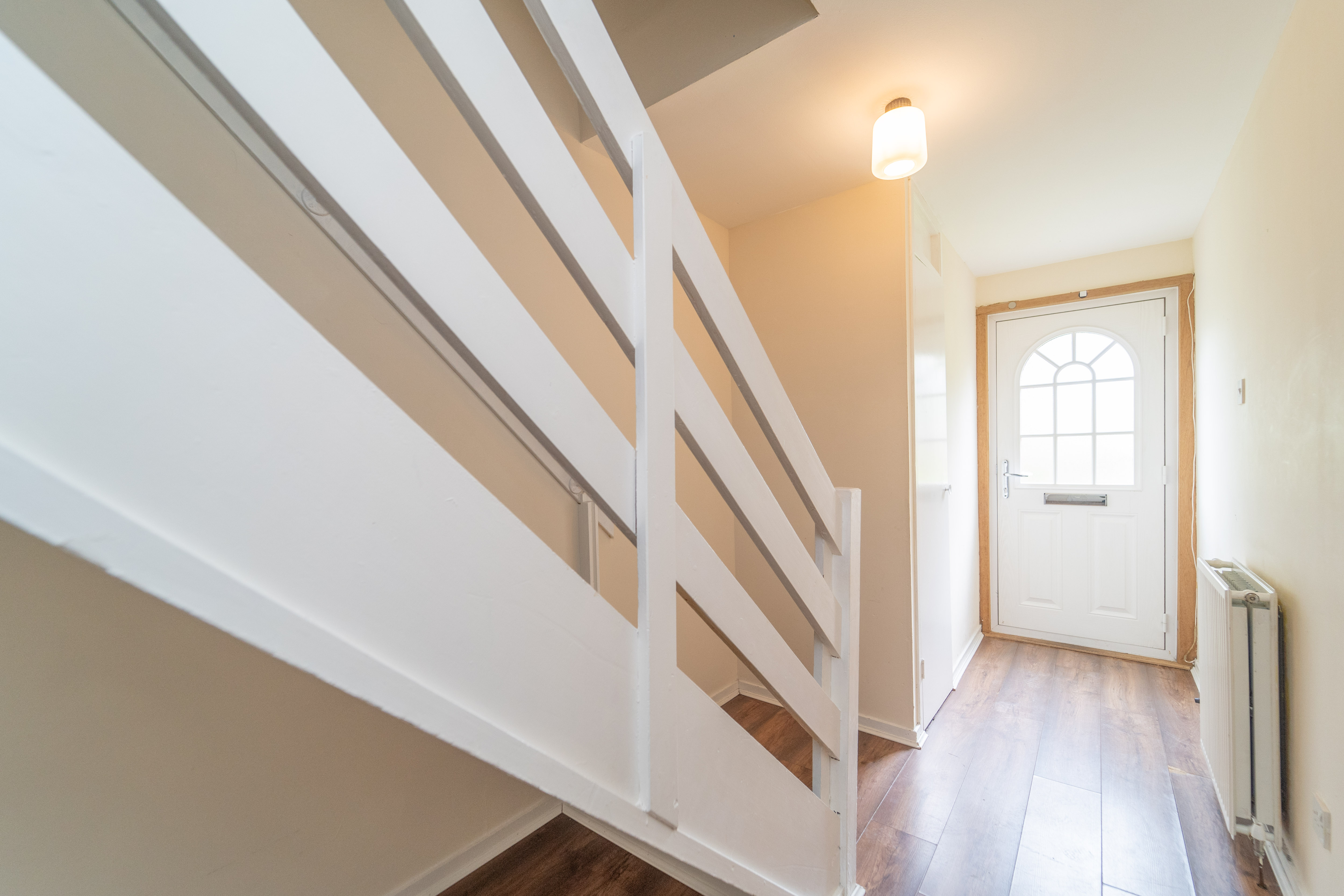 This lovely home begins with a uPVC front door with decorative glazing and walls finished with neutral paint and wood-effect laminate flooring. A large cupboard creates storage, with a radiator, power points, a smoke detector, and a ceiling light completing this area.