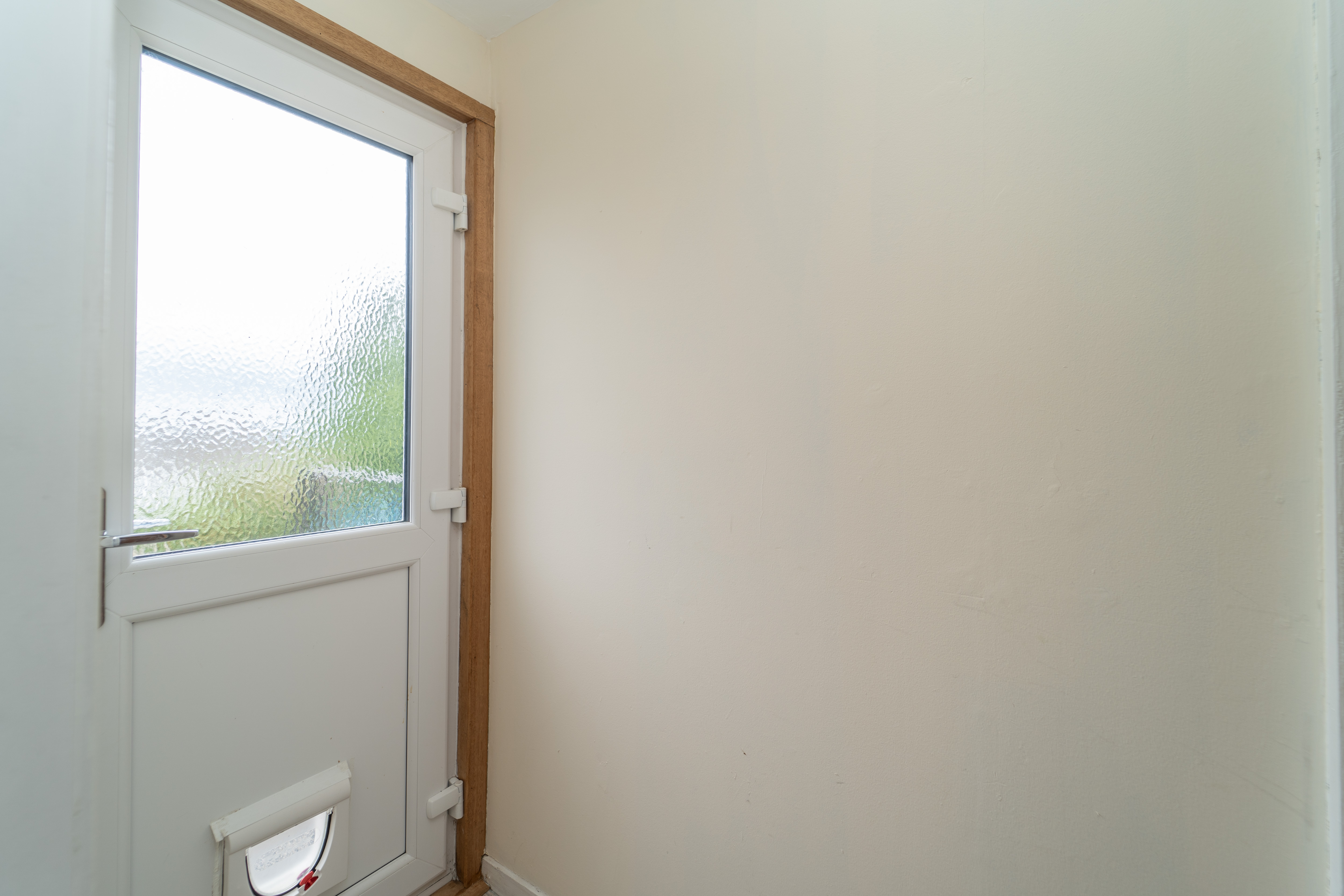 1.596m x 0.895m (05’02” x 02’11”) This handy room features neutral vinyl to the floor and neutral paint to the walls, as well as a spacious storage cupboard. A half-glazed uPVC door allows in some natural light, as well as access to the rear garden. The room is also lit by a ceiling light, and is fitted with some coat hooks.