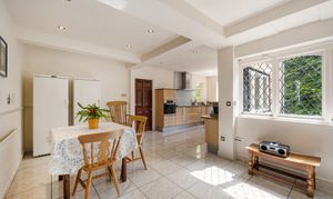 From the study, you’ll also find access to a useful cloakroom with built-in cupboards, a two-piece WC, and a separate shower room with walk-in storage. Return to the hallway, turning left into a modern spot-lit dining kitchen lined with ample wooden cabinetry with complementary work surfaces. Underfoot, glossy floor tiles with contrasting grouting reflect the natural light streaming through wide latticed casements, setting the scene for family gatherings and mealtimes.