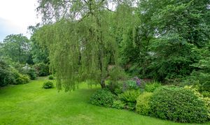 Well-established trees with broad leafy canopies, including a beautiful willow, create a natural screen for the sweeping lawn – providing a home for birds and wildlife and shade for picnics and playing children – while shrub and flower borders break up the lawn into distinct spaces.