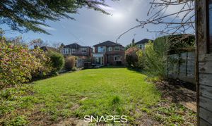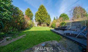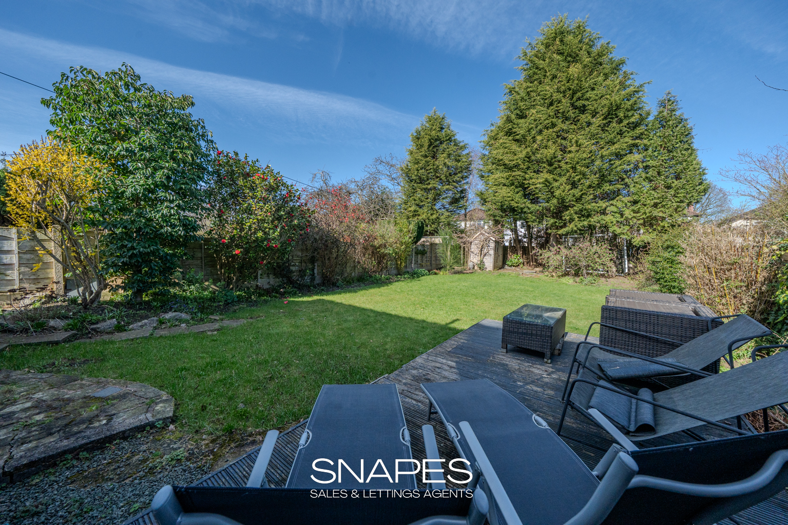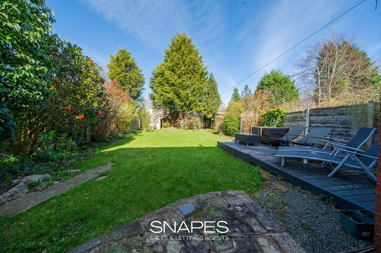 A side gate leads down the left-hand side of the property, providing access to the rear garden. Entry into the home can also be gained from this side space, which opens out onto a substantial rear garden. Here, a good-sized patio area adjoins the house, leading onto a decking area - ideal for outdoor entertaining and relaxation. Beyond this, a large lawn extends towards the rear boundary, where a mature backdrop of trees enhances both privacy and outlook.