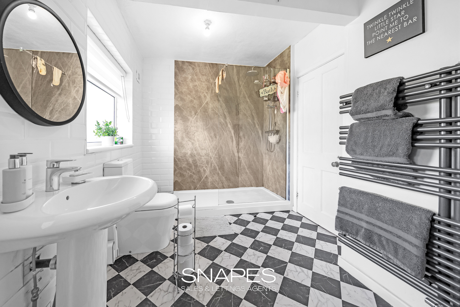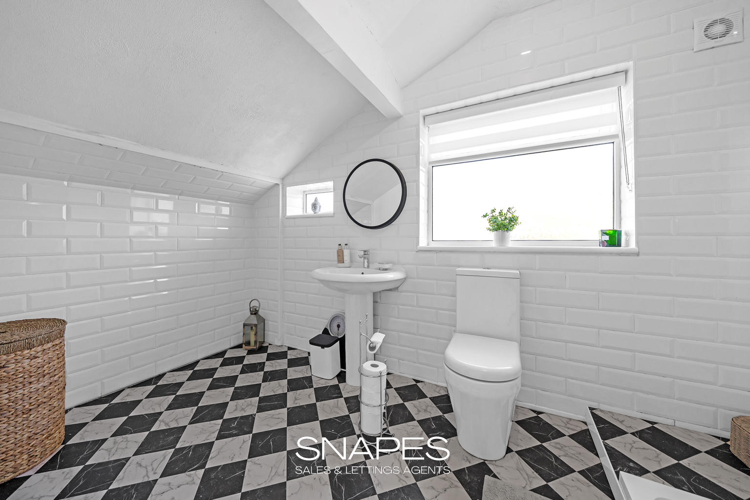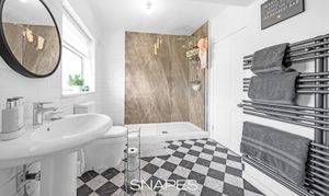 The family bathroom is particularly spacious and well-appointed, comprising a wash hand basin, low-level WC, and a walk-in double shower. The suite blends modern styling with character features and is enhanced by two windows (see photos).