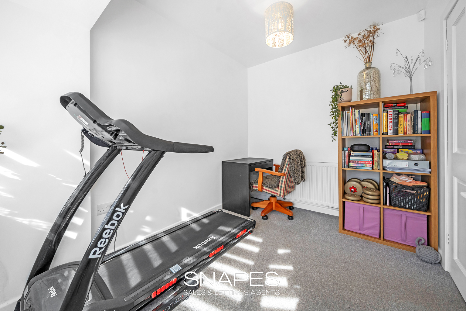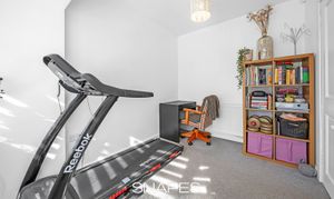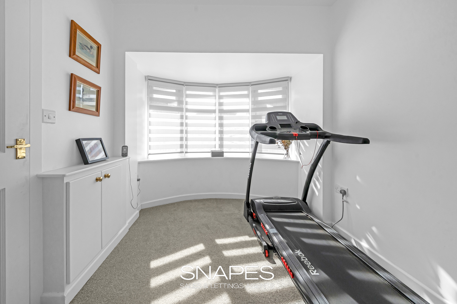 To the front of the property, the lounge provides a calm and inviting space, featuring a curved walk-in bay window and an attractive feature fireplace (see photos). Opposite, the room currently labelled as an office/playroom is used by the owners as a gym and workspace, demonstrating its flexibility. This room also benefits from a bay window to the front aspect.