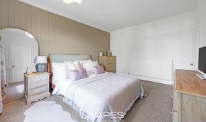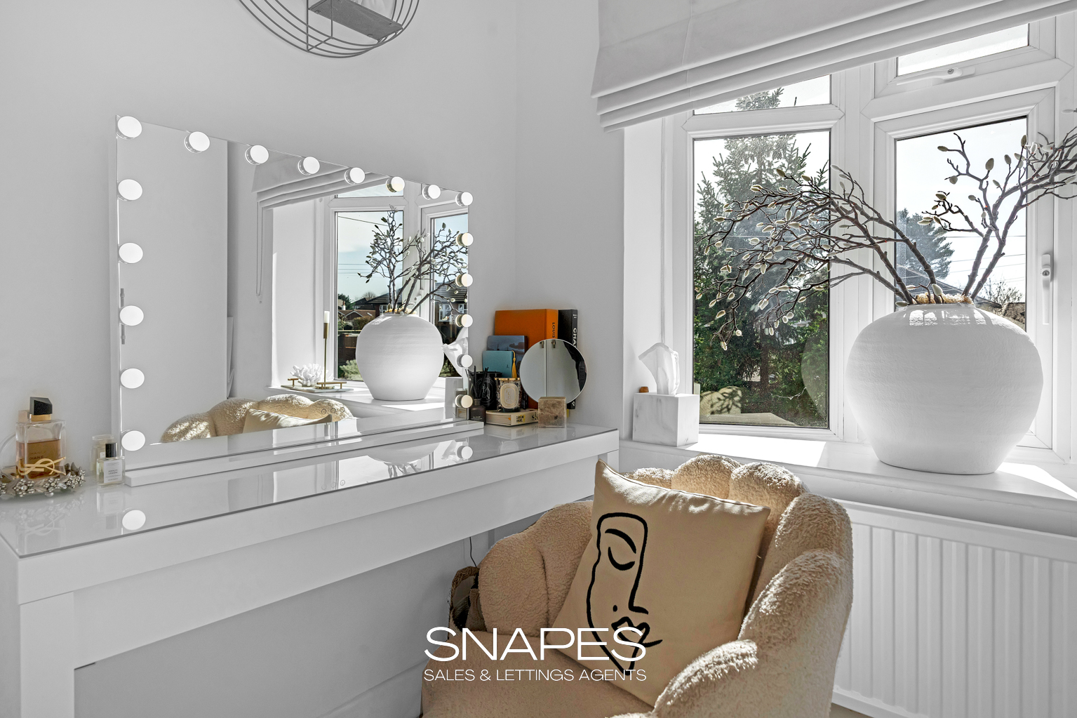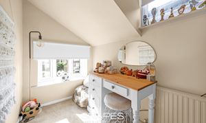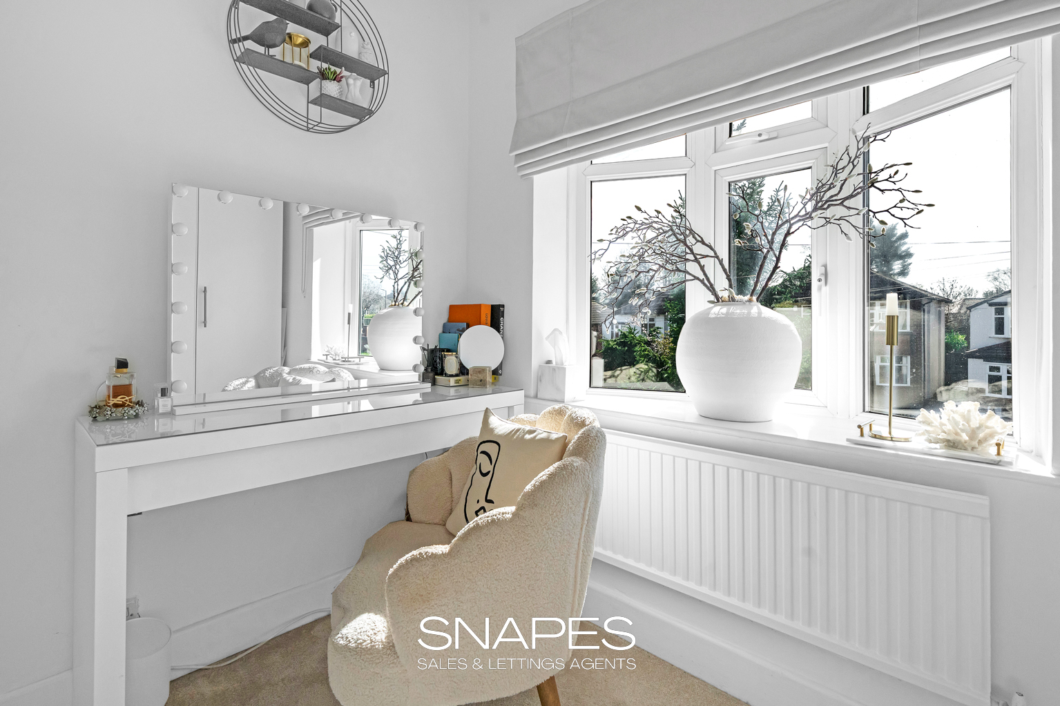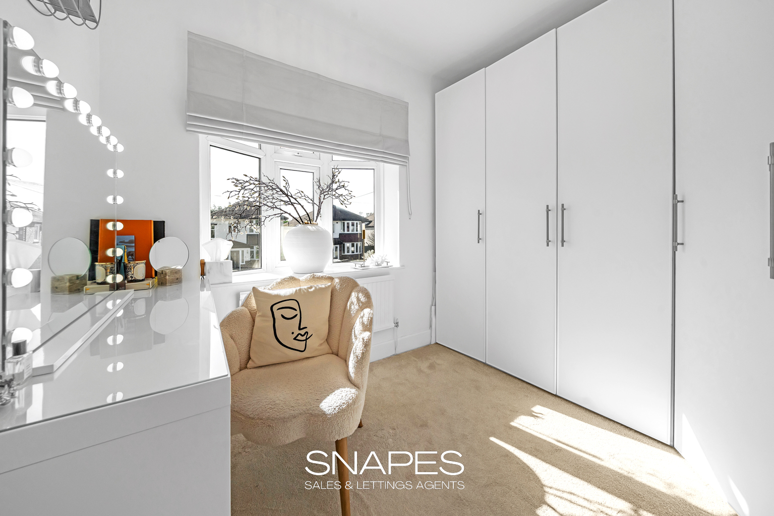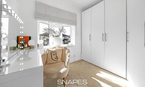 The third bedroom benefits from dual aspects - front and side - and offers space not only for sleeping but also for study or play, making it ideal for children. The fourth bedroom, a double, is currently configured as a dressing room, complete with a range of modern wardrobes and vanity.