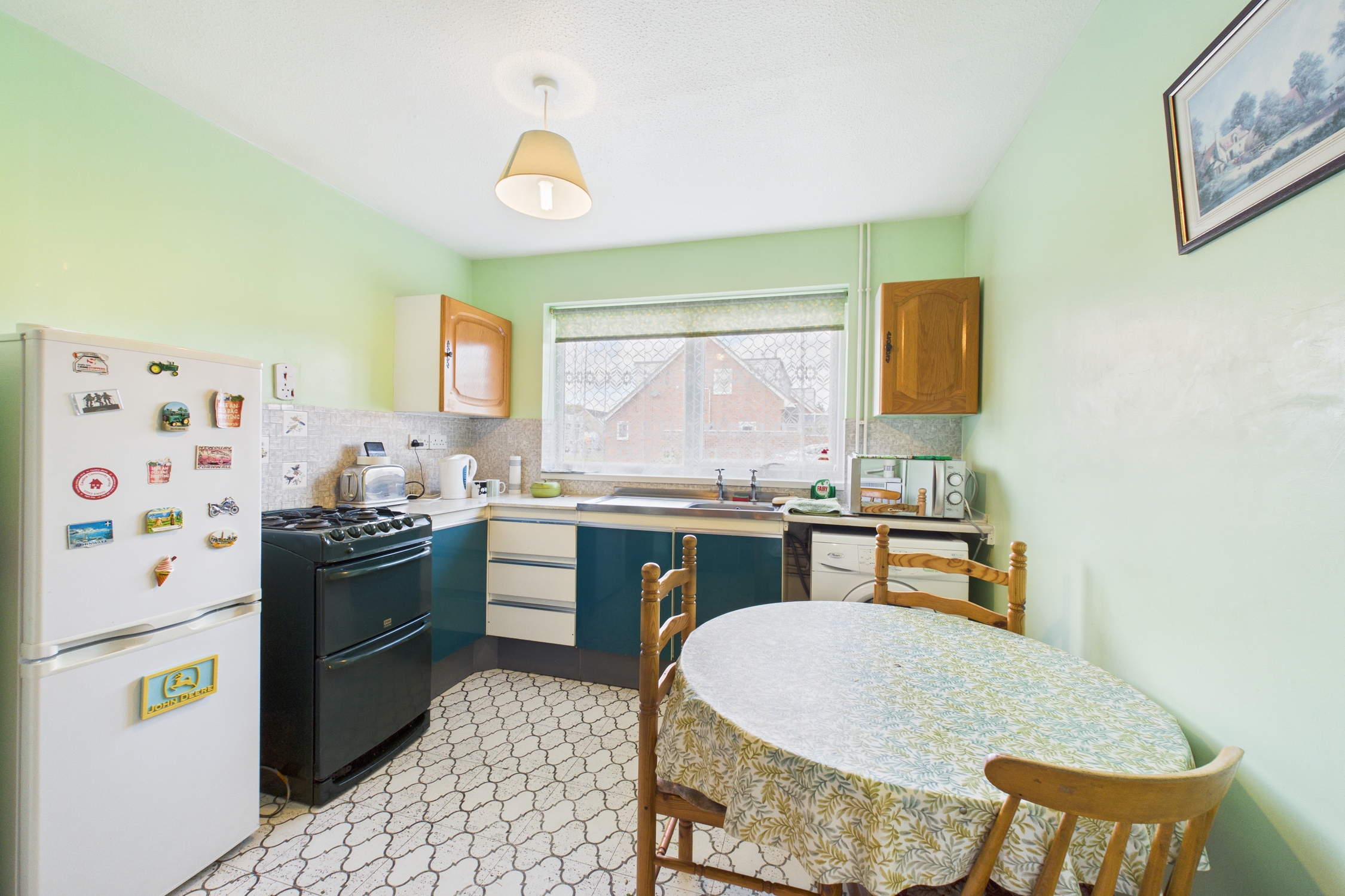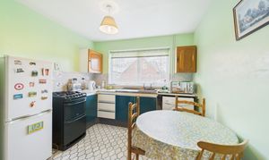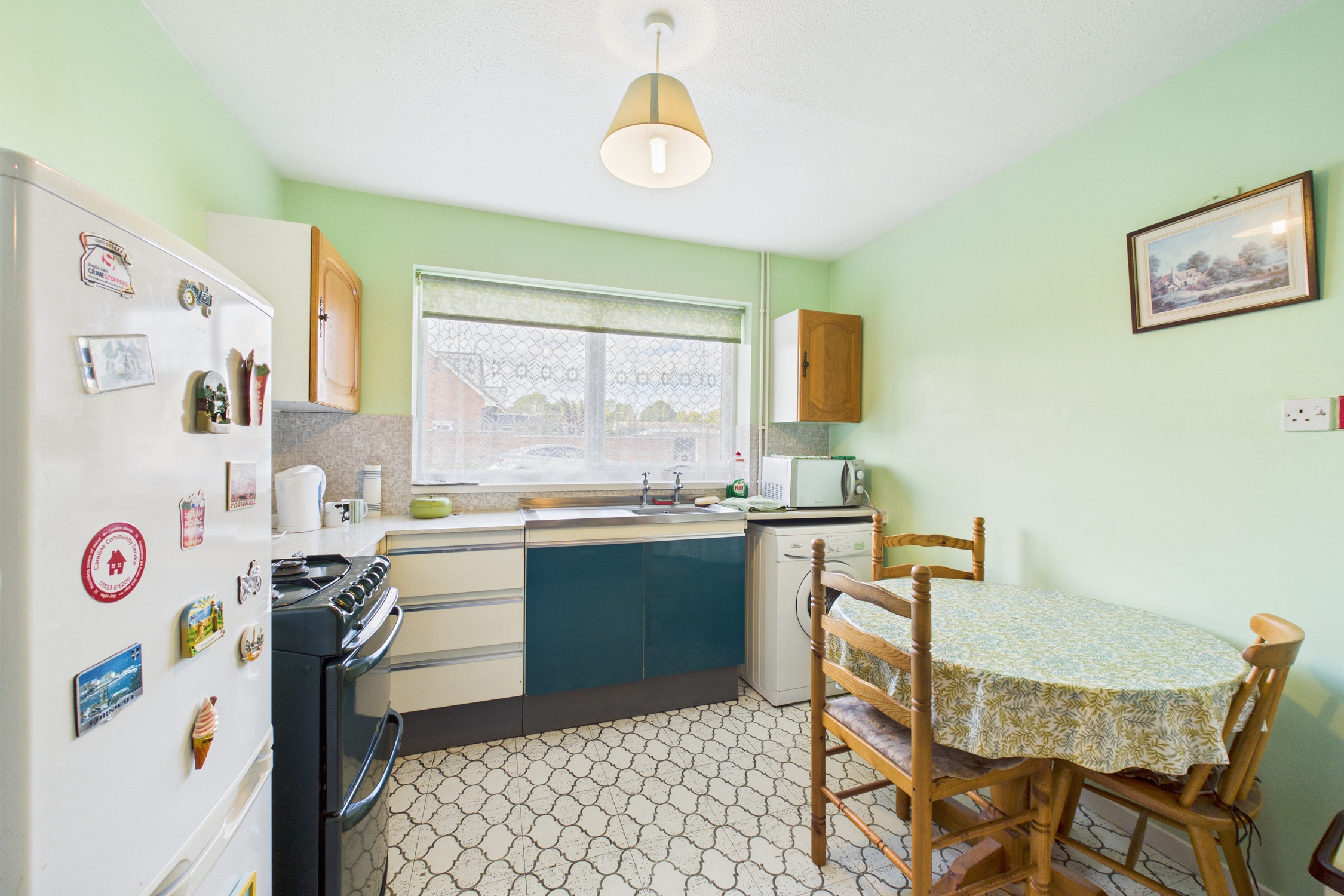 Window to front, wall and base units with worktop over, inset 1 bowl sink unit with individual taps over, tiled splashbacks, space for freestanding cooker, fridge / freezer, and washing machine, with gas fired boiler, and door to pantry style storage cupboard, with tile effect flooring.