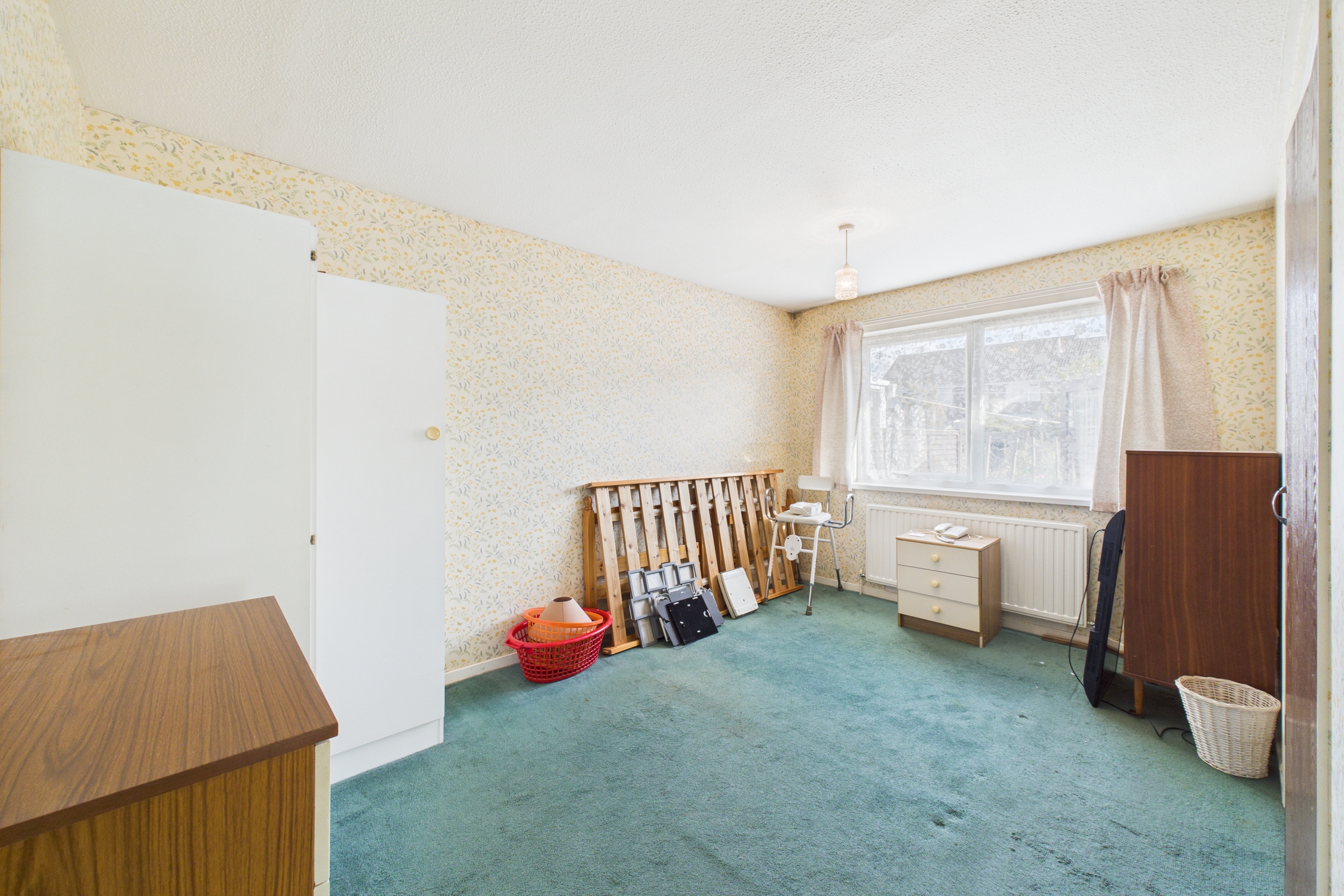 Window to rear, built-in wardrobes / storage, with radiator, and carpet flooring.