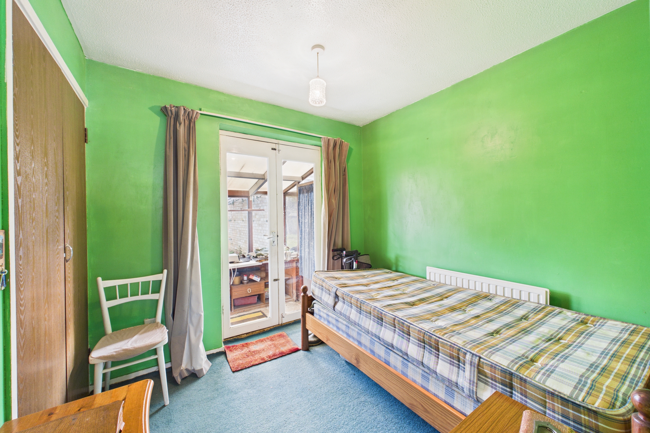 Built-in wardrobe / storage, with radiator, carpet flooring, and French doors to lean-to.