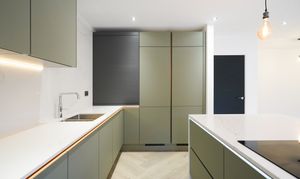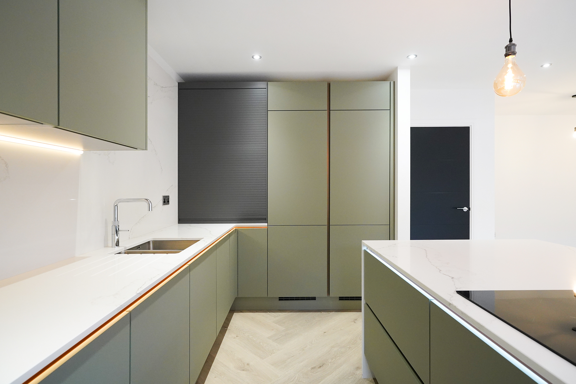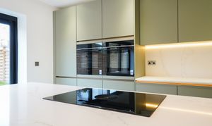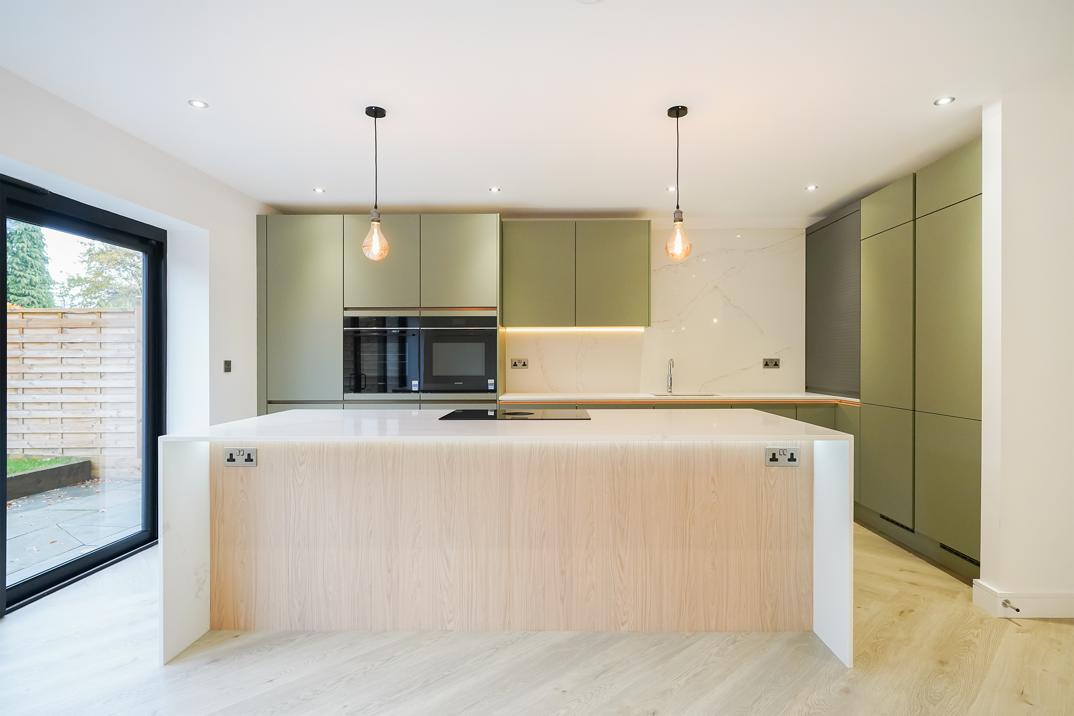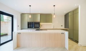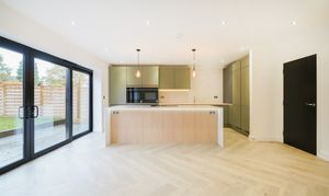 The free-flowing hallway leads to an exceptional open-plan kitchen/dining/living space situated conveniently at the rear of the property. Expansive sliding doors lead onto the beautiful, fully landscaped garden. Siemens appliances including two full-size integrated refrigerators and two full-size integrated freezers, a Bora Induction hob, and Silestone worktops adorn this modern kitchen, the perfect space for culinary enthusiasts and busy families.