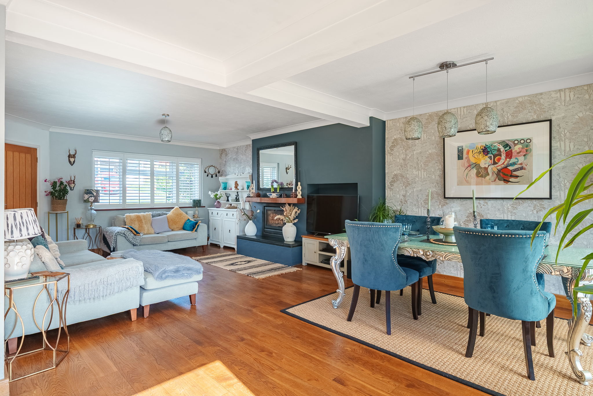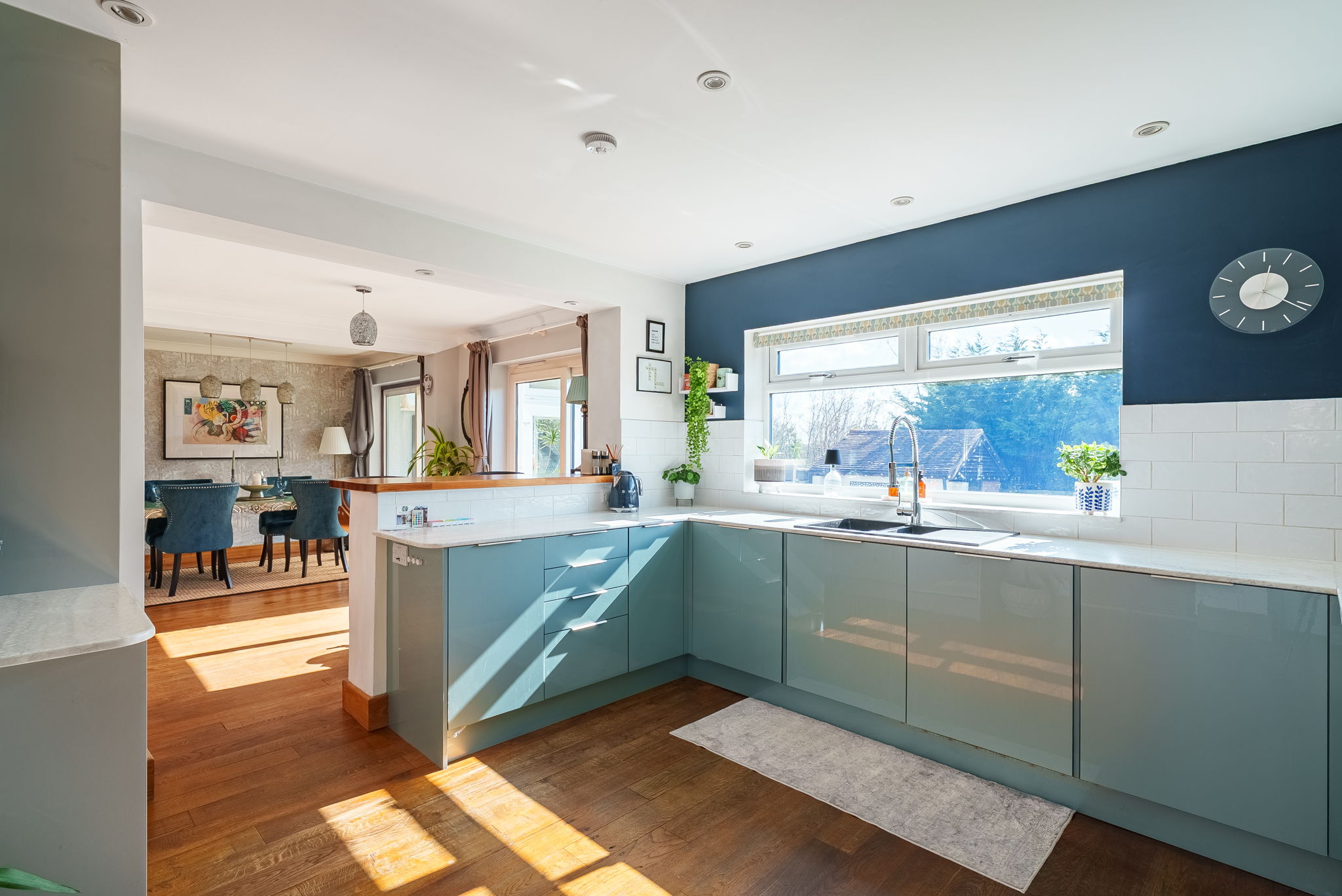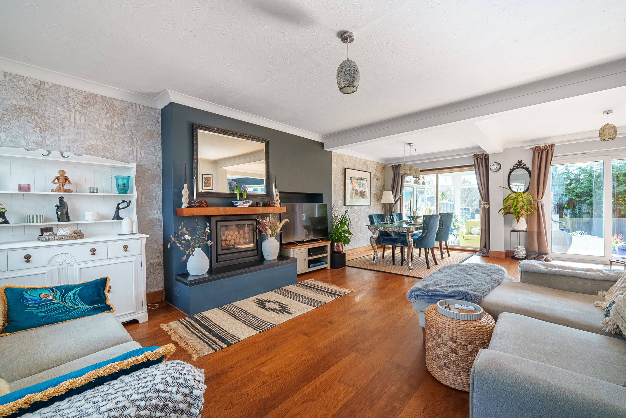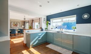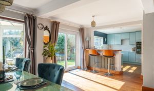 The bright and welcoming hallway provides access to the open-plan ground floor and stairwell to the first floor. The sitting room is a lovely bright space with a modern feature fireplace with a wood-burner and solid wood mantel. This leads on to the dining area of the kitchen/dining room, with plenty of natural light from two sets of sliding doors, the first set of which lead into the conservatory. The kitchen is a real highlight of this home, fitted with modern glossy units with composite stone worktops and finished with contemporary, white tiling. Appliances include a split-level double oven, an induction hob with extractor over, and integrated fridge and dishwasher. The attached utility room has space with plumbing for a washing machine and offers access to the downstairs cloakroom and to the remaining storage space.