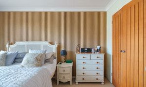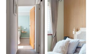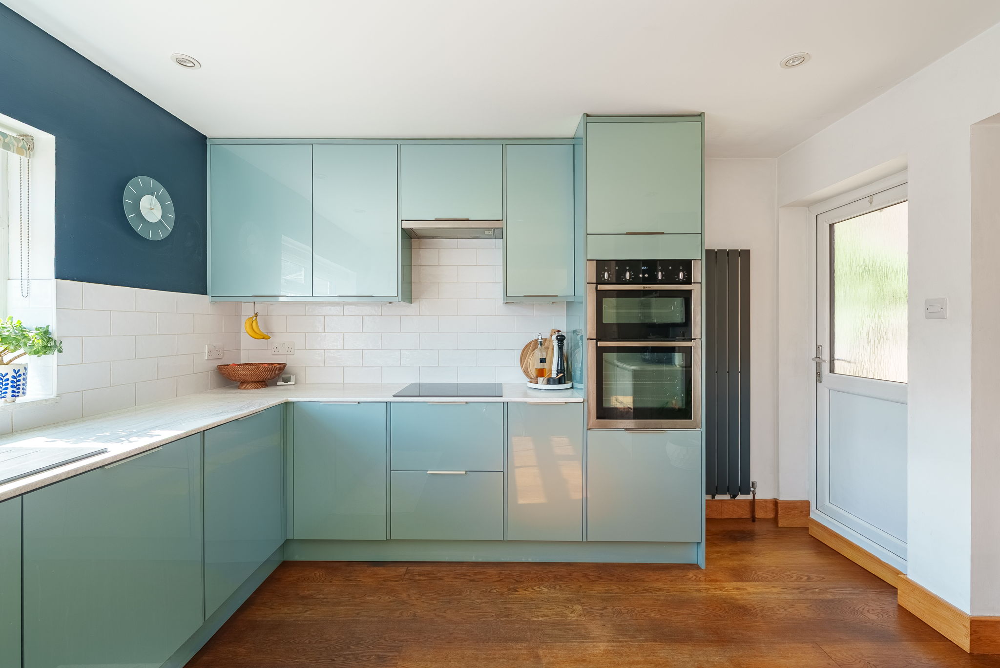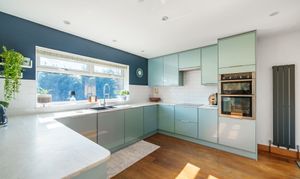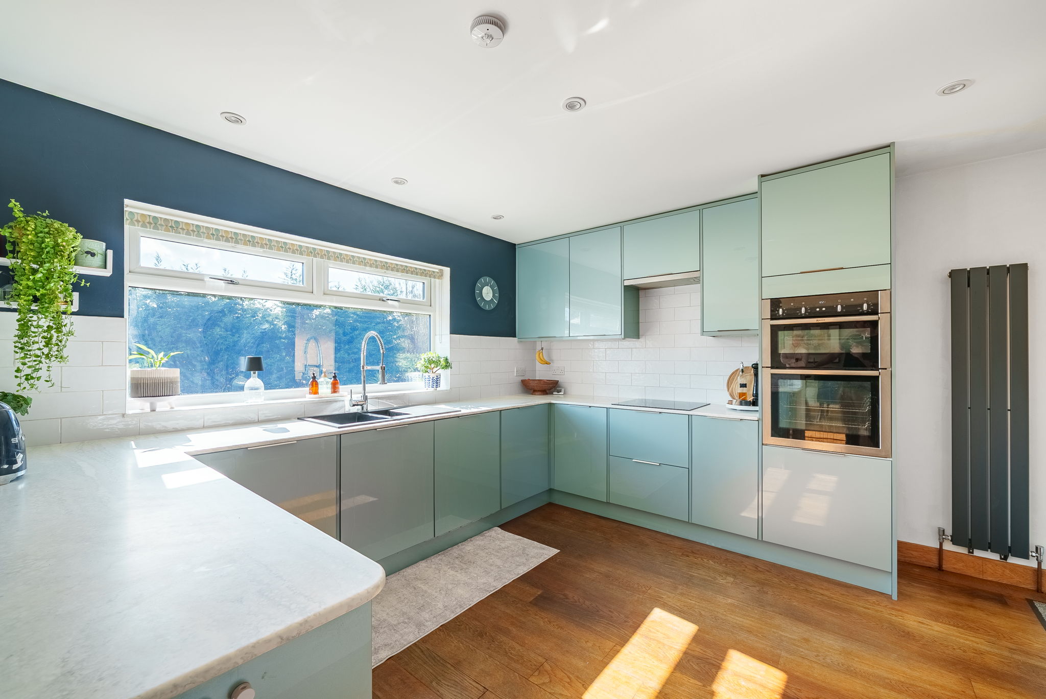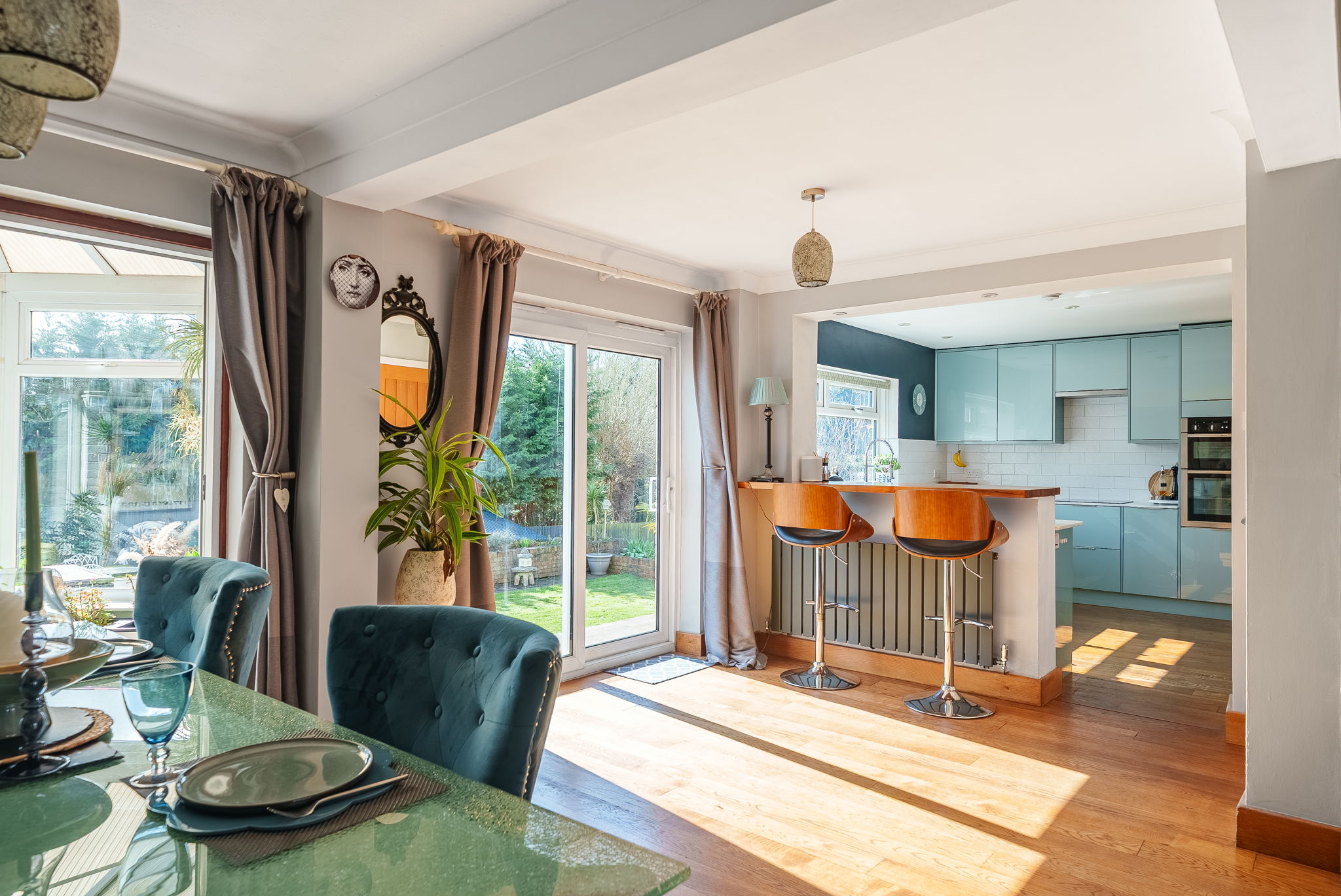 The bright and welcoming hallway provides access to the open-plan ground floor and stairwell to the first floor. The sitting room is a lovely bright space with a modern feature fireplace with a wood-burner and solid wood mantel. This leads on to the dining area of the kitchen/dining room, with plenty of natural light from two sets of sliding doors, the first set of which lead into the conservatory. The kitchen is a real highlight of this home, fitted with modern glossy units with composite stone worktops and finished with contemporary, white tiling. Appliances include a split-level double oven, an induction hob with extractor over, and integrated fridge and dishwasher. The attached utility room has space with plumbing for a washing machine and offers access to the downstairs cloakroom and to the remaining storage space.
