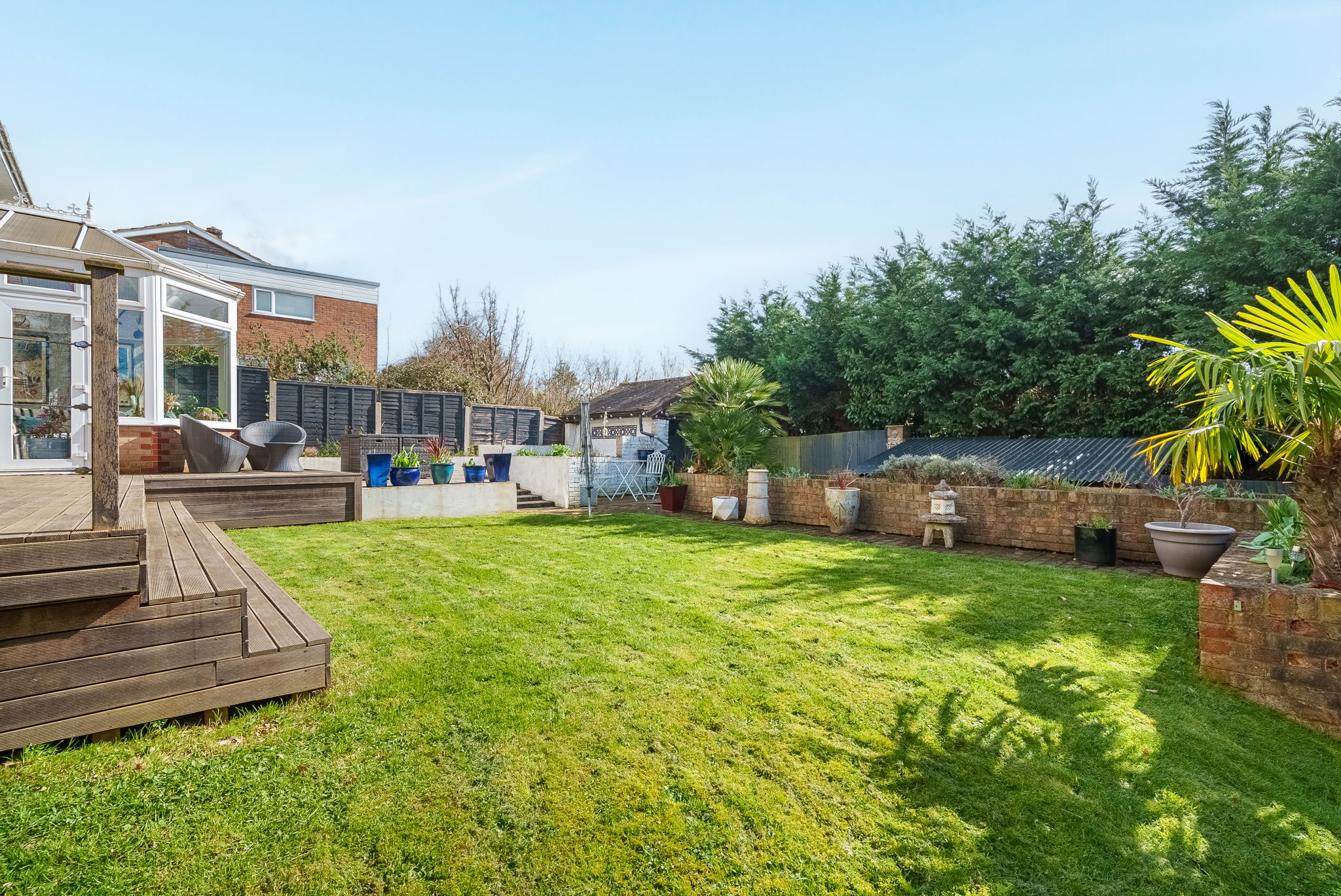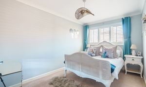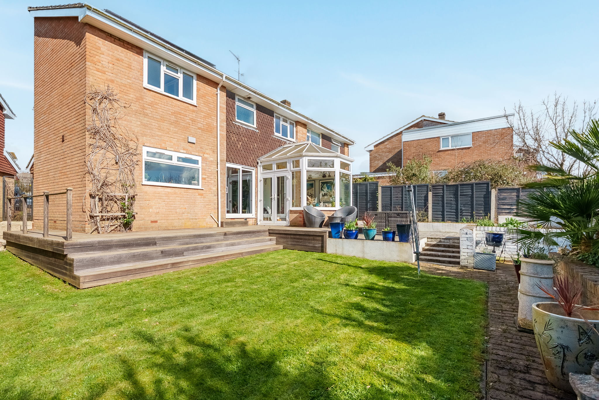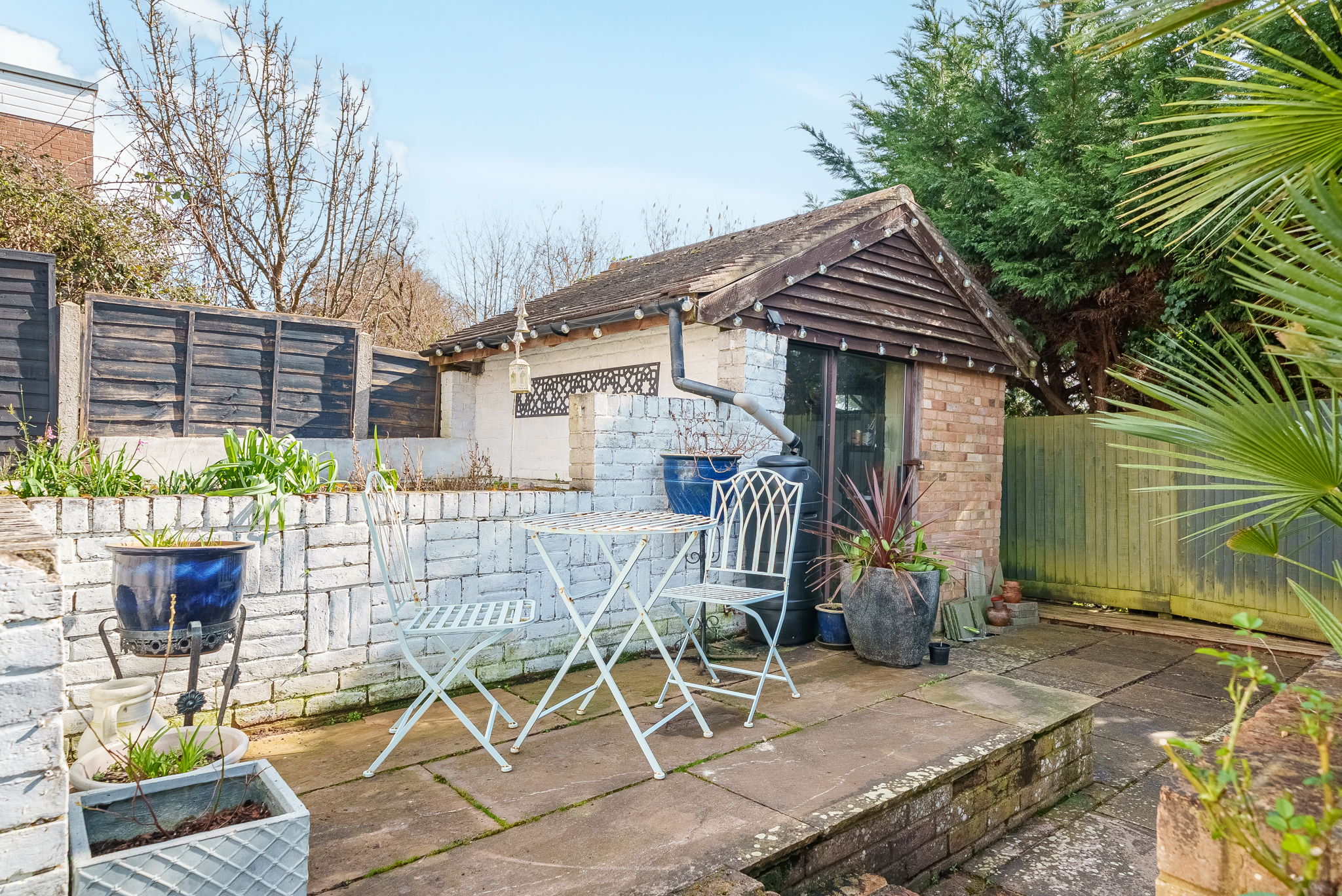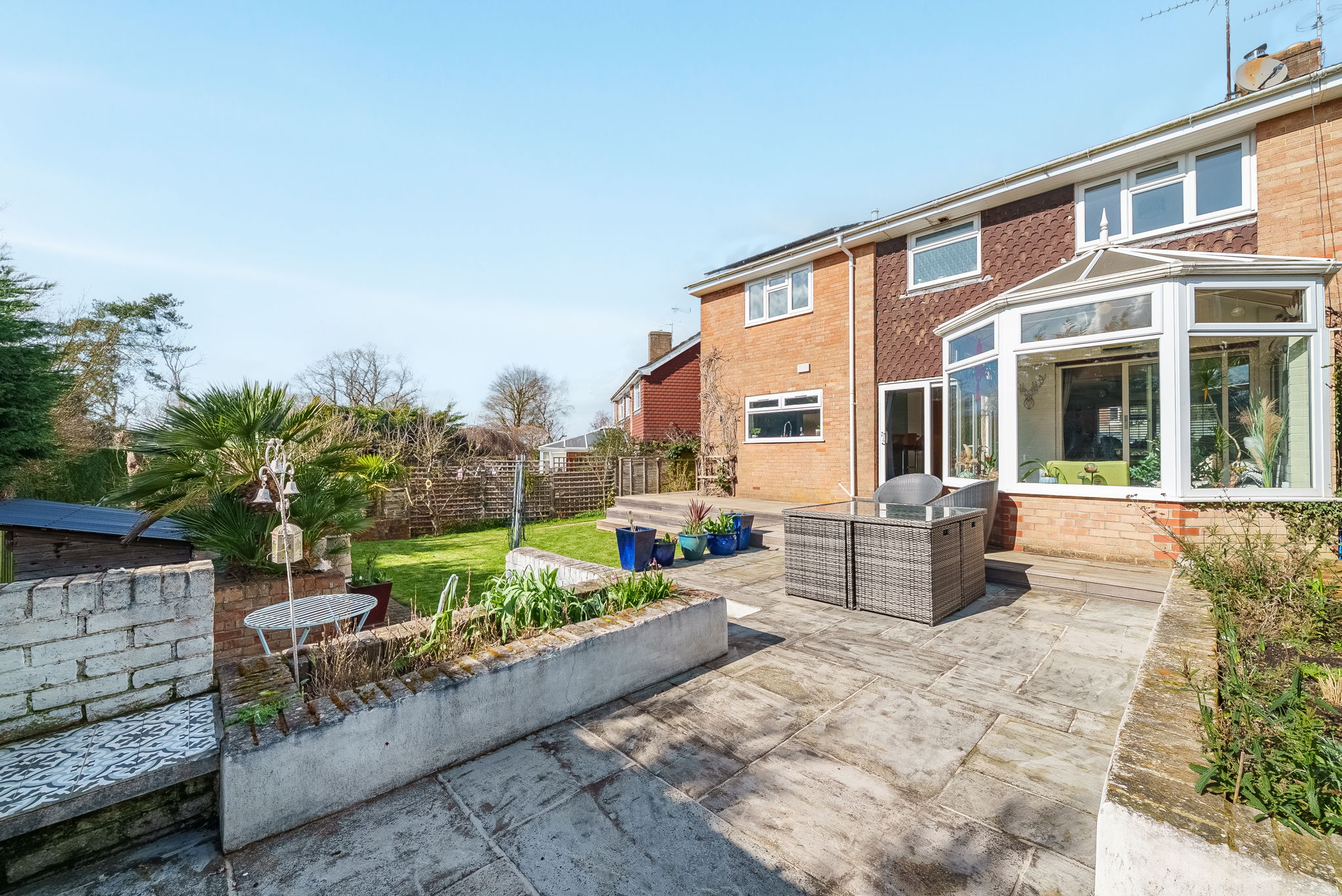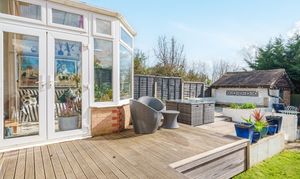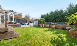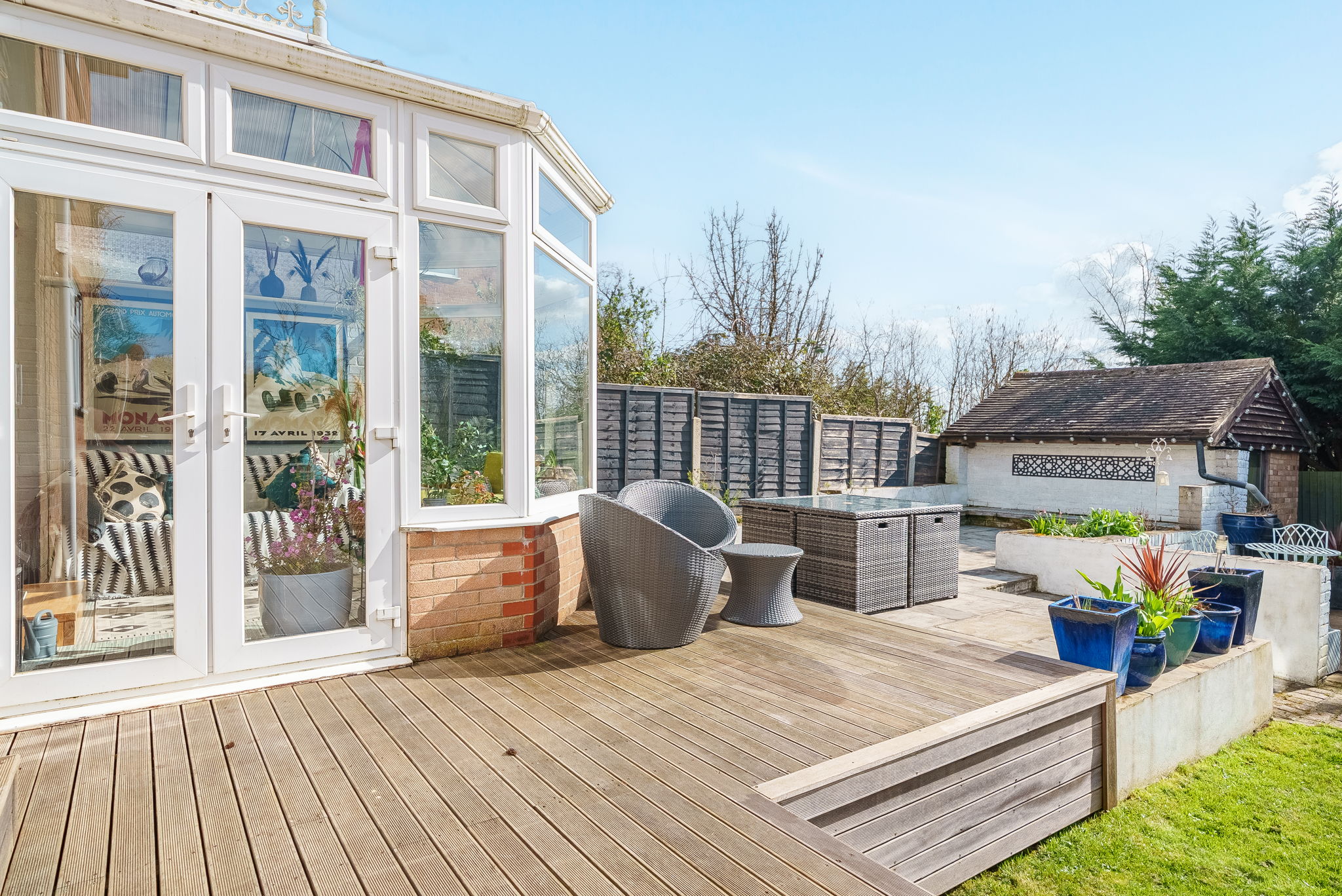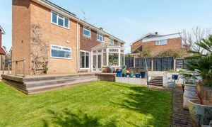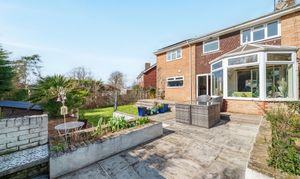 The property is approached via a driveway, with parking for four cars. A side gate leads to the south-facing, landscaped rear garden which is mainly laid to lawn with raised flower beds and decking. The ample patio area offers the perfect space for alfresco dining and summertime entertaining. There is an outbuilding, with power & light, which is currently used as a workshop, but could equally be converted to a garden study.