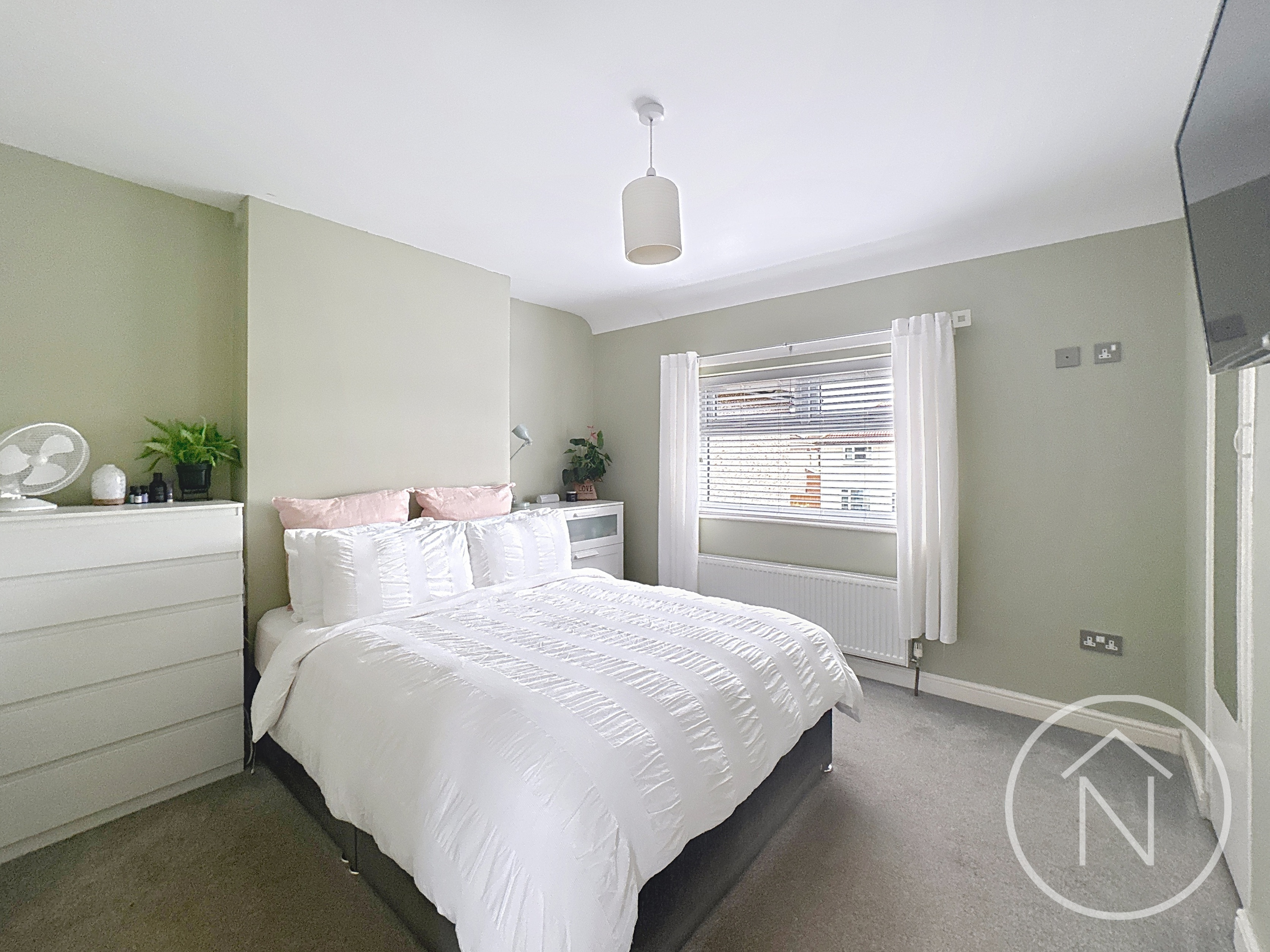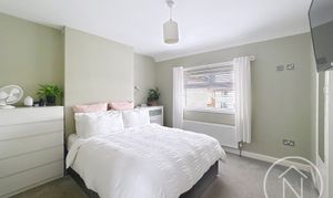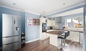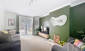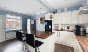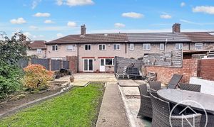 This beautifully presented three-bedroom, one-bathroom terraced house offers contemporary living at its finest. The heart of the home is a modern kitchen featuring sleek cabinetry, integrated appliances, and a central island with bar seating - perfect for both casual dining and entertaining guests. The spacious reception room is enhanced by a striking feature wall and enjoys abundant natural light, creating a welcoming space for relaxation. French doors lead directly from the living area to the garden, offering seamless indoor-outdoor living and extending the entertaining space outdoors.
