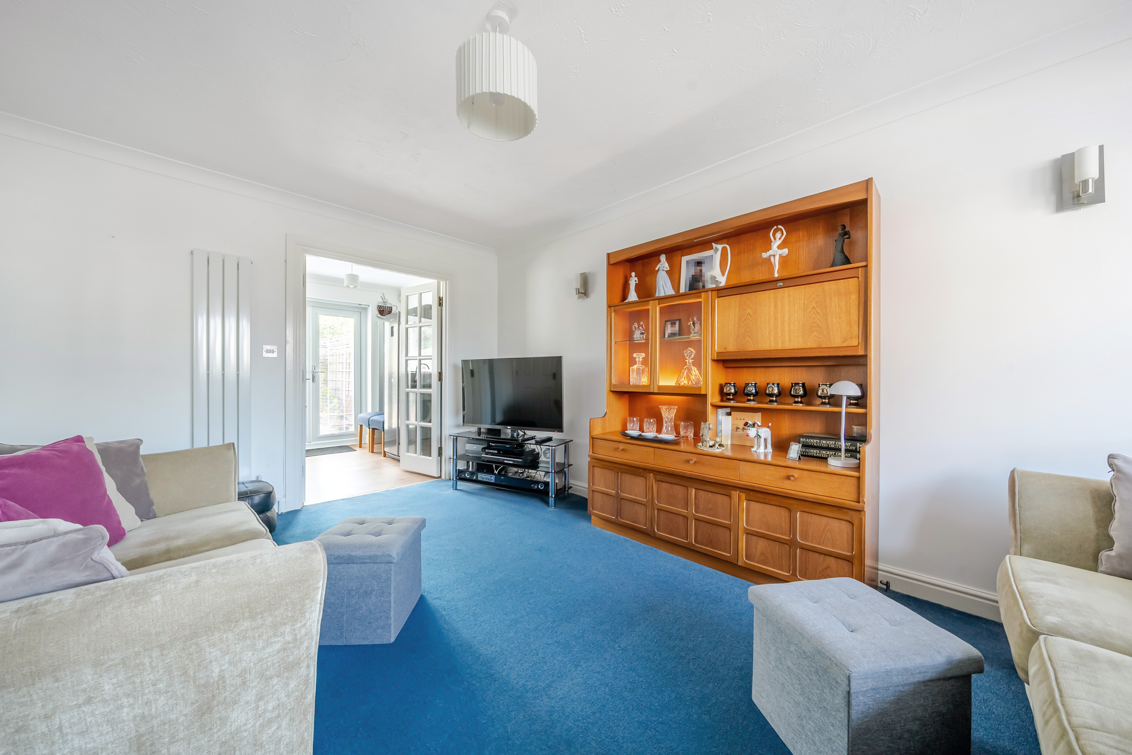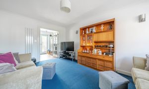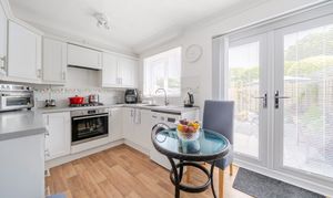 Upon entering the home, you are welcomed via a practical entrance porch with stairs directly ahead and a door to the right leading into a generous sitting room. This bright and inviting space features a walk-in bay window, a large under-stairs storage cupboard, and double doors that open into the open-plan kitchen and dining room, perfect for modern family living and entertaining. An electric fire and surround, previously fitted in the living room, have been carefully stored in the garage and can be reinstated by the new owners if desired. The kitchen is fitted with classic white shaker-style units and offers space for a dishwasher and fridge. French doors open onto the rear garden, creating a seamless connection to the outdoors. The single garage is accessed from the garden and is currently used as a utility space, with plumbing in place for a washing machine and tumble dryer, ideal for keeping appliances out of the main living areas.