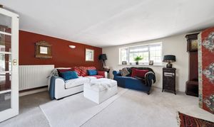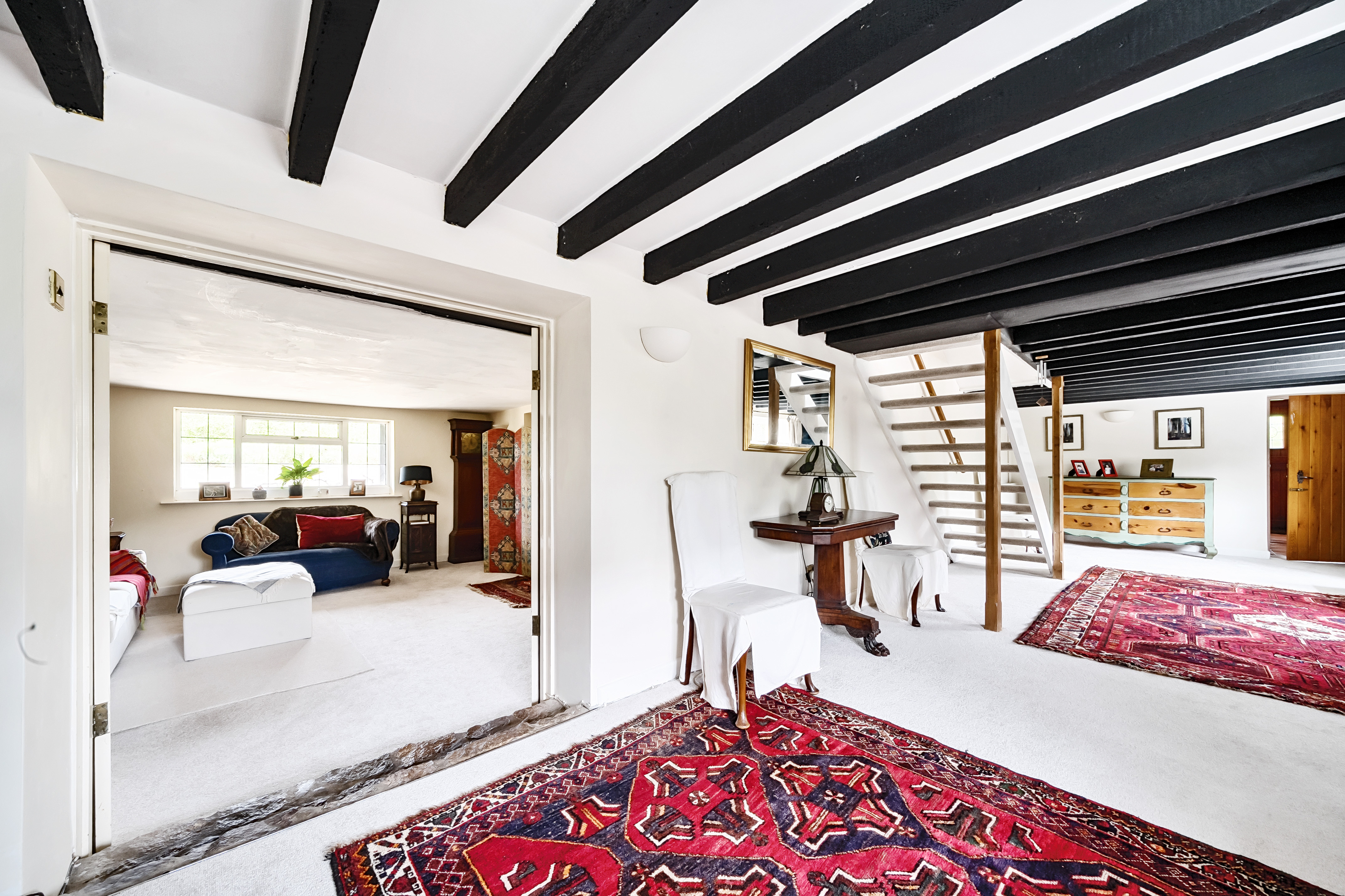 Glazed internal doors open from the kitchen into the large sitting room, from which another set of glazed doors open onto the large open plan reception room running across the front of the house. This includes an open fireplace with hearth to one end and a beamed ceiling. There are 2 wide windows overlooking the front, and in the middle is the (generally unused) front door. Open plan carpeted stairs lead up to the bedroom accommodation.