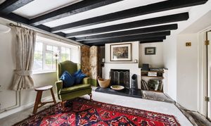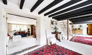 - Large beamed reception room with open fireplace