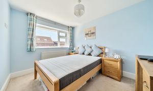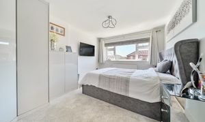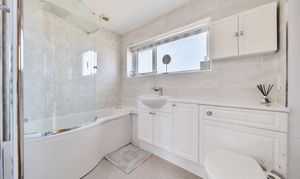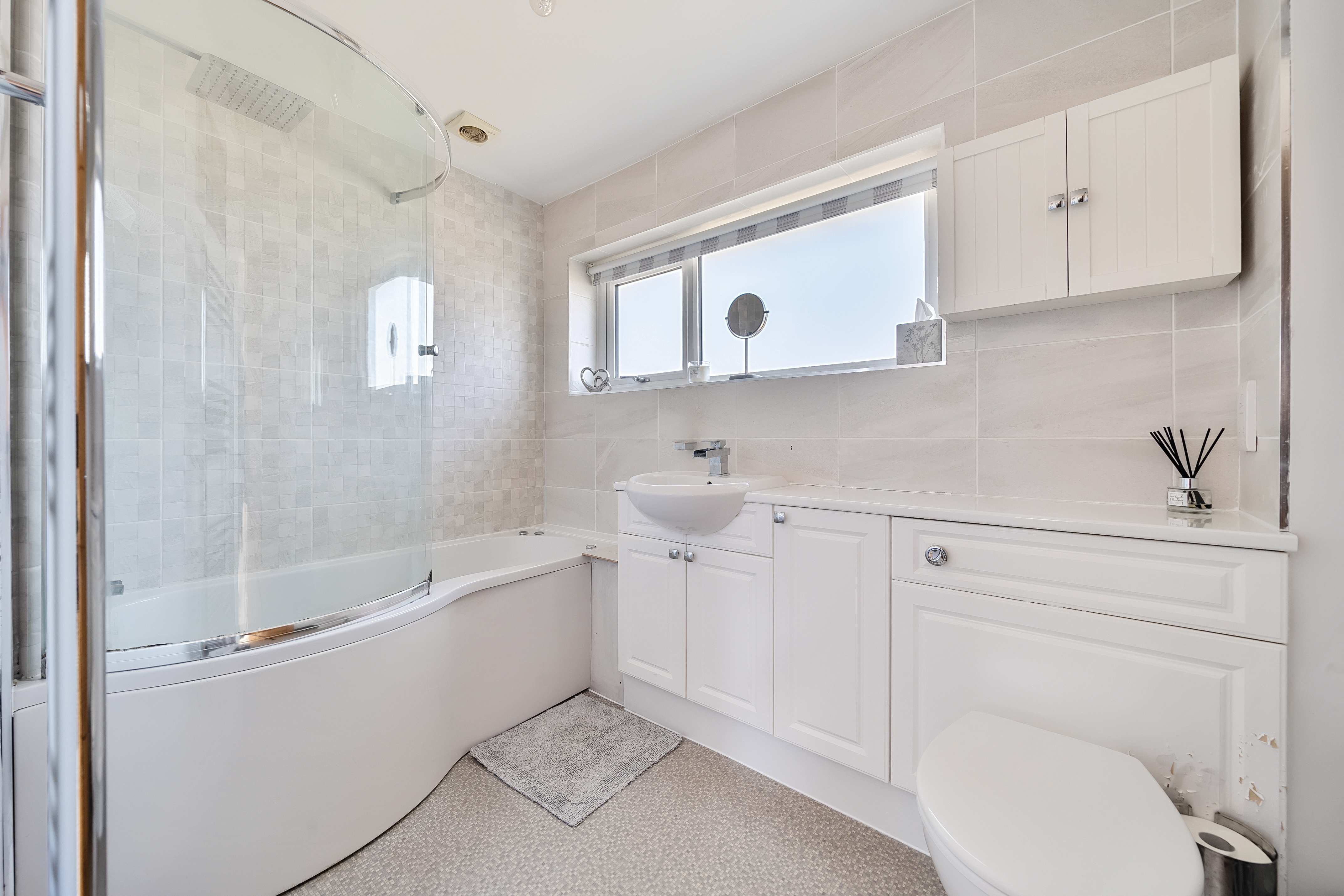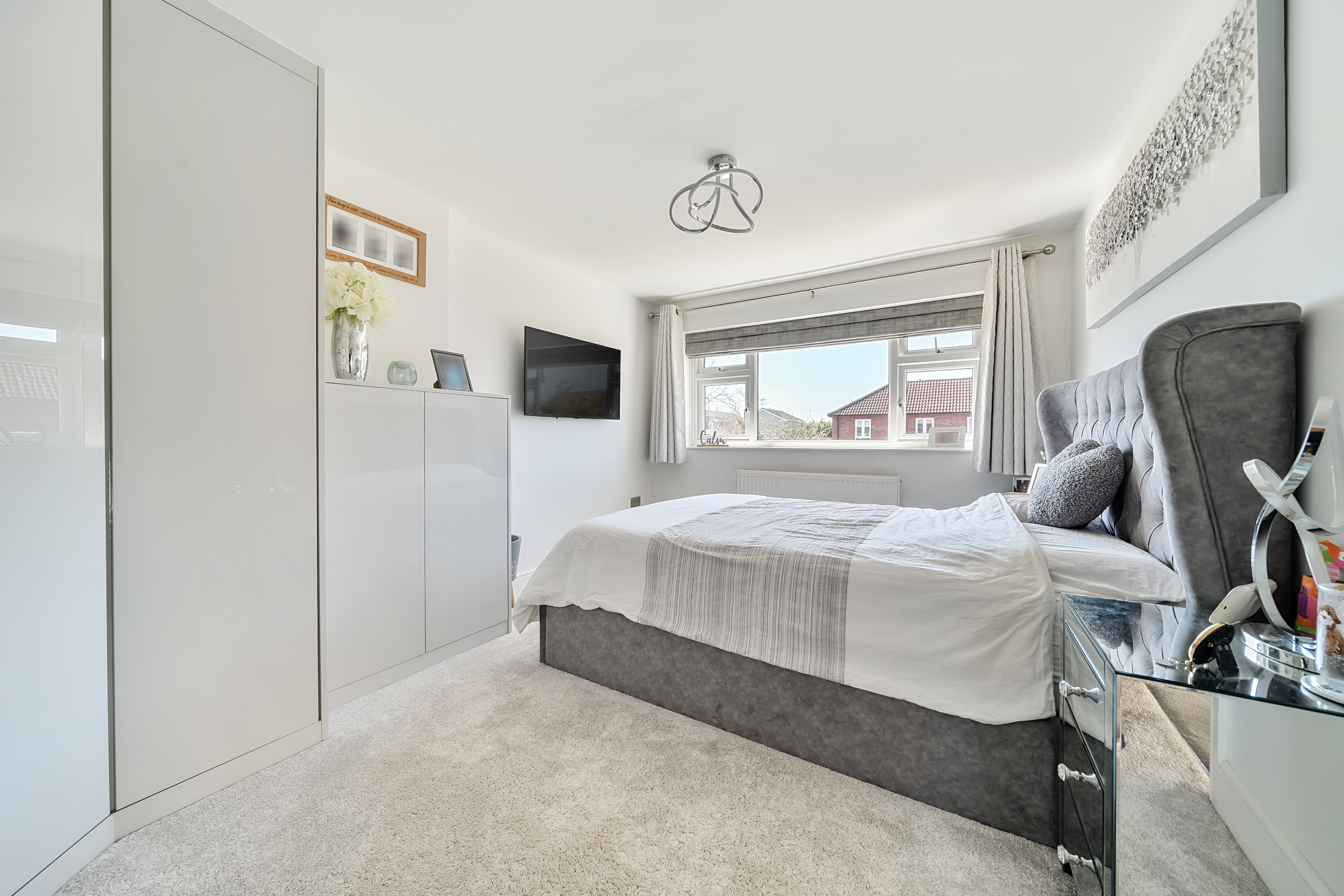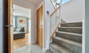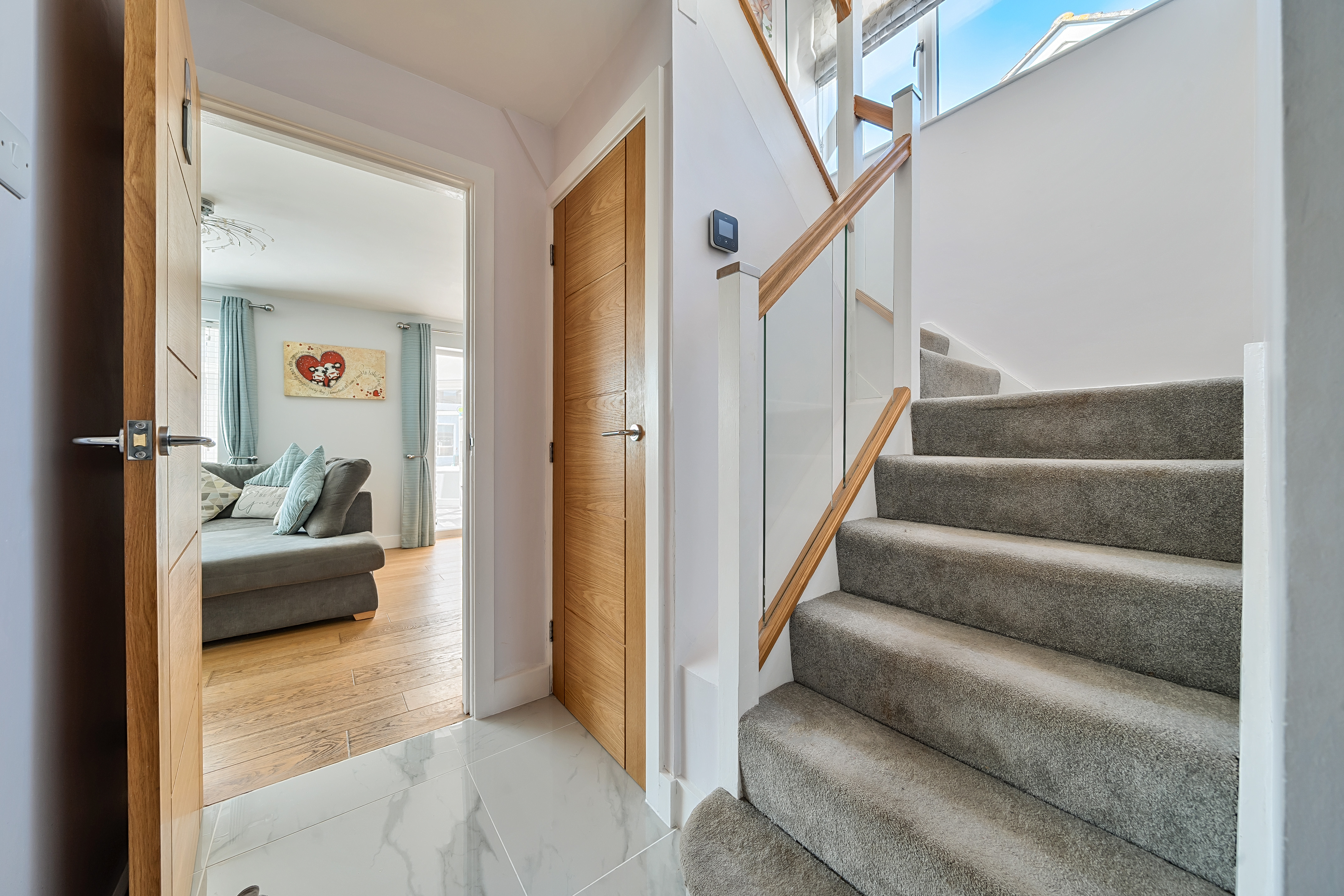 Upstairs, the light and airy first-floor landing features a large window and a striking glass and oak staircase. It provides access to three generously sized double bedrooms, with the master bedroom benefiting from fully fitted Hammonds high-gloss wardrobes. The family bathroom is beautifully tiled and includes a classic white three-piece suite.