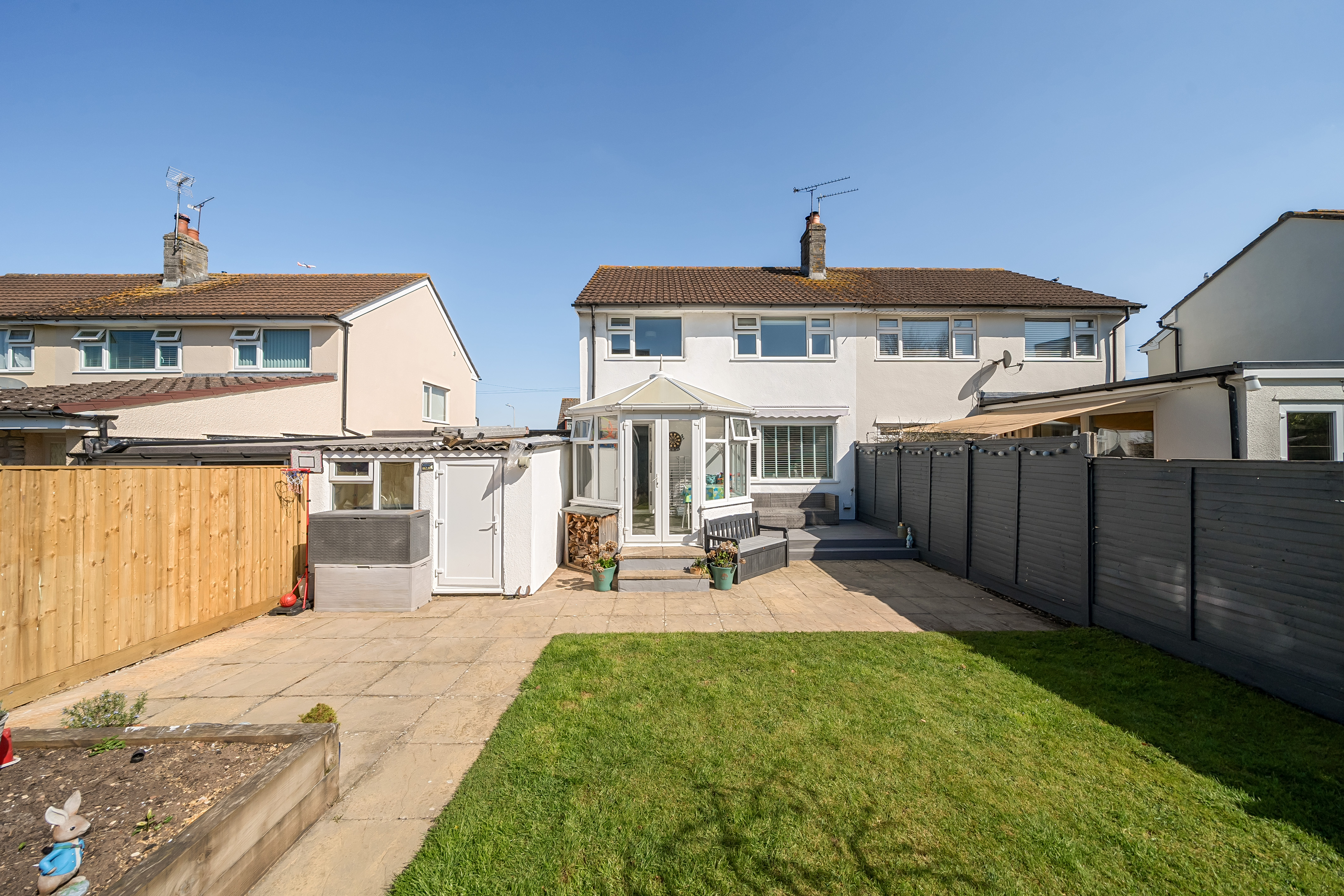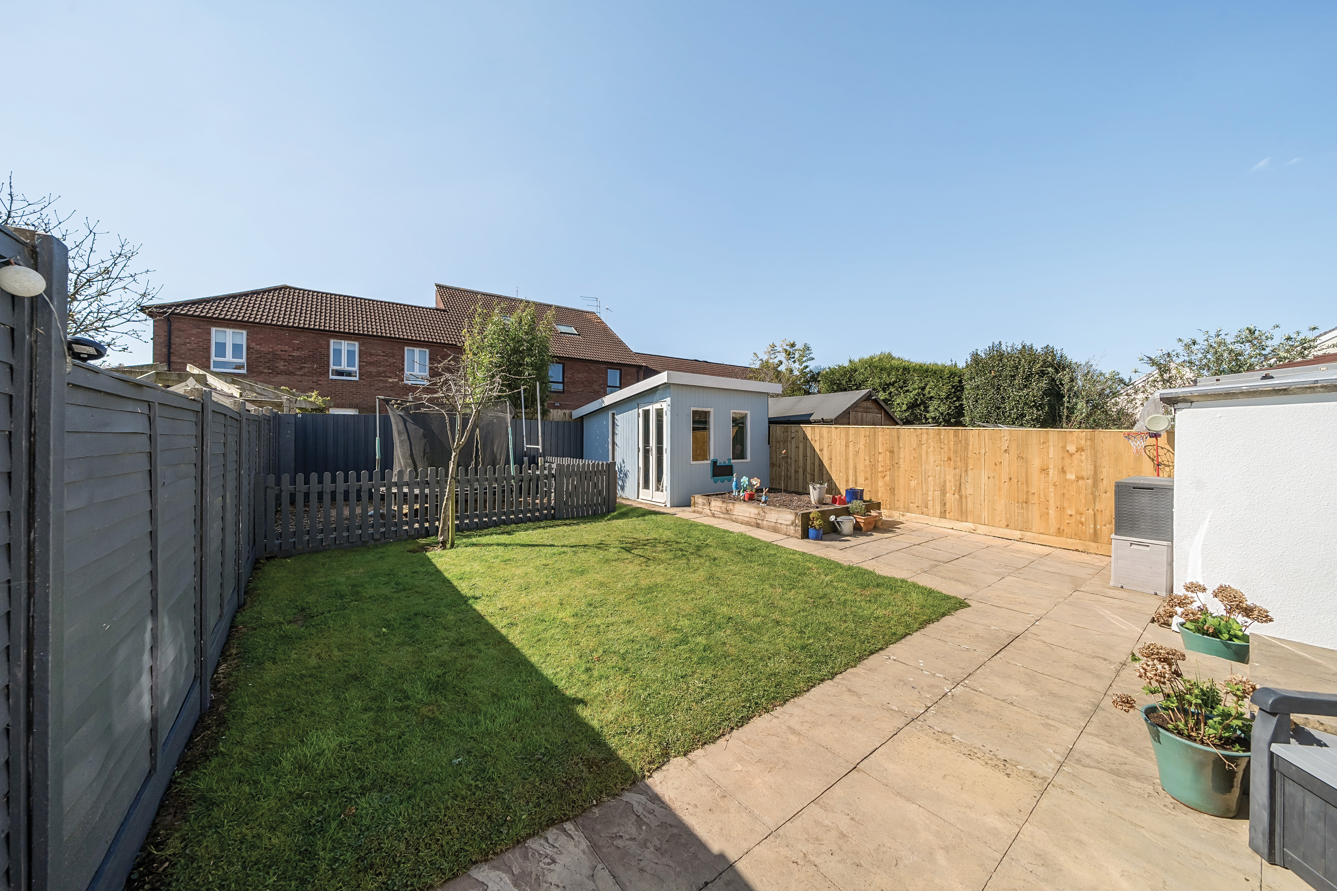 18 Park Road is set back from the road behind a spacious front garden and a large driveway, providing off-road parking for up to five vehicles, access to the garage and a useful outdoor power socket. A side door leads to a storage area, perfect for concealing recycling bins. The south facing rear garden features a decked area with a canopy, ideal for relaxing and enjoying the sunshine, as well as a generous patio area for outdoor dining. The garden is mainly laid to lawn, with a large raised flower bed and a separate play area. Additionally, a fully insulated summerhouse offers potential as a home office, with the option to add electricity and lighting for year-round use.