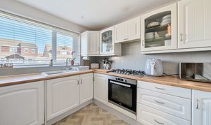 A charming oak-framed porch with Millboard composite decking welcomes you to the newly installed modern front door. Upon entering, you are greeted by a bright and inviting hallway, featuring large high-gloss marble-effect tiles. To the right, you'll find a cloakroom/utility room, providing space for a washing machine and additional storage. On the left is the kitchen, which is fully fitted with stylish cream units. It includes an integrated electric oven, a five-ring gas hob, space for a slimline dishwasher, and space for a fridge/freezer.