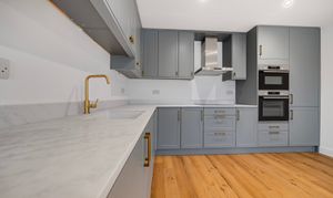 A smart driveway with chard stone gravel takes you right to the front door, which, with a large windows to one side which floods the hallway with light. Immediately to the left is the spacious kitchen/breakfast room, which has room for a dining table, along with a good range of units finished in smart Cambridge blue with contrasting marble-effect worktops. Integrated appliances include a double oven, dishwasher, induction hob, and a frost-free fridge/freezer with Wi-Fi.