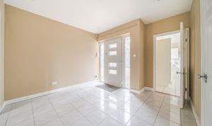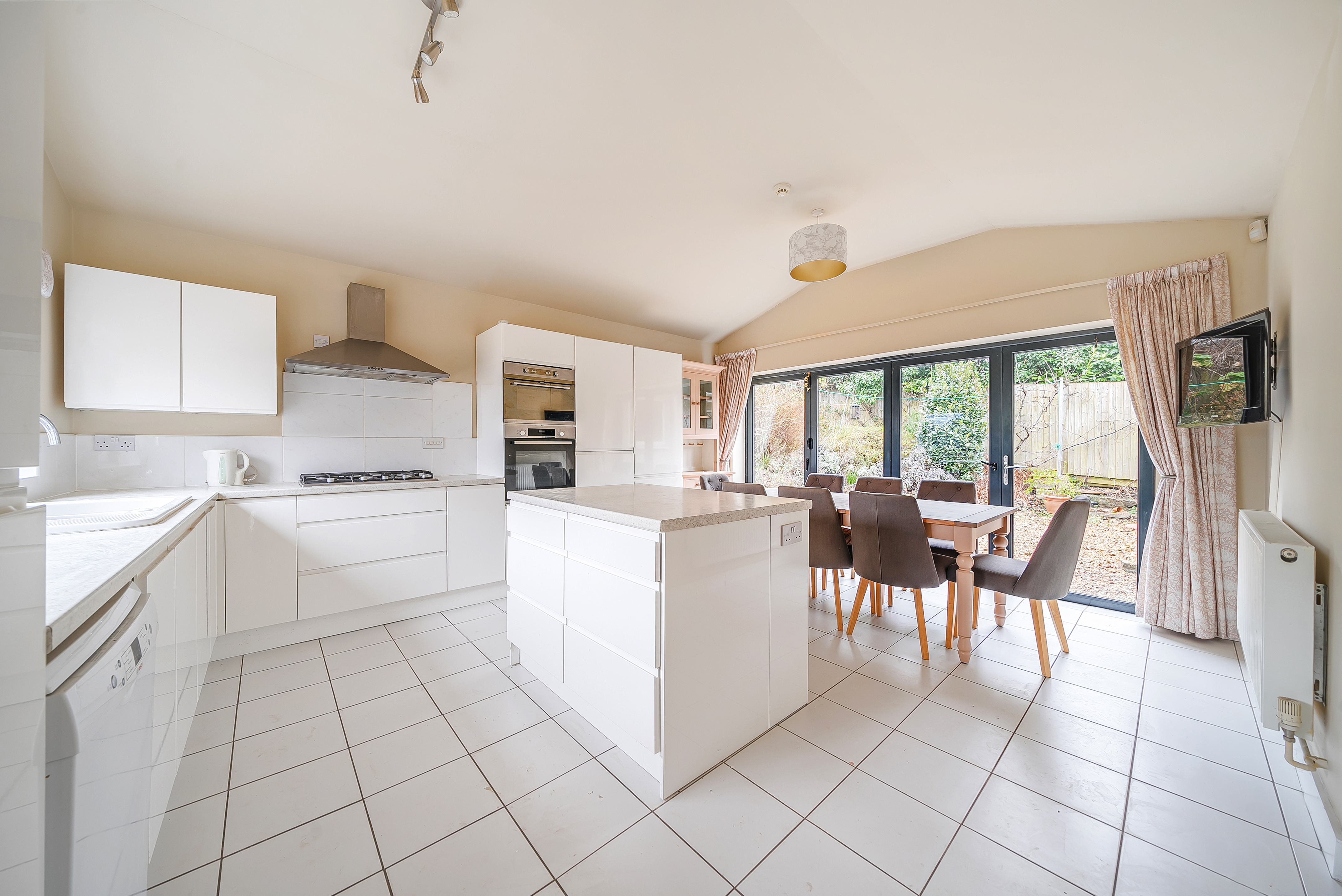 Entering the welcoming front door, you step into a spacious hallway with practical tiled flooring and a downstairs WC. Immediately to the left is the kitchen. A bright room with bifold windows opening to a courtyard garden at the rear of the property, it is fully fitted with white units and contrasting beige countertops. The kitchen has a six-ring gas hob, space for a dishwasher, integrated double oven, fridge-freezer, and an attractive island. There is also a practical utility cupboard with space for a washing machine and tumble dryer, as well as ample space for a large kitchen table.