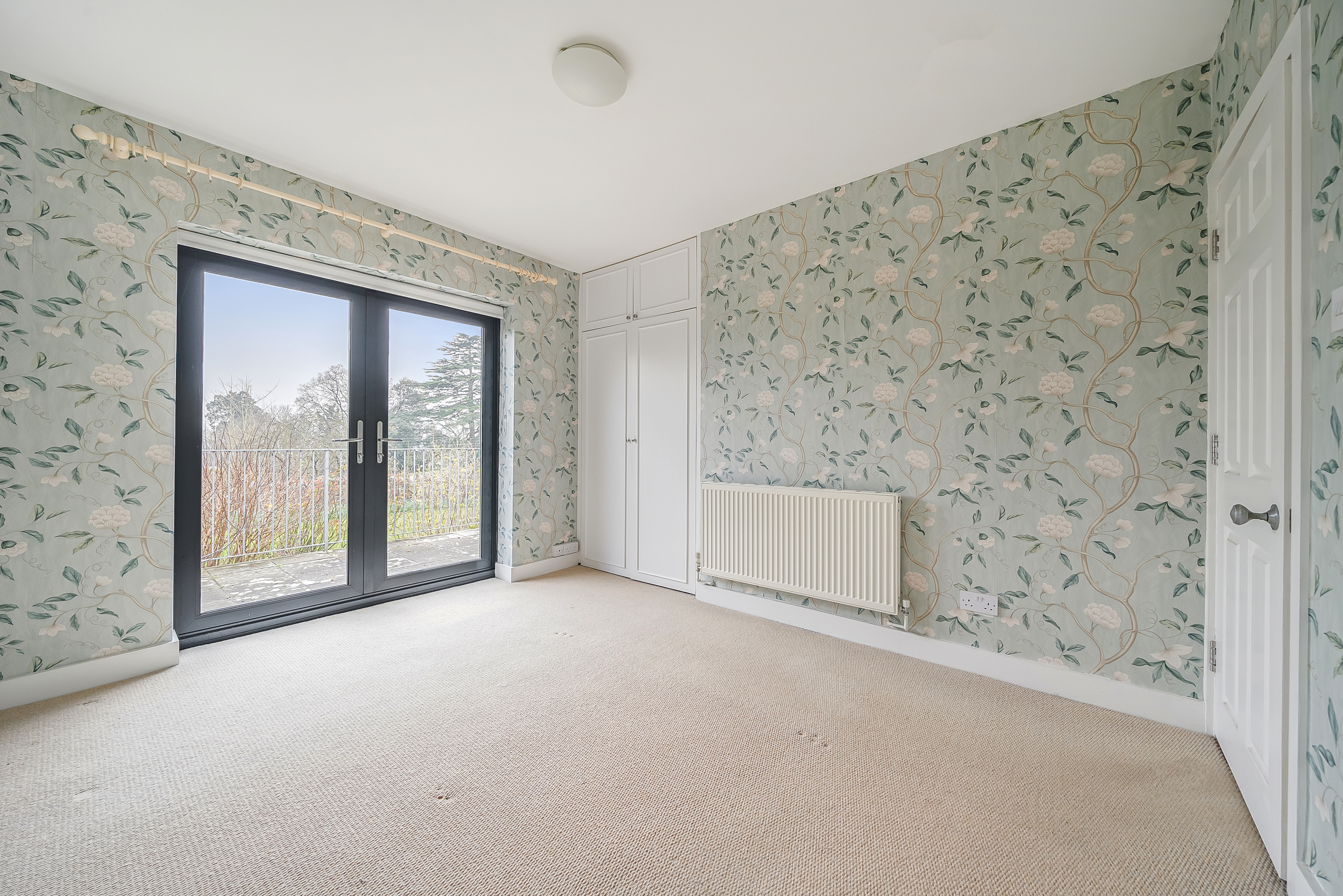 Returning to the hallway, straight ahead is the wonderful reception room. Large picture windows ensure that the views are maximised, and a cosy log burner is complemented by a built-in cupboard and bookshelves in the alcove. French doors open to the garden, where there is a wide, elevated, south-facing terrace across the width of the property – the perfect spot to relax and take in the full beauty of the surroundings.