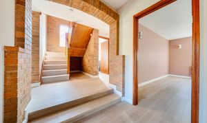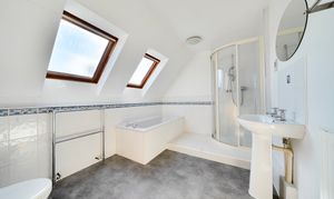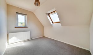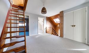 Upstairs, the first-floor accommodation is arranged around an exceptionally spacious central landing, complete with a useful linen cupboard. Natural light pours in through a Velux window above the stairwell.