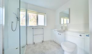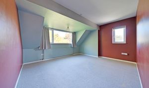 The principal bedroom features a wall of fitted cupboards with sliding doors, and benefits from an en-suite contemporary shower room. Jack and Jill doors allow access either from the bedroom or the landing, providing flexibility. Two further double bedrooms and a single bedroom are served by a large family bathroom with a curved shower enclosure and separate bath.