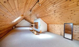 From the landing, open-tread pine stairs rise to the expansive, light-filled loft room, clad in pine and running the full length of the property. Three Velux windows flood the space with daylight, making it both practical and versatile.