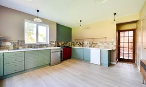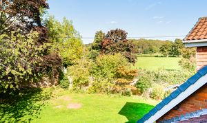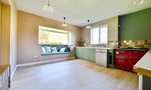 Two shallow steps lead from the hall into the generous sitting room, which features a brick hearth and open fireplace. Patio doors open onto a wide terrace and the garden beyond. Opposite sits the dining room, and between the two lies the spacious kitchen/breakfast room. With ample space for a large breakfast table and a charming window seat overlooking the garden, this welcoming room forms the heart of the home—ideal for family dining, entertaining or simply relaxing.