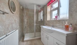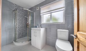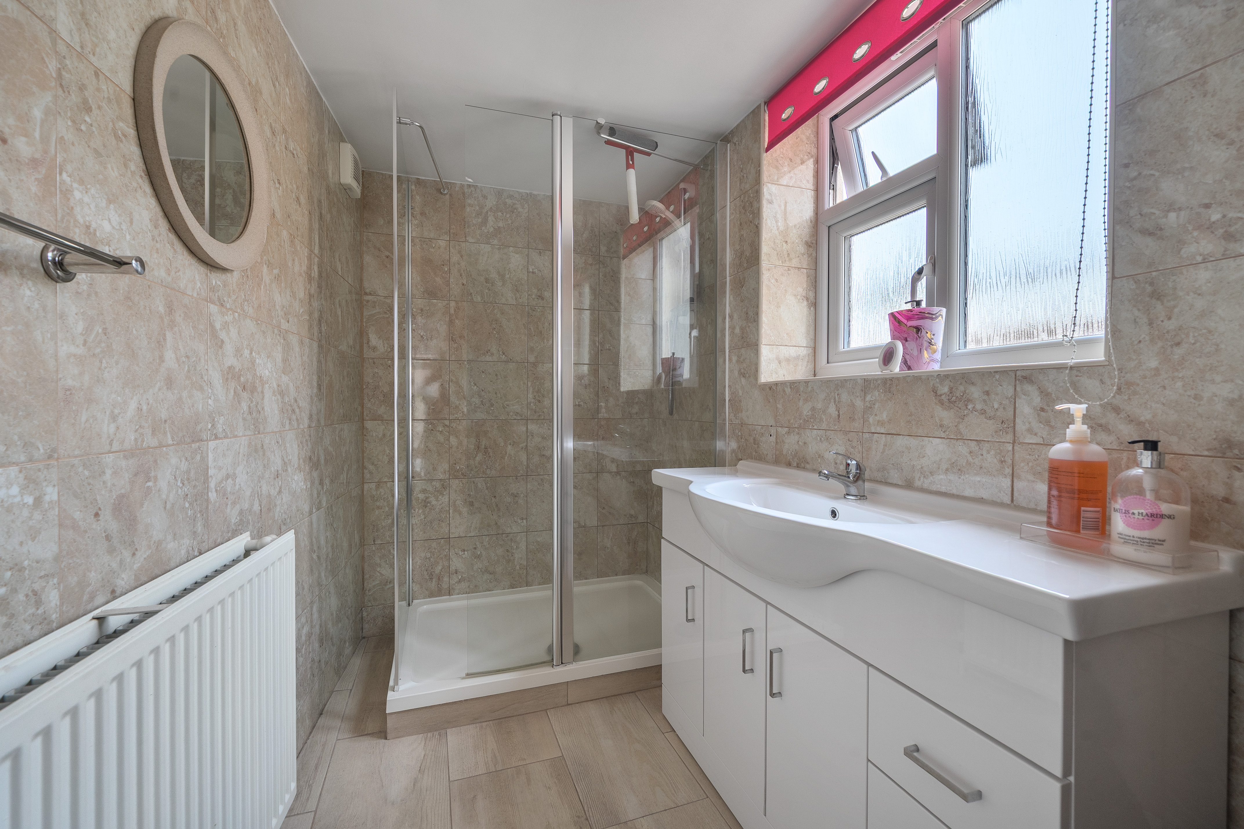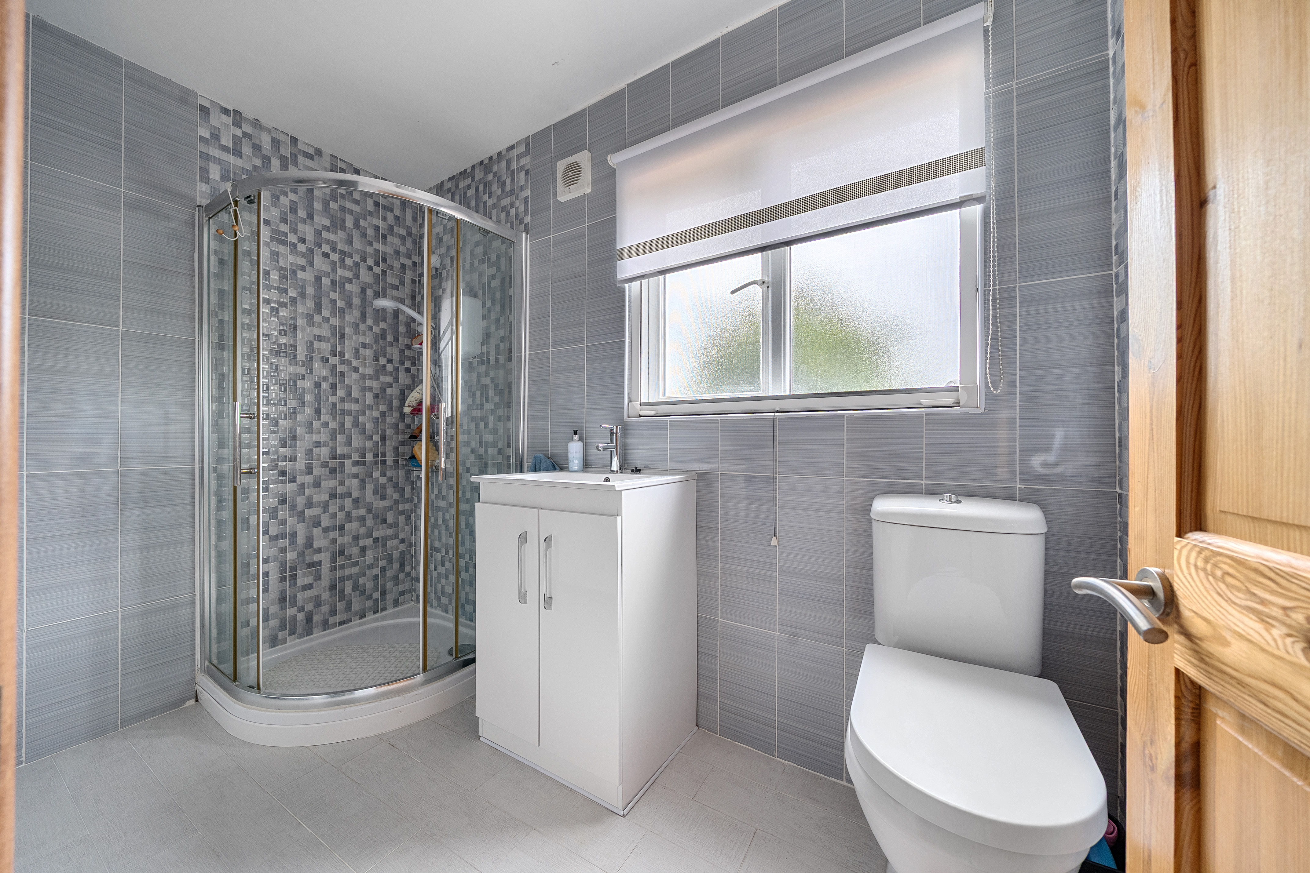 Adjacent to the kitchen is a rear porch and additional storage area, currently used as a utility space, with direct access to the garden. A ground floor shower room is also tucked away here, complete with a walk-in shower – ideal for guests or busy family mornings.