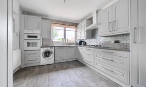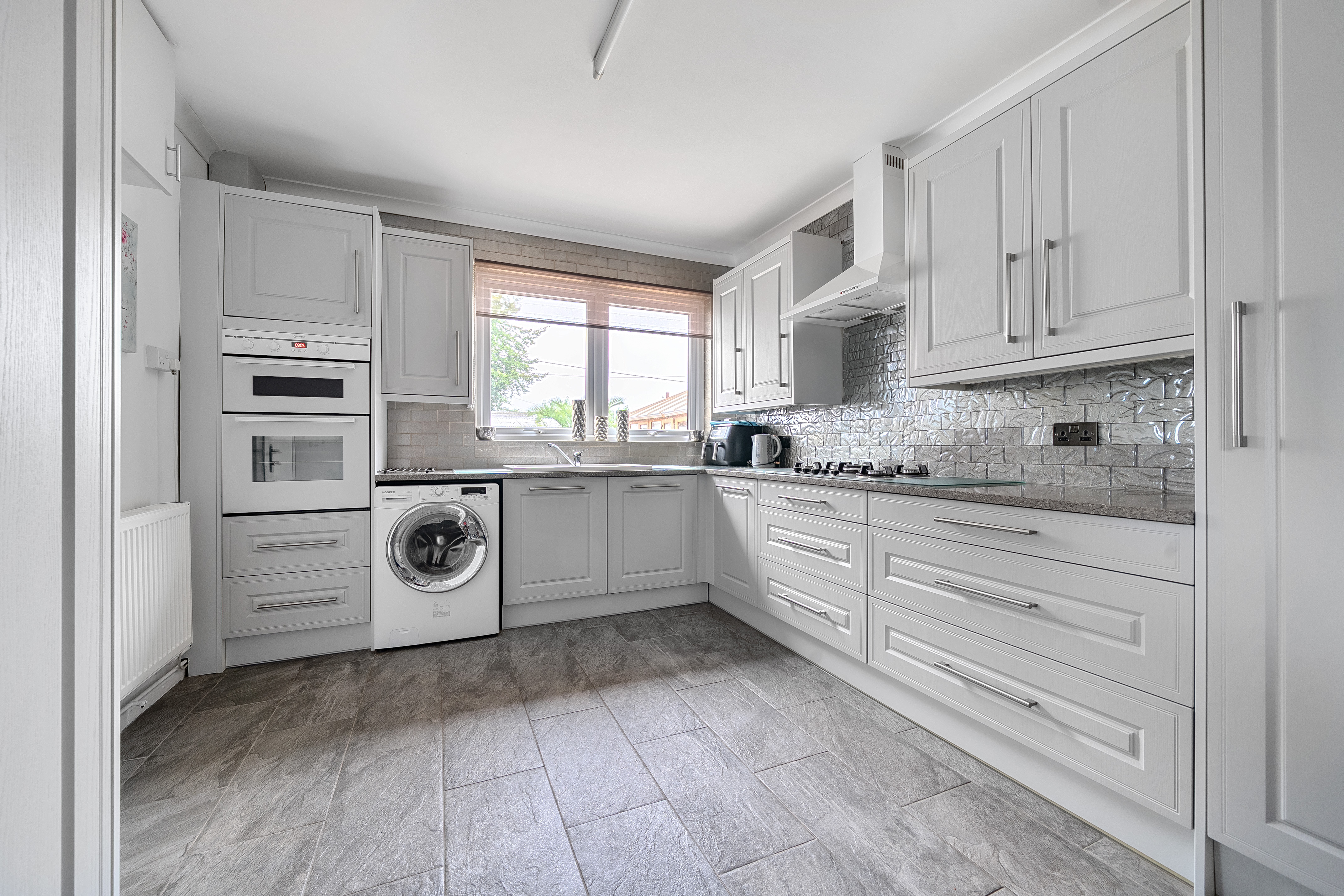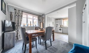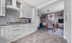 Further along the hallway, you'll find the contemporary kitchen/diner – fitted with modern grey shaker-style cabinetry, elegant quartz worktops, and integrated appliances including oven, hob, and dishwasher. Stone-effect tiled flooring adds a practical finish, while there’s also room for freestanding appliances. The dining area is carpeted in neutral tones and provides ample space for a family table and chairs.