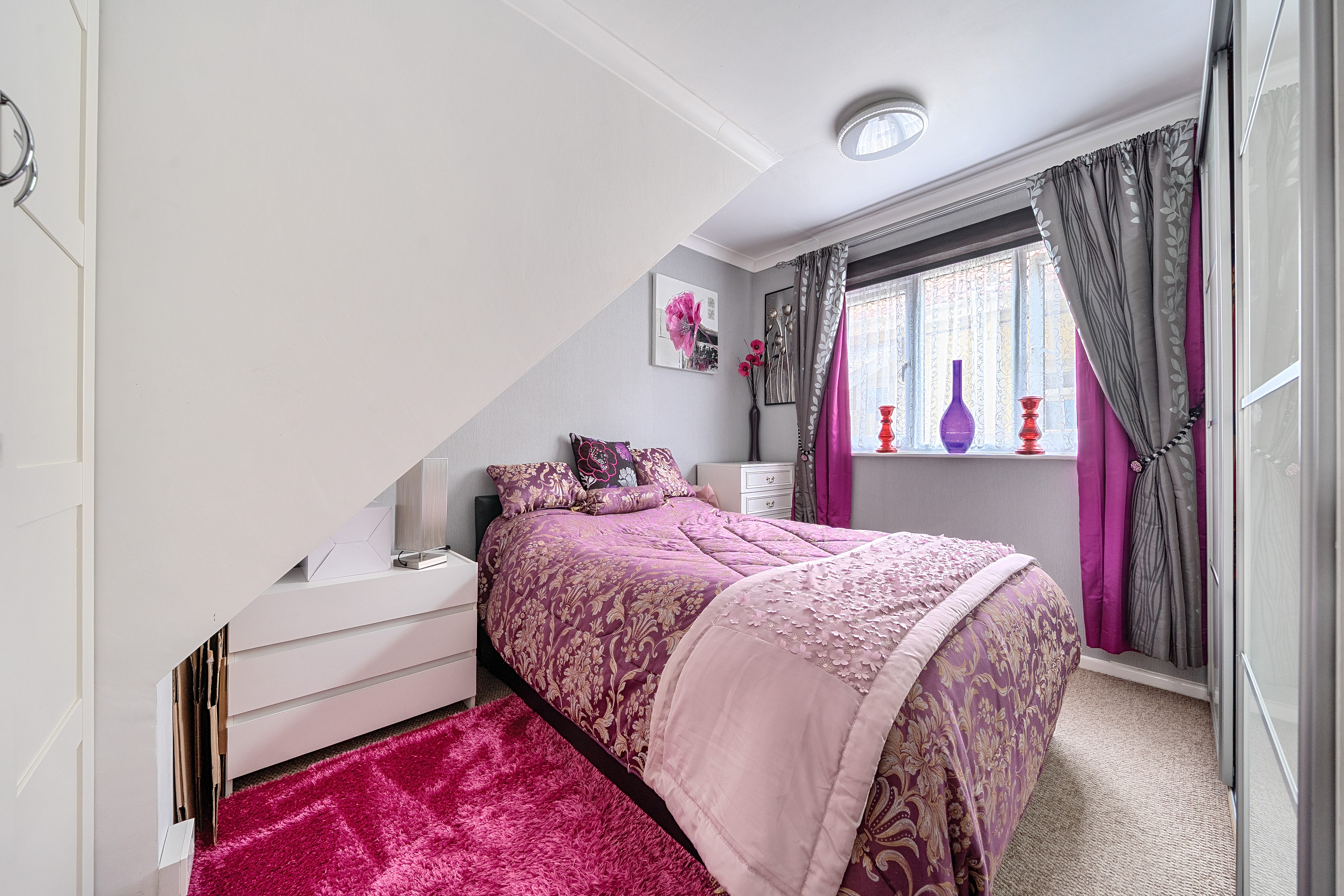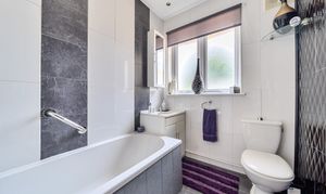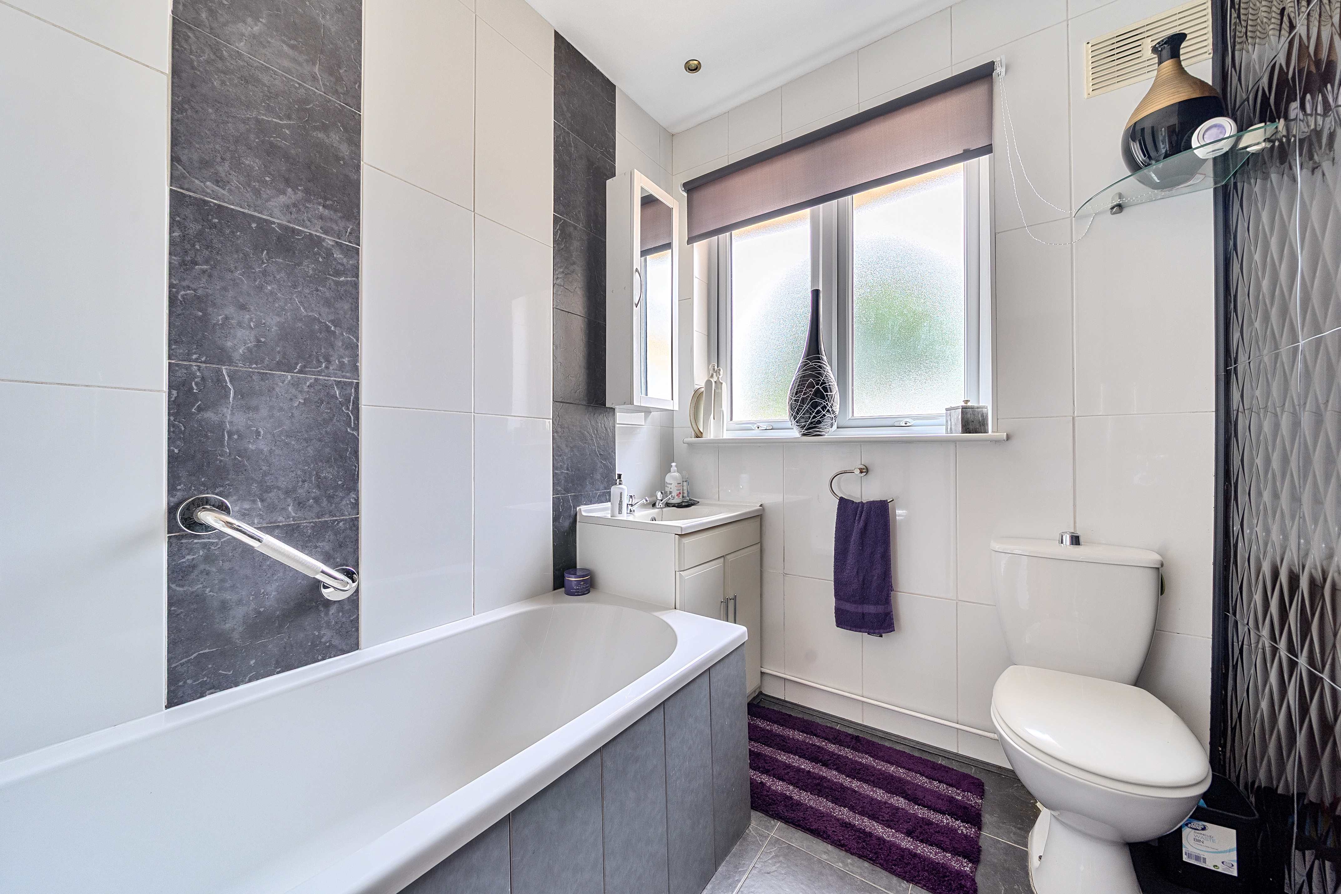 To the right of the hallway, there are two good-sized double bedrooms on the ground floor, both with space for freestanding wardrobes. The front bedroom also features a character bay window with acoustic glazing and a decorative fireplace that could be reinstated as a log burner, if desired. A stylish family bathroom is also located on this floor, fitted with a classic white suite and finished with a smart mix of stone-effect, white, and black tiling.