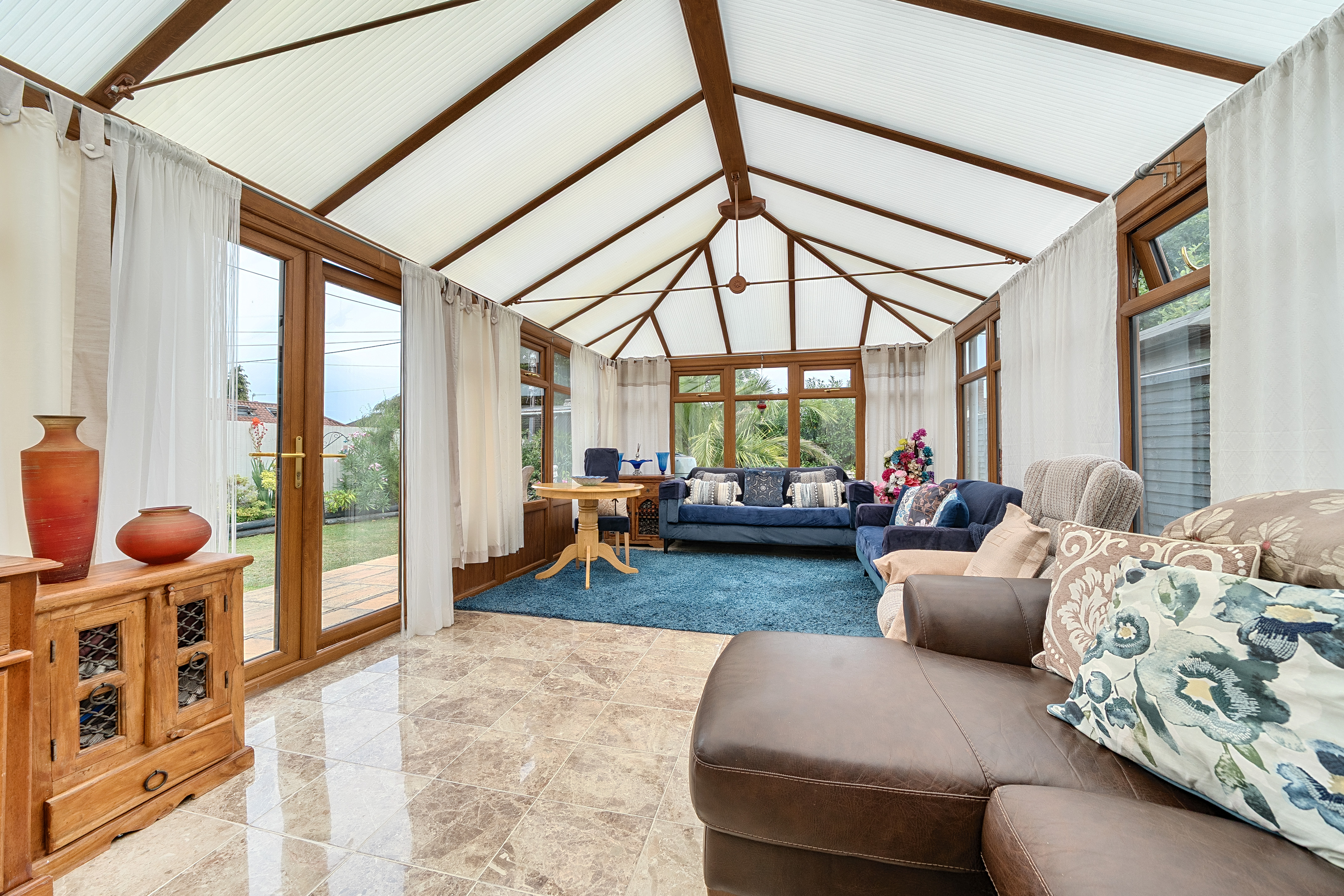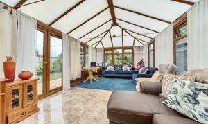 One of the home’s standout features is the second reception room, an impressive 22ft in length – a fantastic space for entertaining, with another multi-fuel burner as a focal point. A few steps lead down to the conservatory, which offers yet another generous living area filled with natural light, with French doors opening directly to the rear garden.