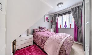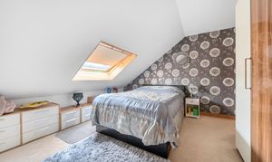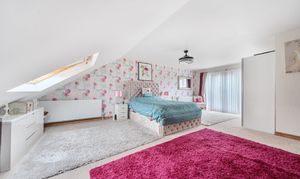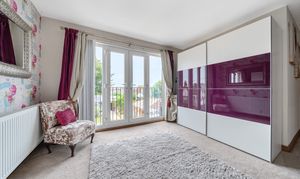 Upstairs there are two further double bedrooms and a third bathroom. The dual-aspect main bedroom is particularly spacious, with ample room for wardrobes and furniture, and potential for fitted storage. French doors open onto a Juliet balcony, complemented by a Velux window, creating a bright and airy feel. The second upstairs bedroom also accommodates a double bed and freestanding furniture comfortably. Serving both rooms is a sleek shower room with walk-in enclosure, basin with under-unit storage, and WC.