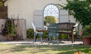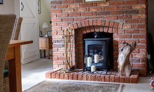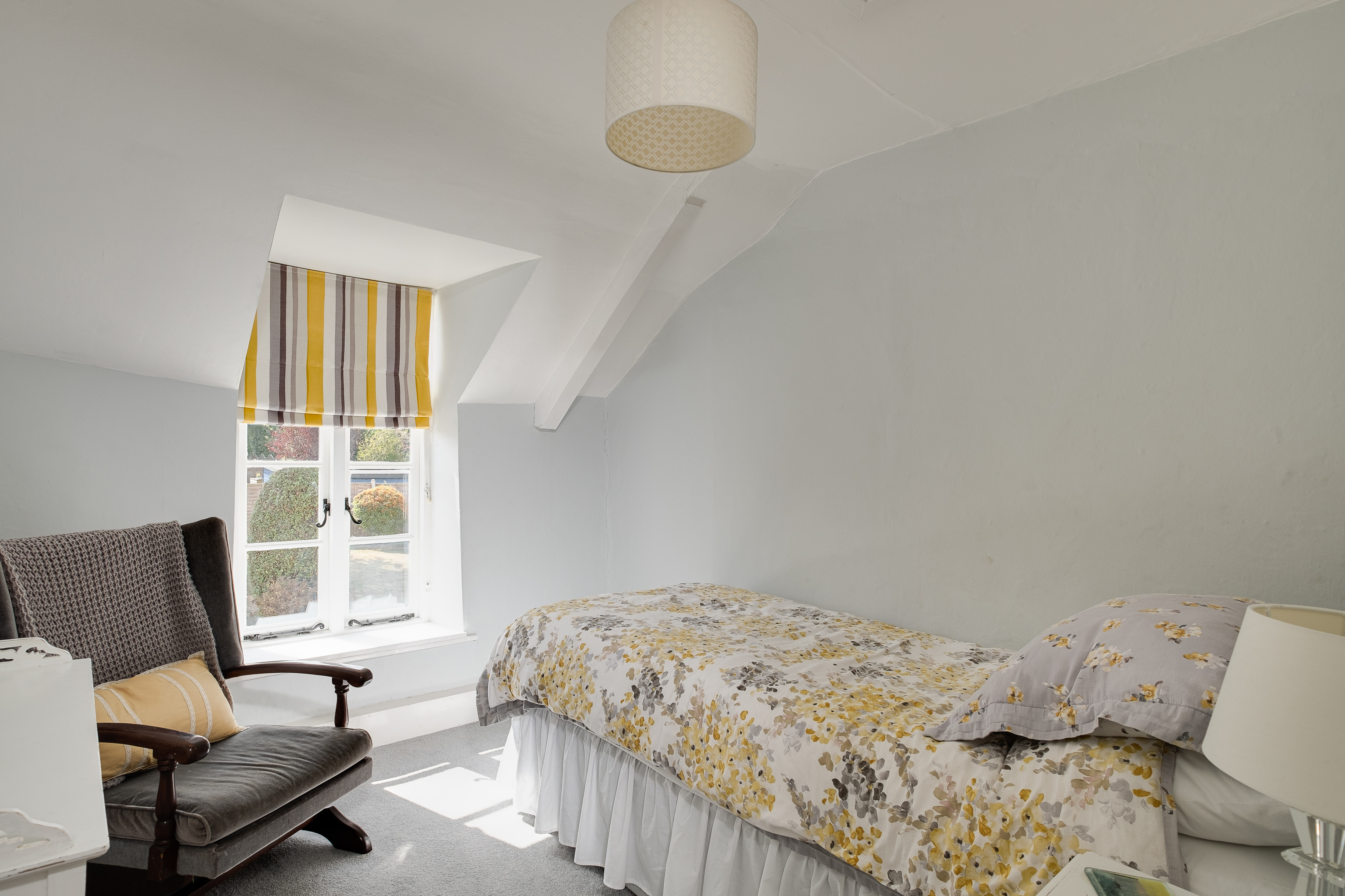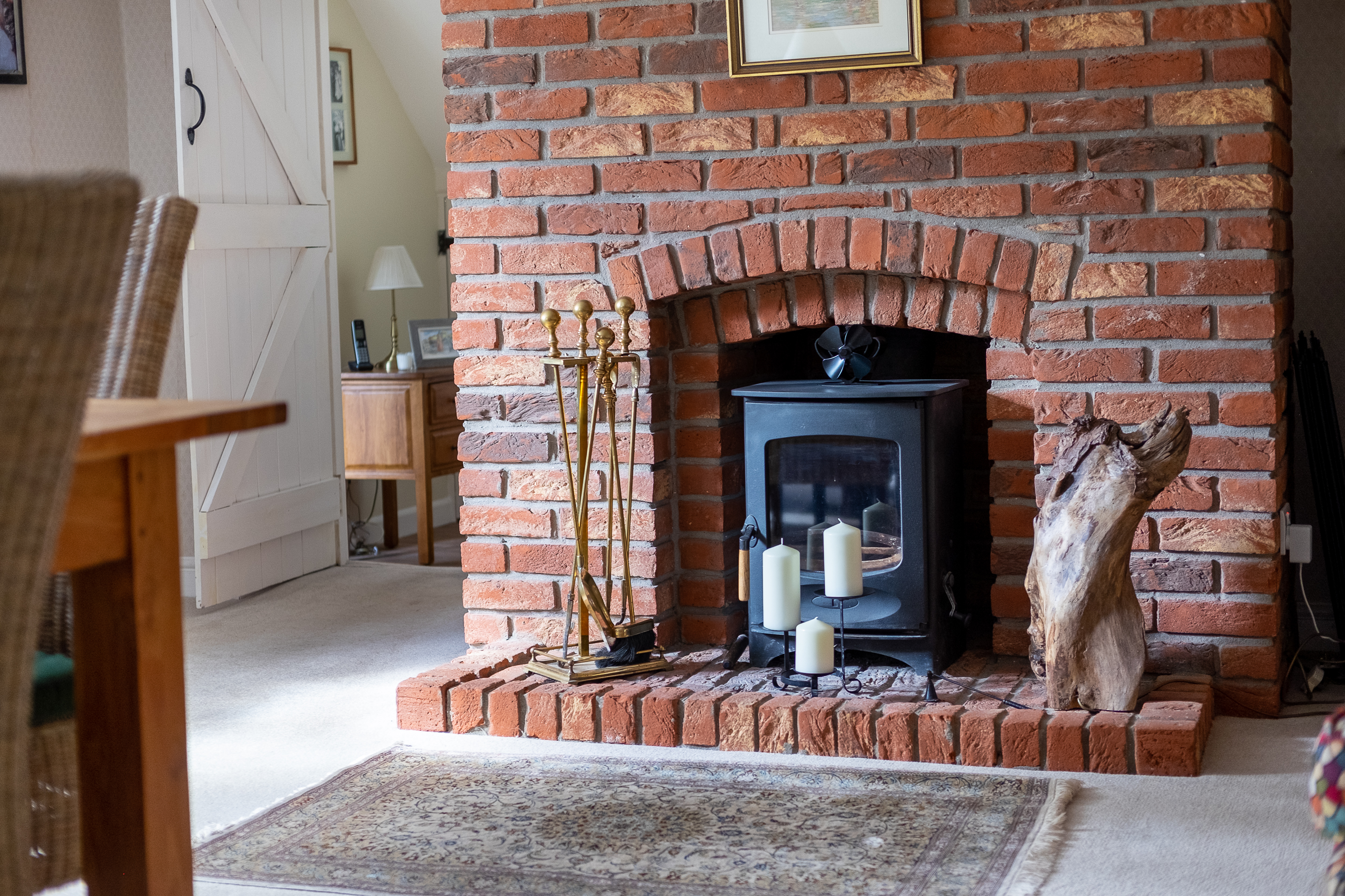 The dual aspect sitting room is another highlight of Orchardside, accessed either from the utility hallway or through an arch from the dining room. Double wooden latched doors open into the wonderful room with painted beamed ceiling, an open fireplace with stone surround and wooden mantel and a flagstone hearth. Light pours in through the 4 windows, all of which have wonderful views over the beautiful garden.