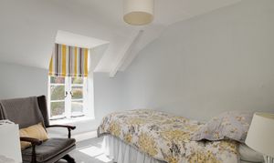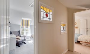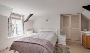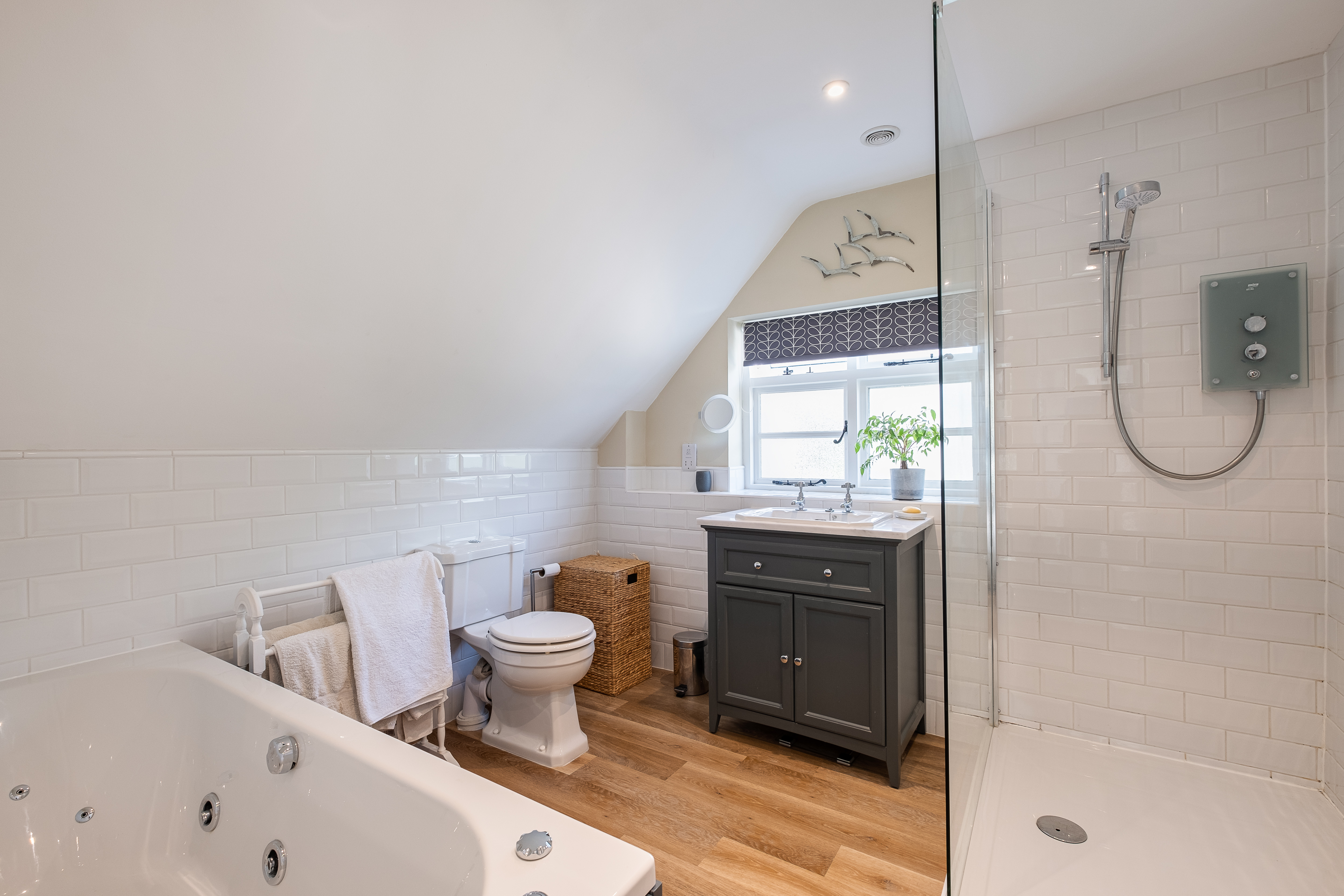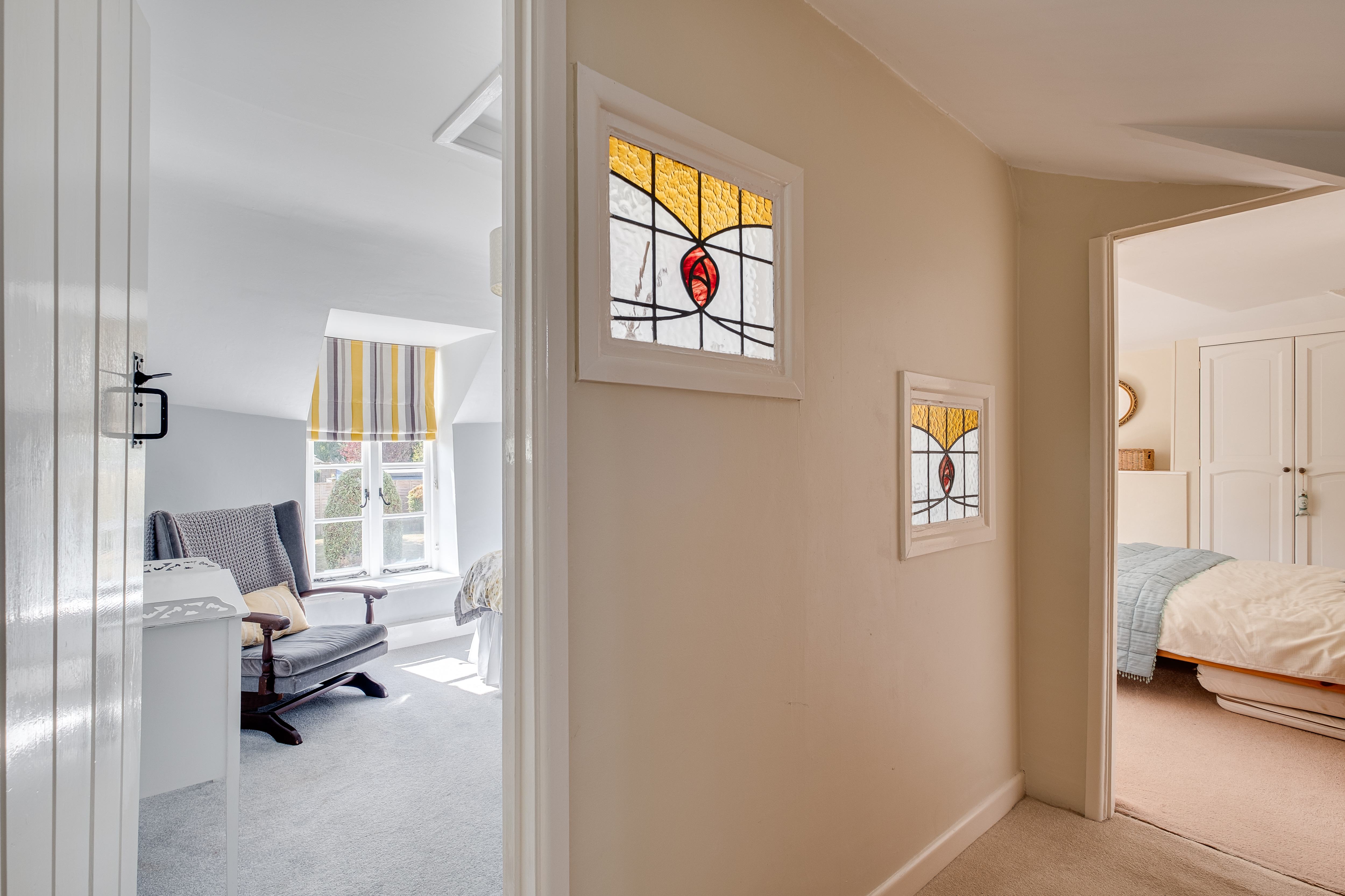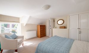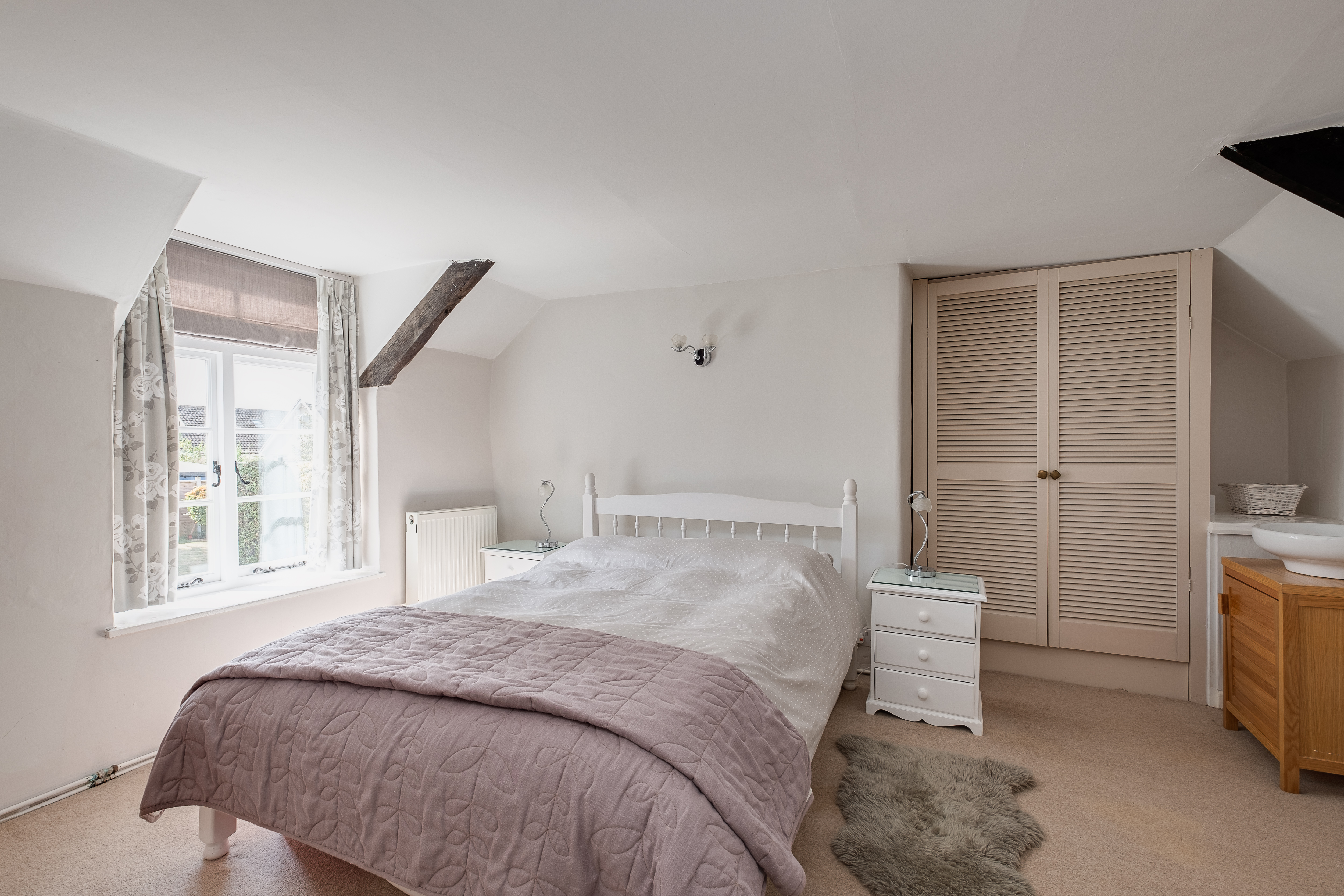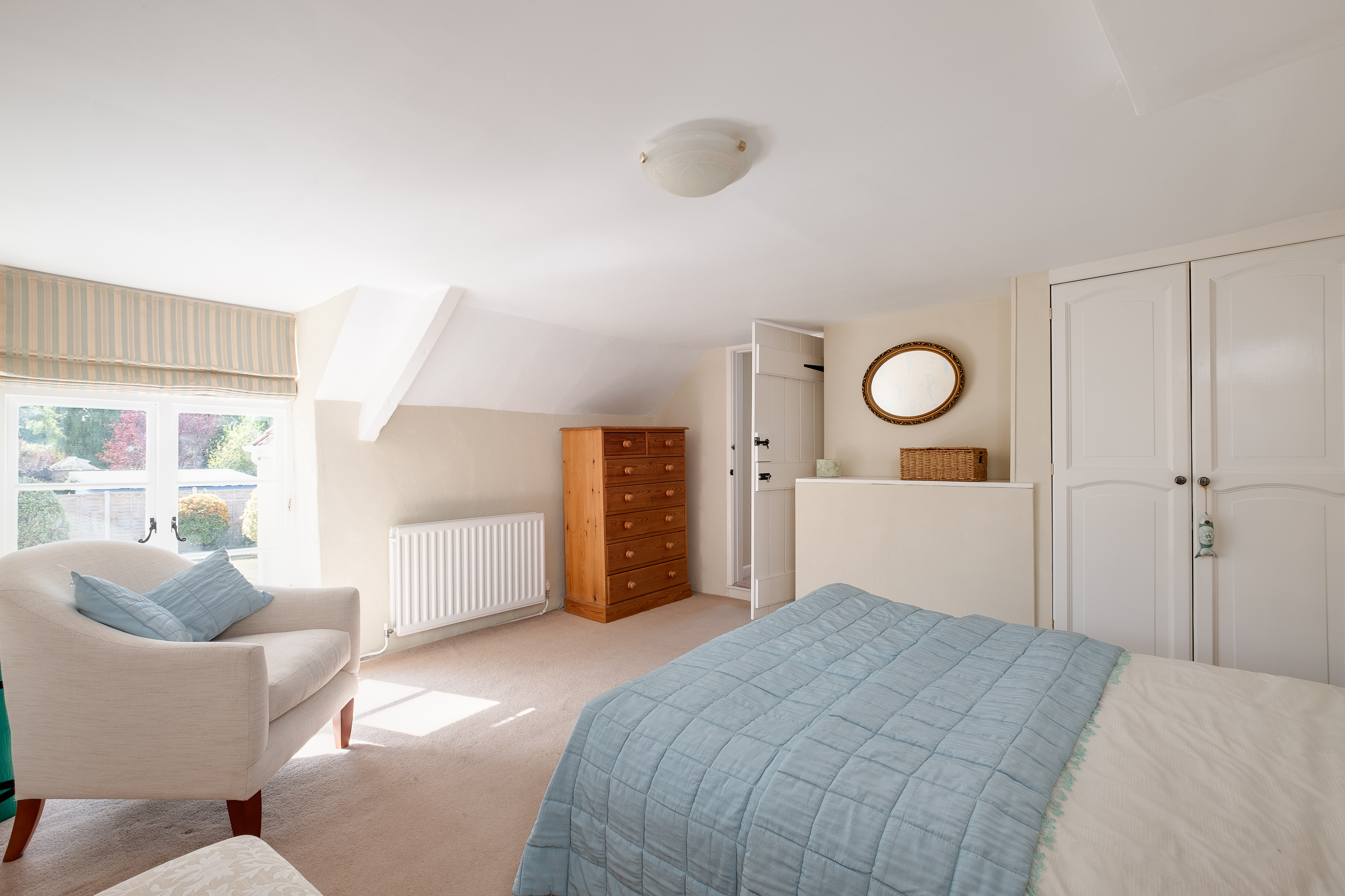 Upstairs there are 5 bedrooms and 2 stylish bathrooms. The spacious double aspect principal bedroom is fitted with a good range of integrated wardrobes and a pretty window seat and is wonderfully light and airy, with 3 large windows overlooking the garden. Nearby is an elegant bathroom with white metro tiles, a free-standing “jet” bath and large walk-in shower enclosure. There are 3 further double bedrooms and a good sized single bedroom, many with exposed beams, in addition to a stylish family bathroom.