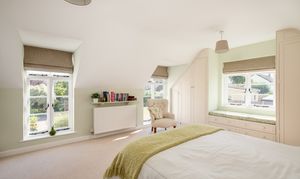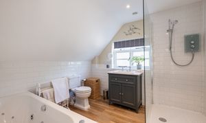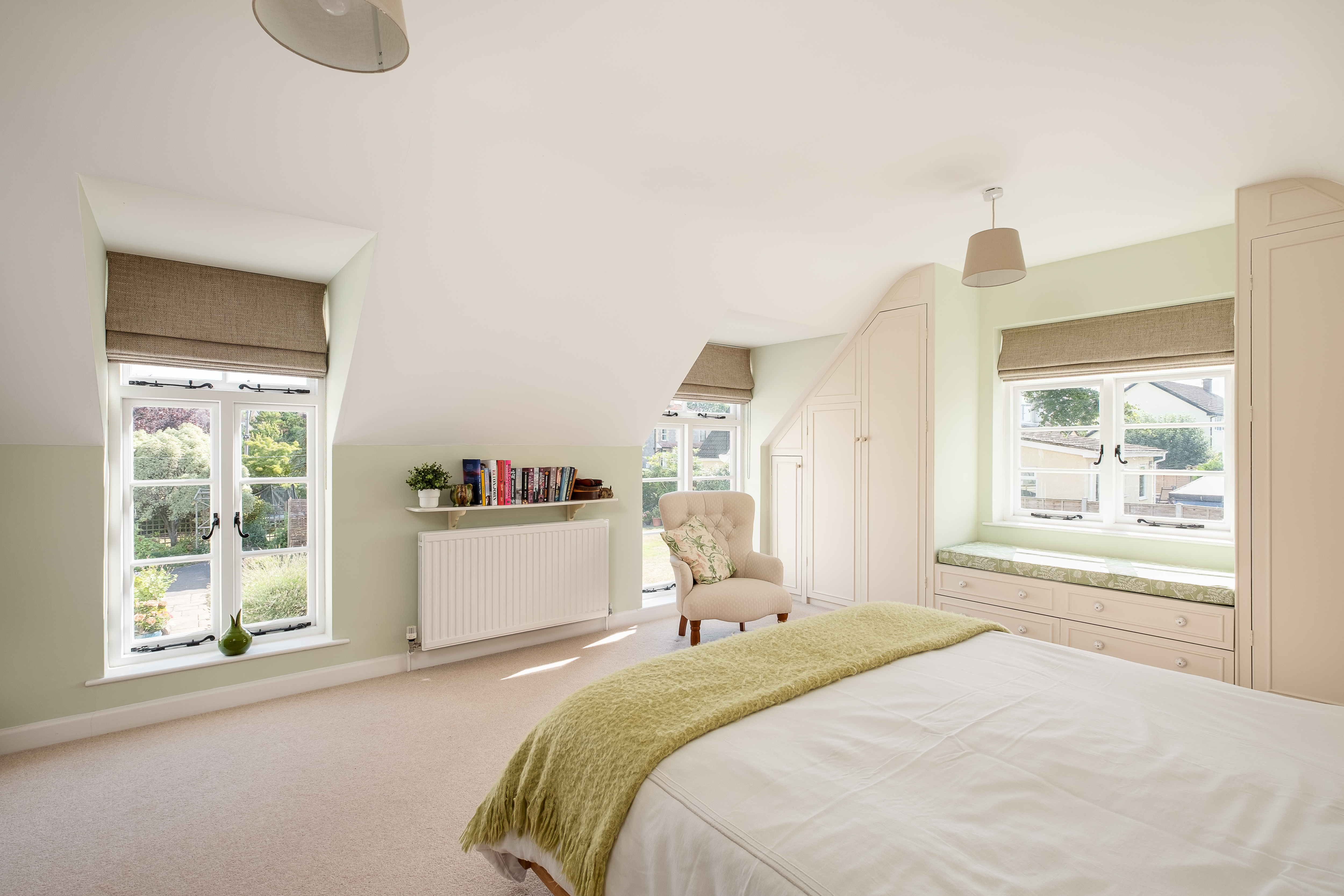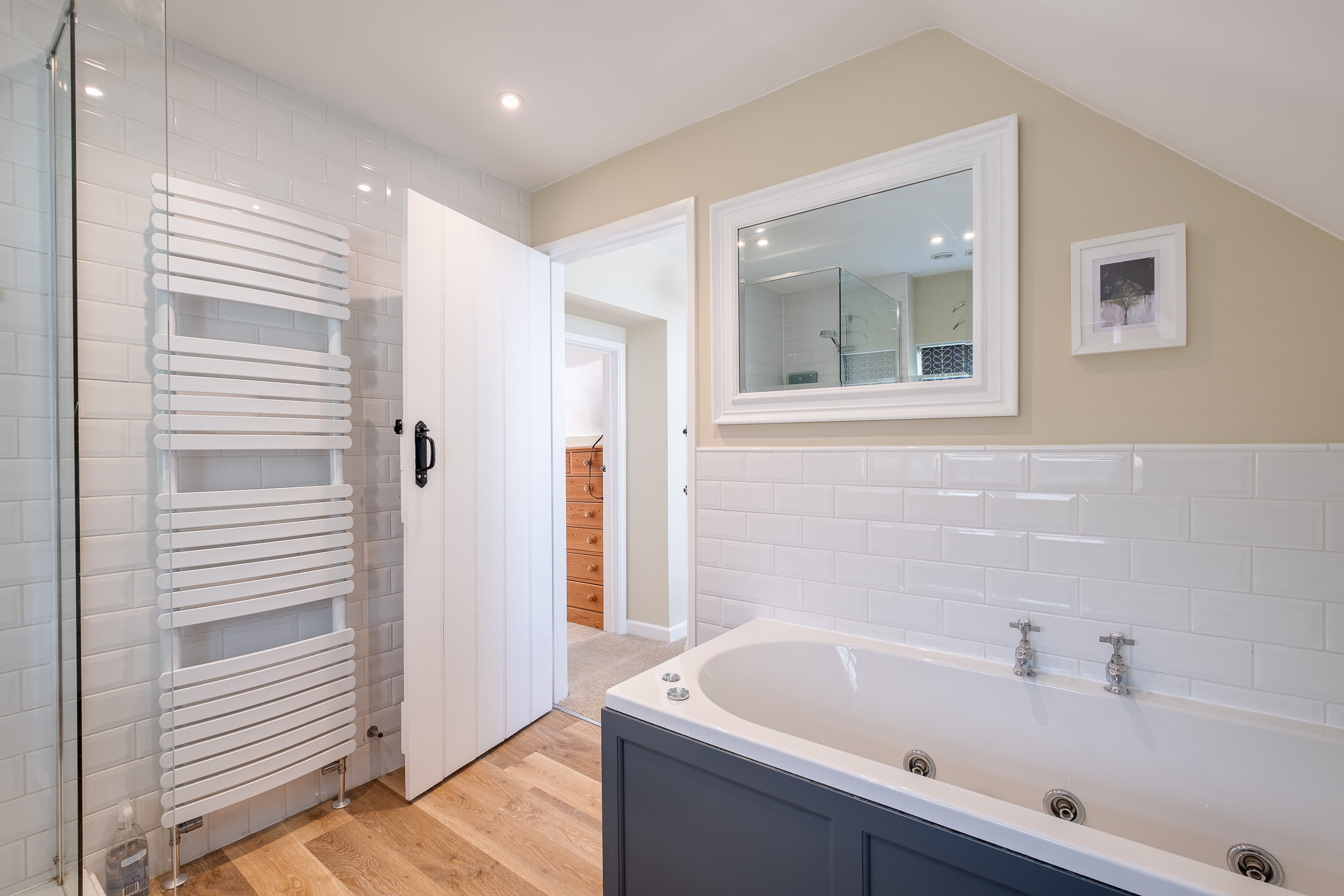 The superb dual aspect kitchen/breakfast room is a highlight of the property, fitted with an extensive range of hand-made wooden wall and base units with pull-out larder cupboards and deep pan drawers. Integrated appliances include a microwave oven and dishwasher, with space for a large range cooker and an American-style fridge/freezer. A polished chrome vertical radiator gives a contemporary feel, blending beautifully with the cottage-style kitchen door and latched internal wooden door.