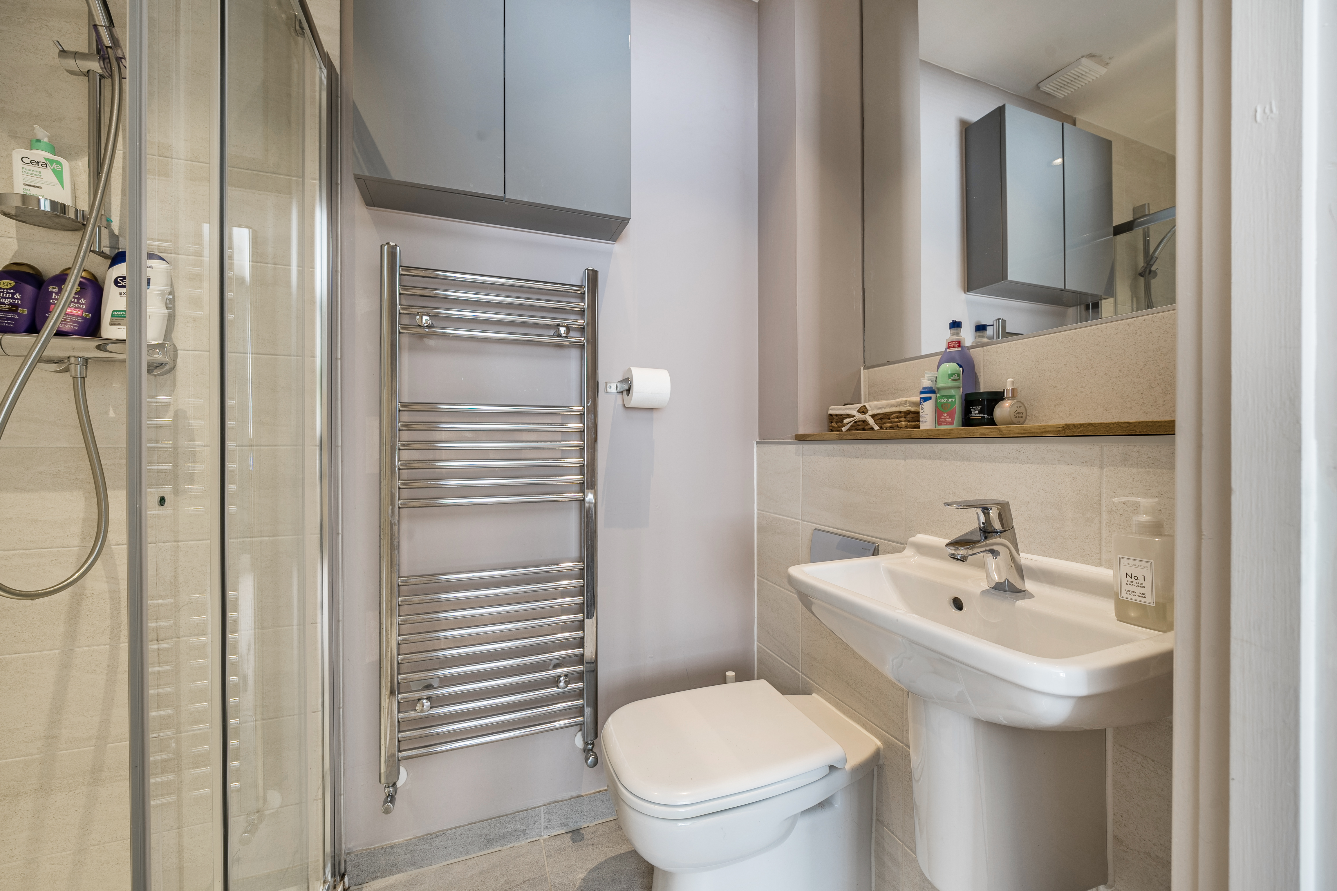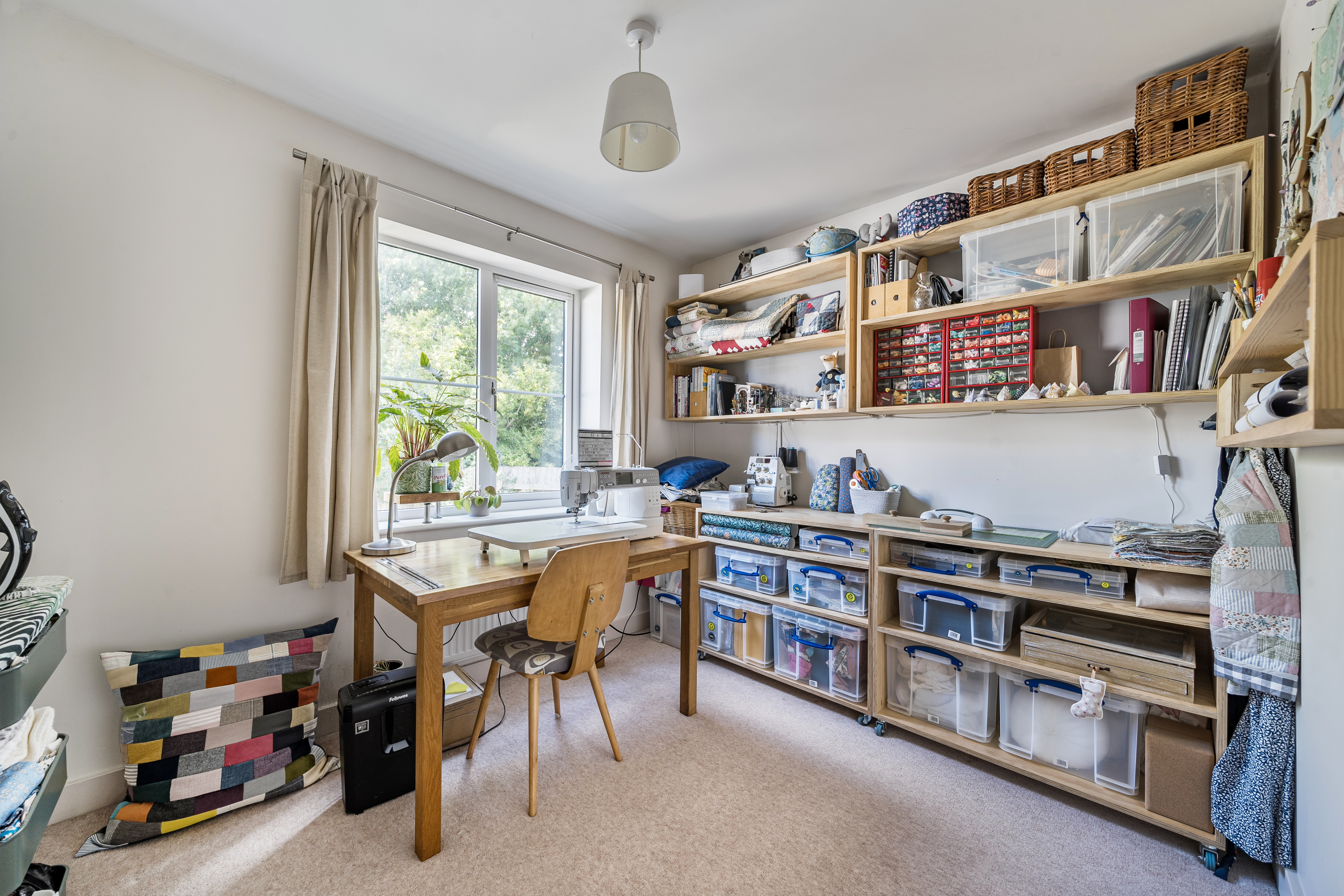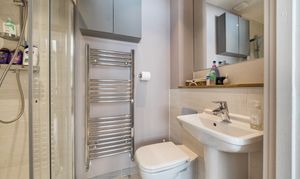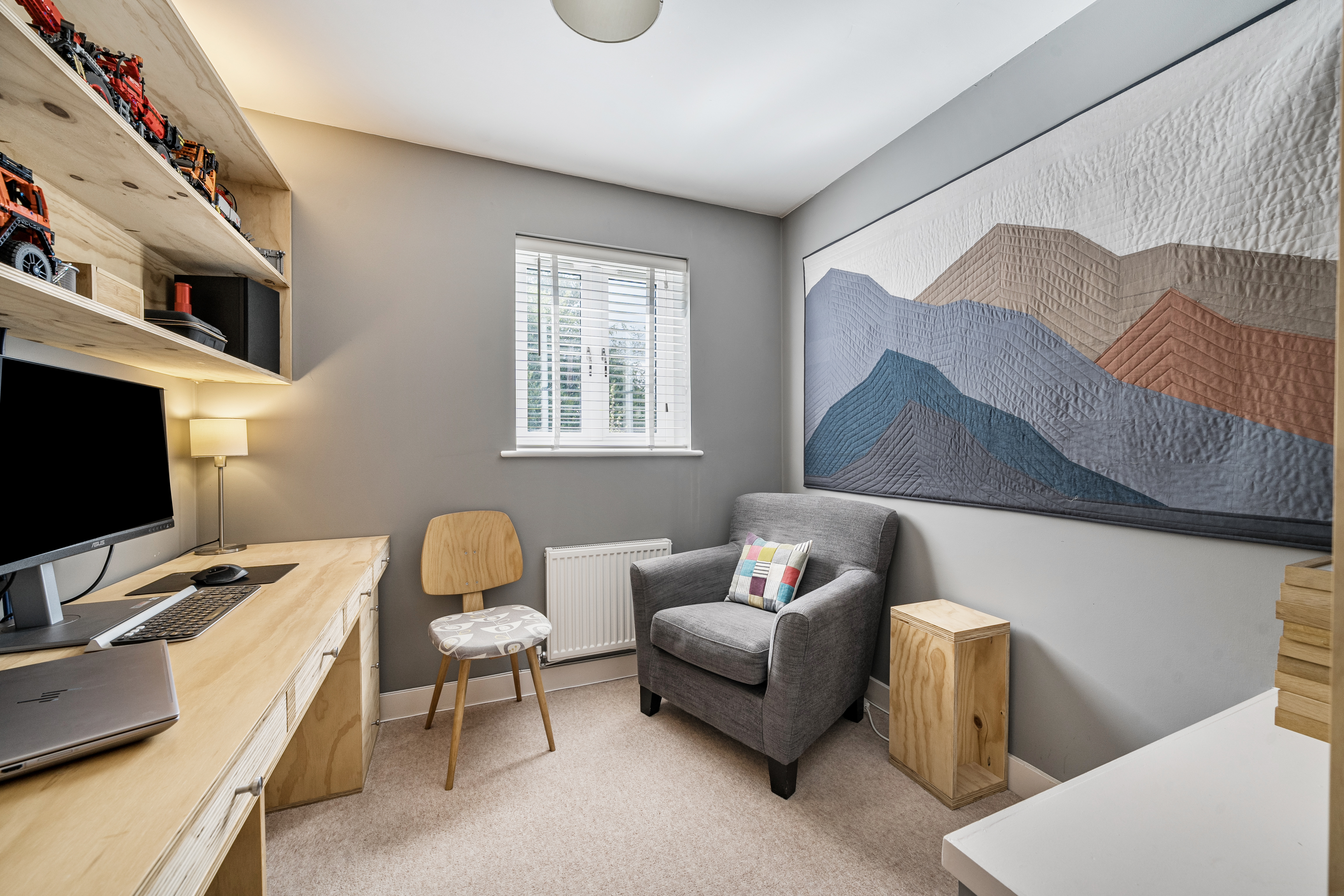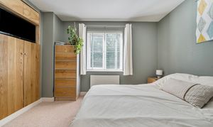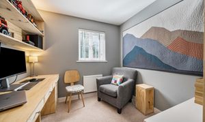 Upstairs, the property offers four well-proportioned bedrooms. Three are generous doubles, and the fourth is a good-sized single, ideal as a child’s room or home office. The principal bedroom benefits from sleek, fitted wardrobes with solid oak doors, space for a 32" TV, and a stylish en-suite shower room featuring a modern white suite with a large shower cubicle and Hansgrohe fittings. Habit 50mm custom-fit blackout blinds add further comfort and control.