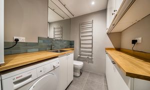 Directly ahead, a door leads to the utility room and downstairs WC, a well-planned space with plumbing for both a washing machine and tumble dryer, generous cupboard storage, and smart contemporary finishes. Practical elements such as a Bosch/Worcester boiler, Smart meters for gas and electricity, and LED lighting throughout support low running costs. Further energy-efficient features include double glazing, an insulated beam and block ground floor, additional loft insulation, and photovoltaic (PV) solar panels, all contributing to year-round comfort and energy efficiency.