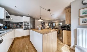 A solid oak worktop on the central island adds both warmth and functionality, providing additional prep space and a focal point for entertaining. The kitchen is completed with Blanco sinks and Hansgrohe taps, reflecting the quality throughout.