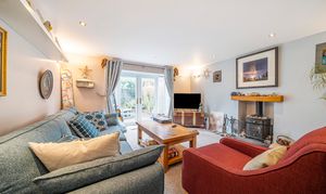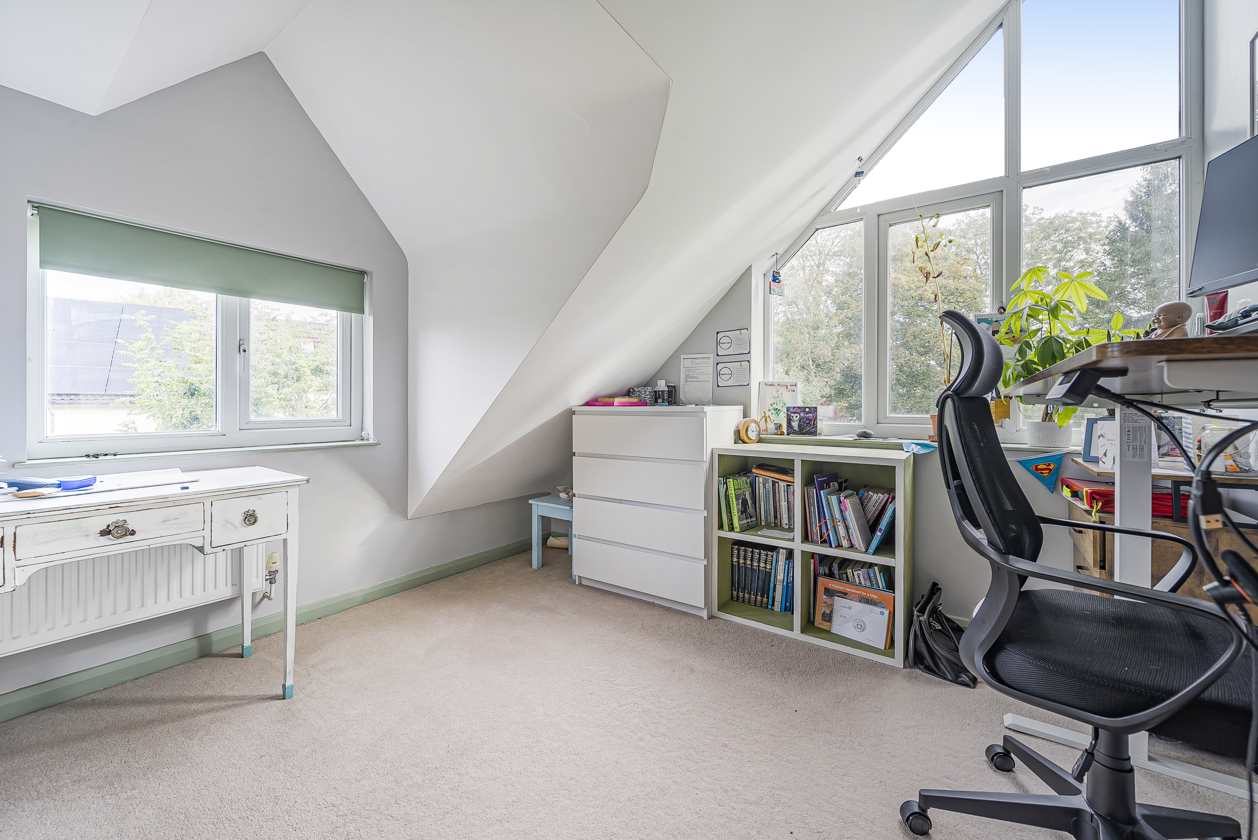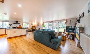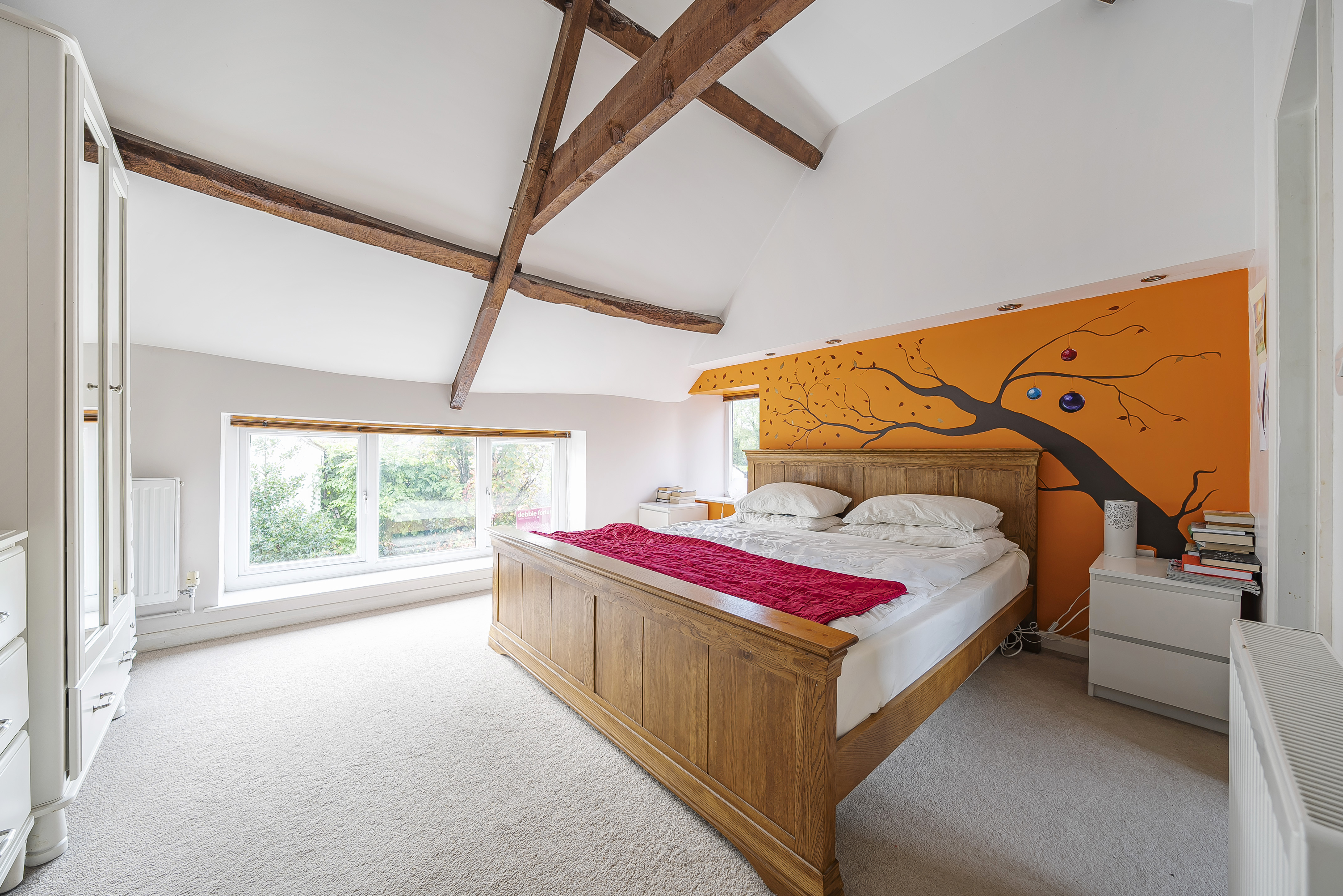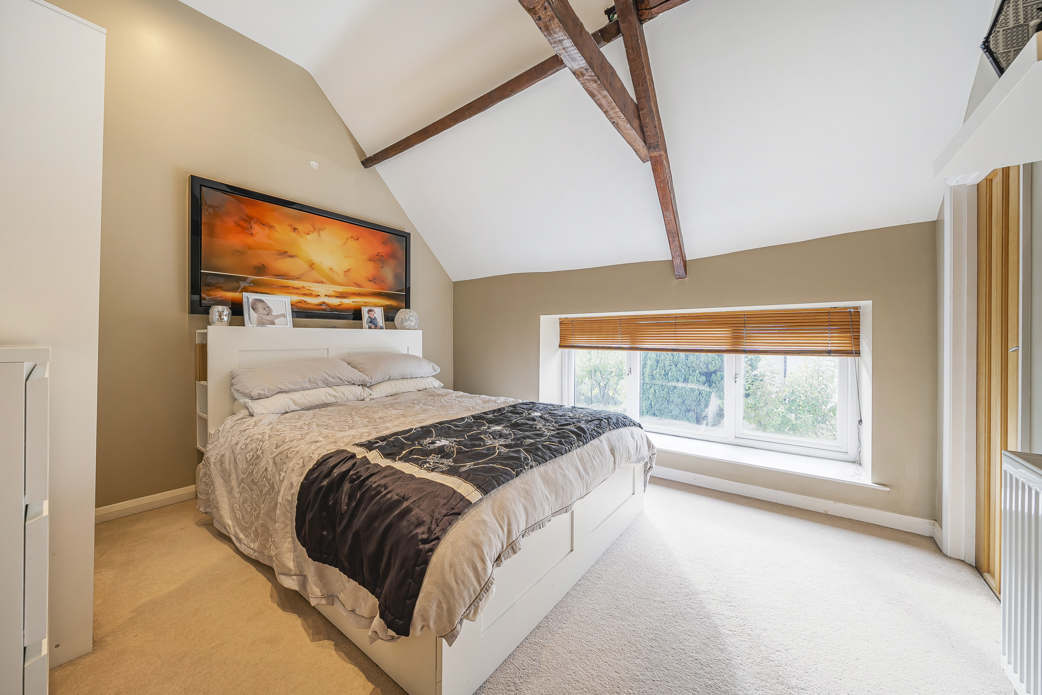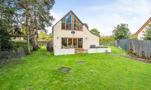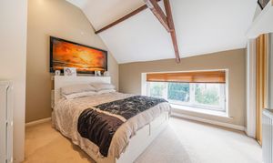 On the first floor, the landing connects to four double bedrooms and a family bathroom. Two exceptional bedrooms at the gable end feature vaulted ceilings and striking trapezoid windows that reach the apex, offering beautiful views of the garden. The third guest room is another good sized double, complete with feature beams and a stylish en-suite shower room. The luxurious principal bedroom boasts a dramatic vaulted ceiling, dual aspect windows for plenty of light, and a chic en-suite shower room. The family bathroom, like the rest of the home, is tastefully finished in neutral tones with quality fixtures and fittings.