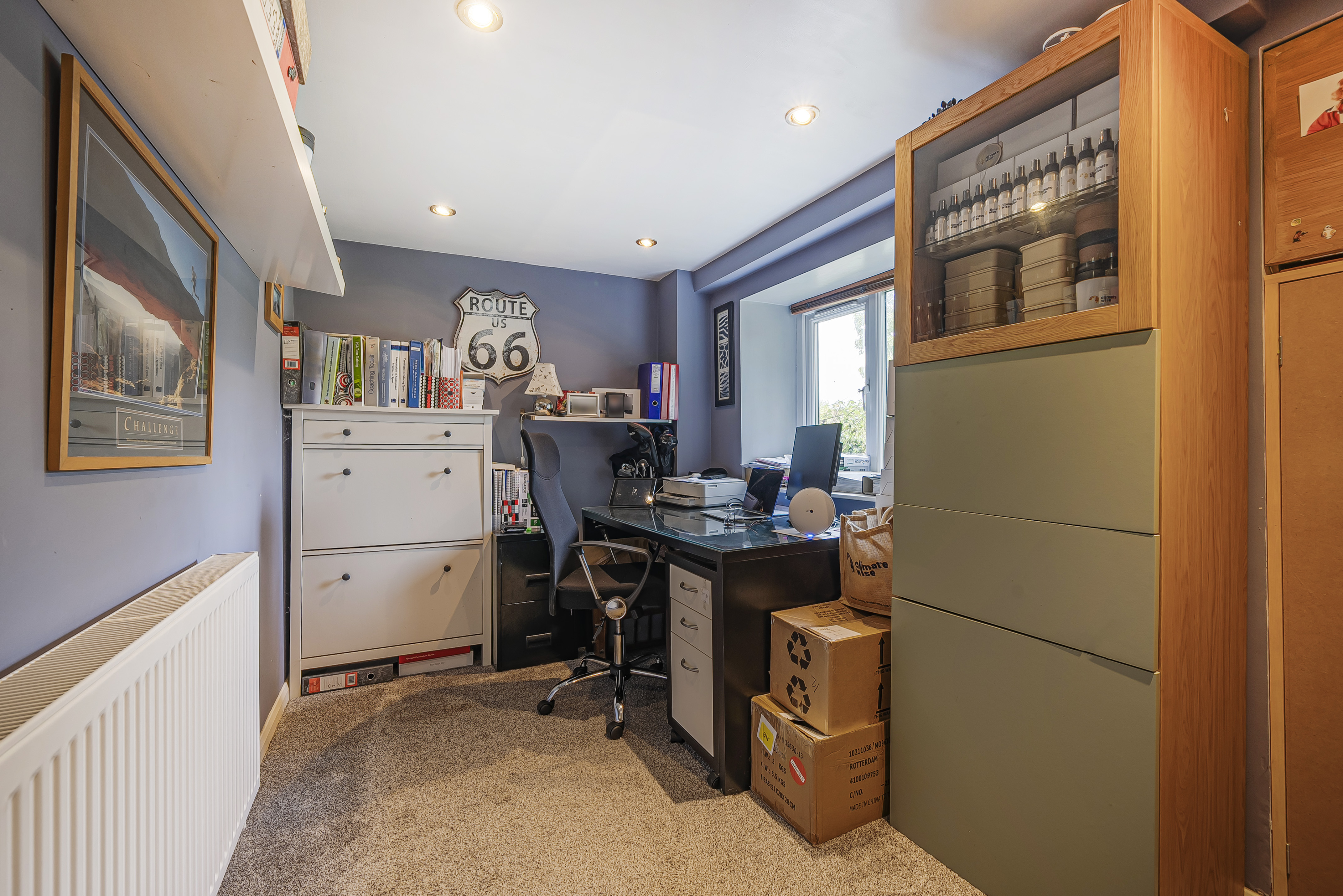 The property is accessed via a well-maintained gravel driveway, providing ample off-street parking for several vehicles. A shiplap fence encloses the front garden, with a pathway leading to the entrance. Upon entering the reception hallway which has a smart engineered oak floor, you’ll find a cupboard on the right for coats and shoes and immediately beyond the study which has built in storage and a with a view to the front.