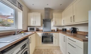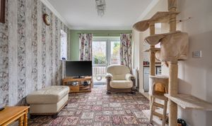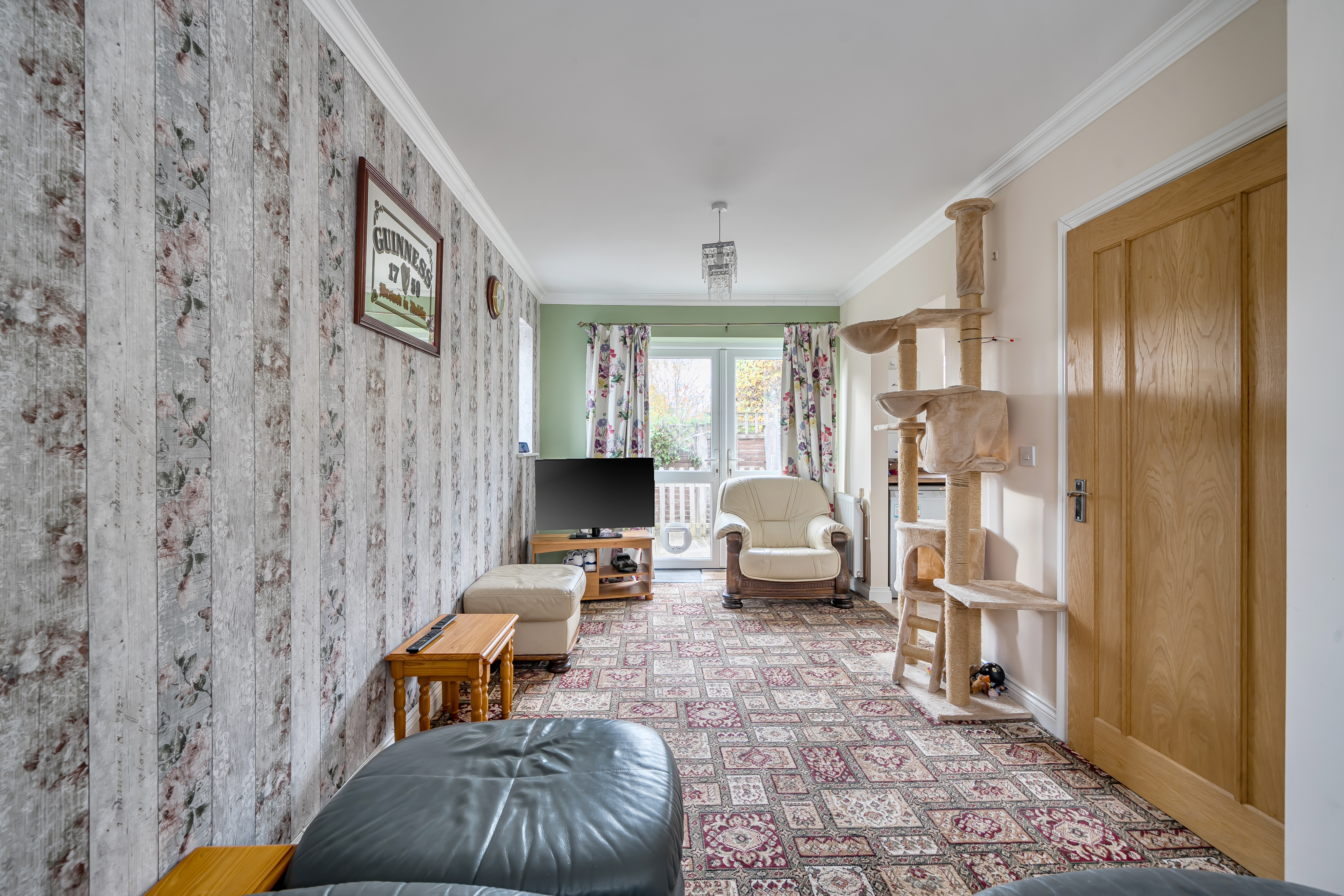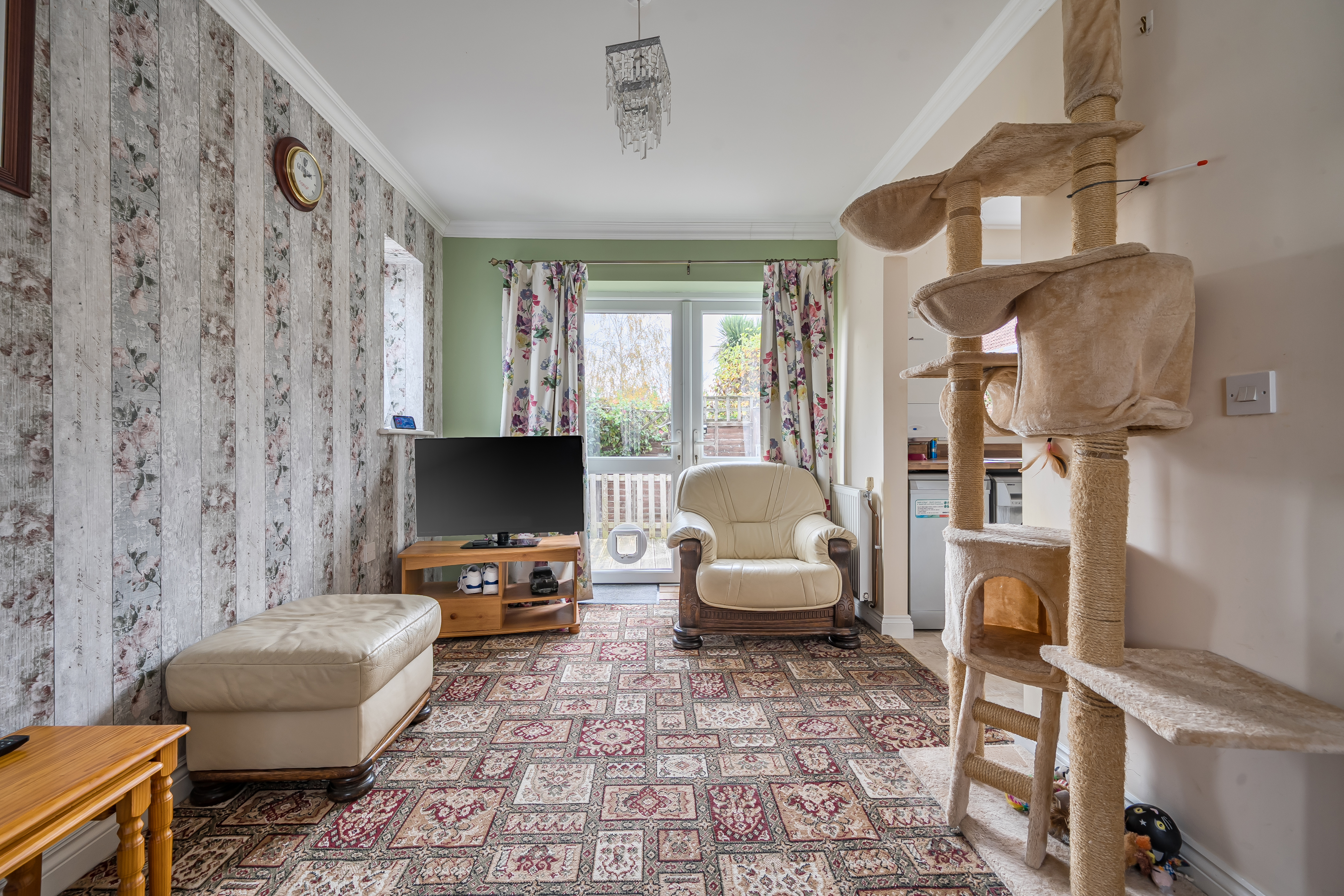 The hallway then leads into the main reception space, which runs the full depth of the property. The sitting area at the front enjoys an open outlook, while the rear dining area features French doors that allow natural light to flood in and provide direct access to the garden, a perfect spot for alfresco dining or summer barbecues. Off the reception is the bright and welcoming kitchen, overlooking the rear garden and fitted with a good range of wall and base shaker style units, integrated oven, electric hob, extractor fan, and space for a washing machine, dishwasher and full-height fridge freezer.