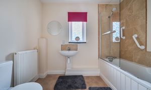 The bedrooms are served by a modern bathroom fitted with a panelled bath and overhead shower with glass screen, complemented by a WC and tiled splashbacks, perfectly suited to everyday living.