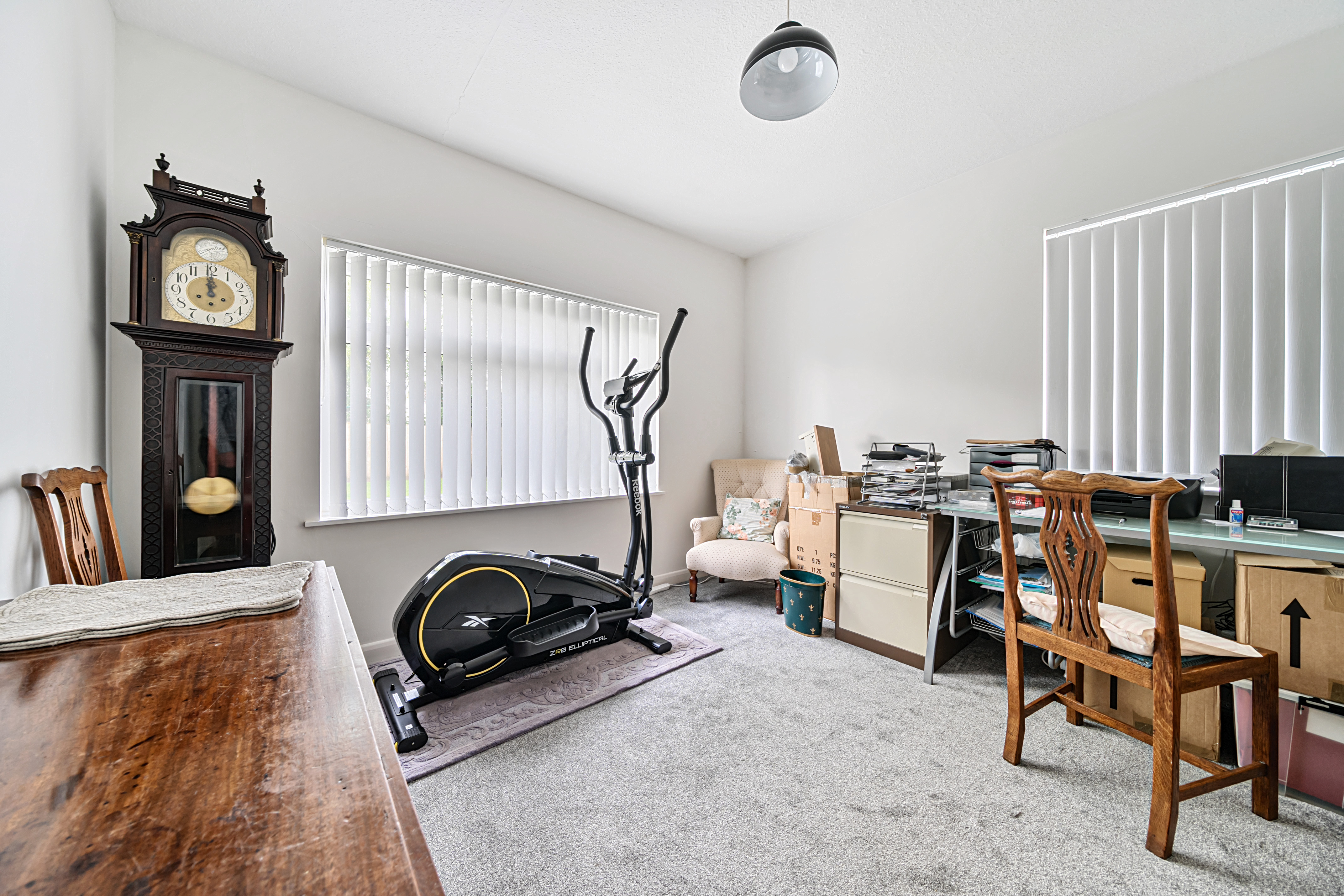 A spacious glazed entrance porch with room for coats and shoes opens to the welcoming hallway. Immediately to the left is a fully tiled bathroom with bath and w.c. and to the right a reception room with a pleasant dual aspect overlooking the gardens, currently arranged as an office, it could also be used as bedroom 3. Behind, the main sitting room with a traditional fireplace with electric fire. Again, this has lovely large windows overlooking the garden which make it a very light, bright and welcoming space.