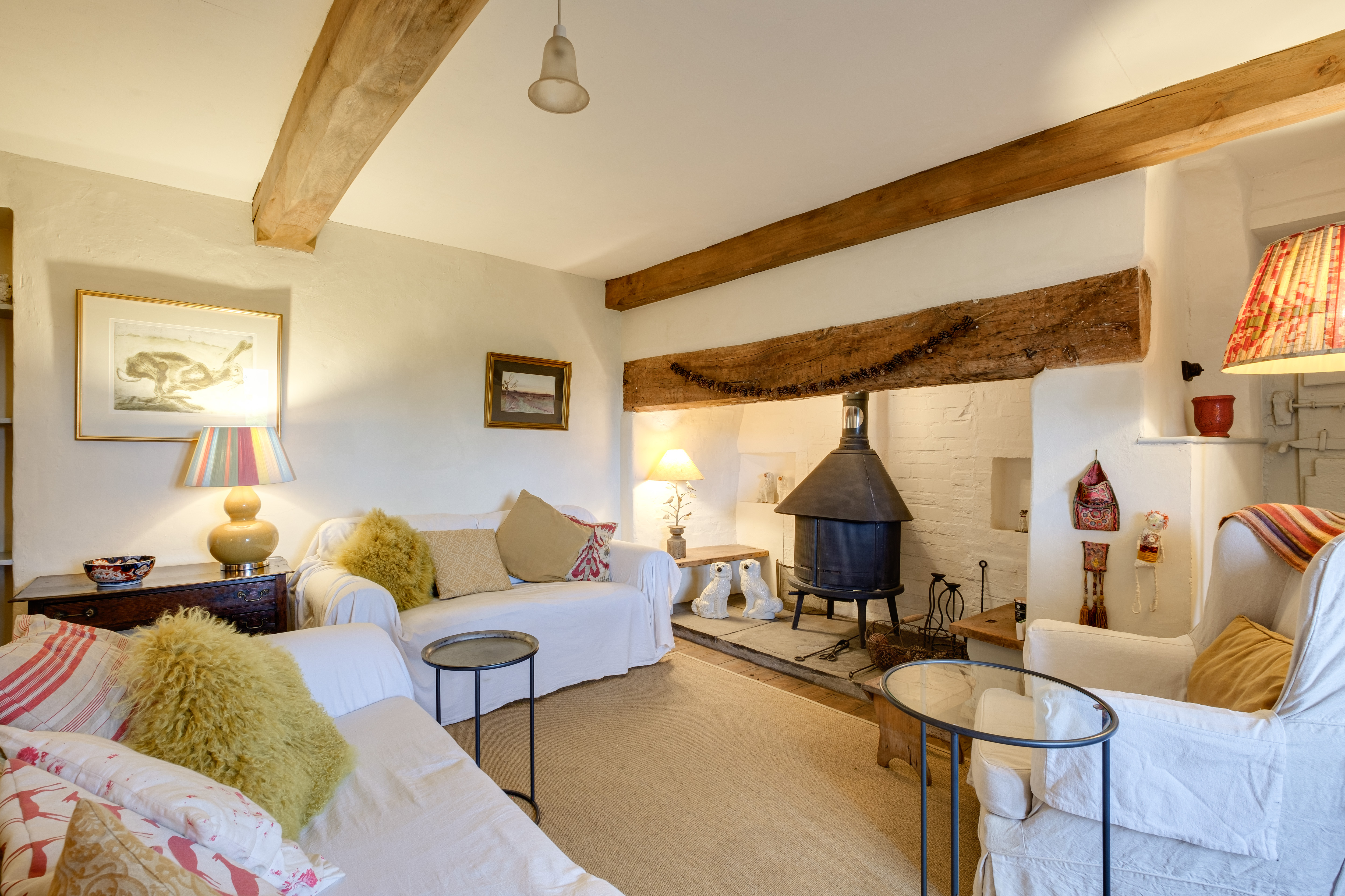 A gate and pathway through the gardens lead straight to a lovely storm porch with space for coats and shoes and a first glimpse of one of the many features that make Wellhouse Farm one of a kind. A magnificent, studded door opens into a welcoming hallway with flagstone flooring. To the right the sitting room has a beamed ceiling, an inglenook fireplace with stone hearth and attractive Jotul log burner, in-built bookshelves and recessed windows with bench seats allowing you to take in the far-reaching views toward the Bristol Channel.